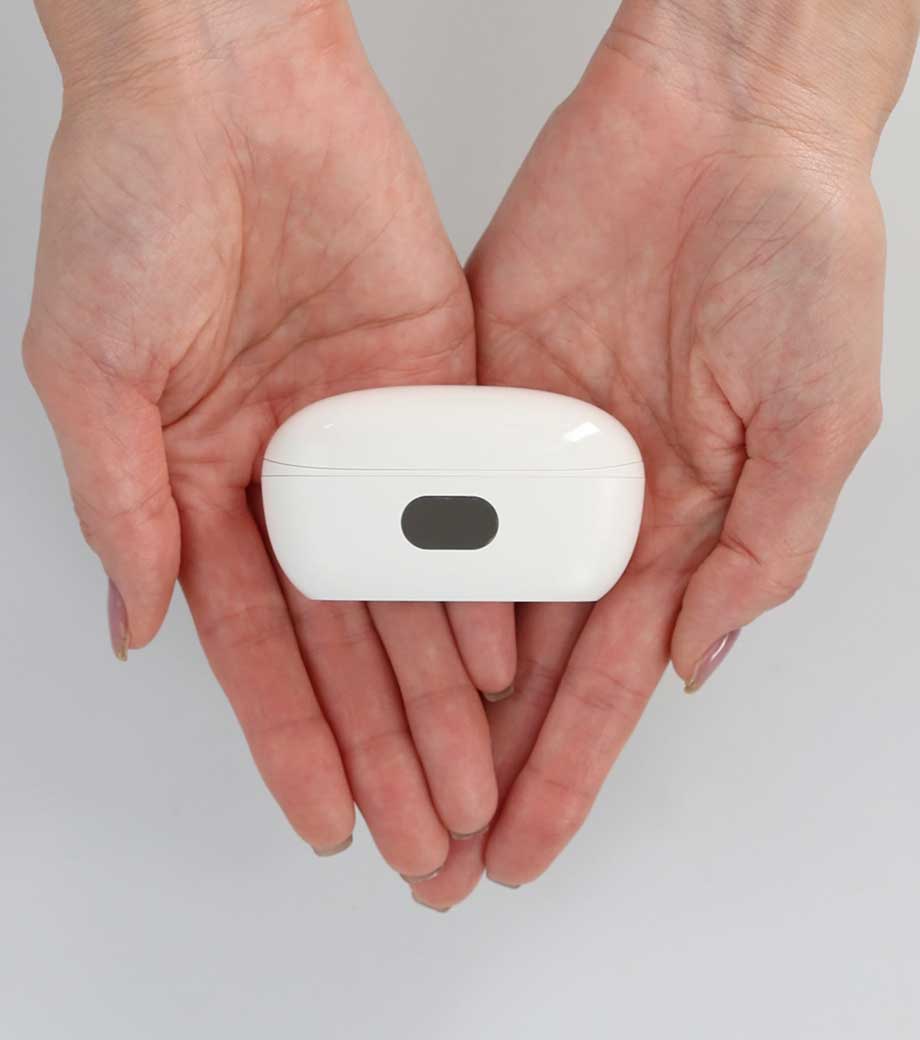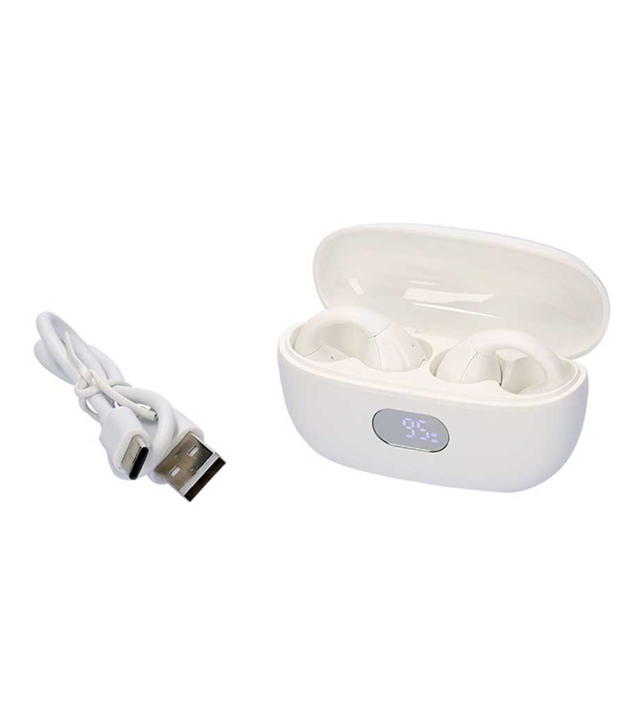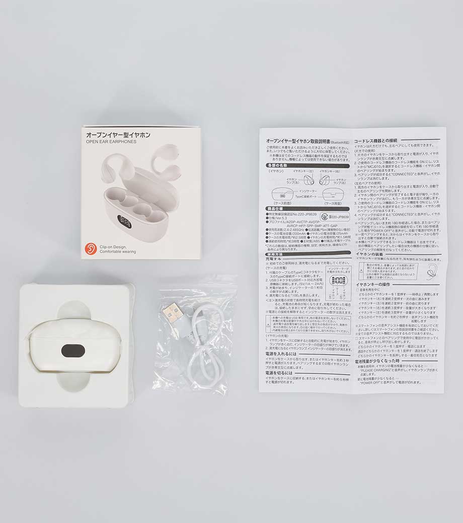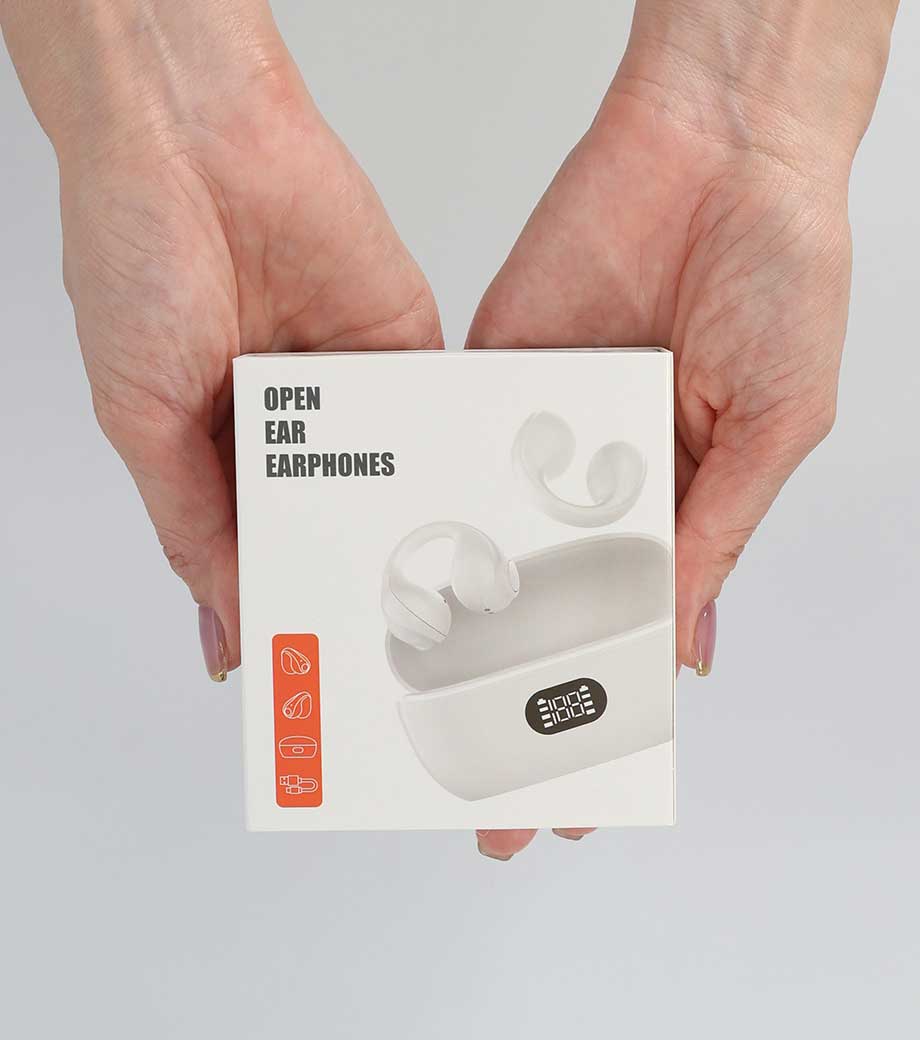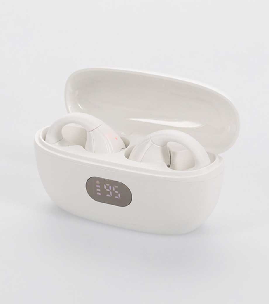 ながら聴きに最適なワイヤレスのイヤーカフ型イヤホン。耳をふさがないので、音楽や通話を楽しみながらも周囲の音も自然に聞こえます。通勤・通学やランニング、家事中に使えて便利。柔らかい素材で耳を挟むように装着するので、長時間使用でも圧迫感がなく快適です。ケースの側面に充電状況を%で示すインジケーター付き。