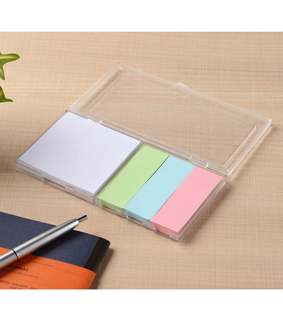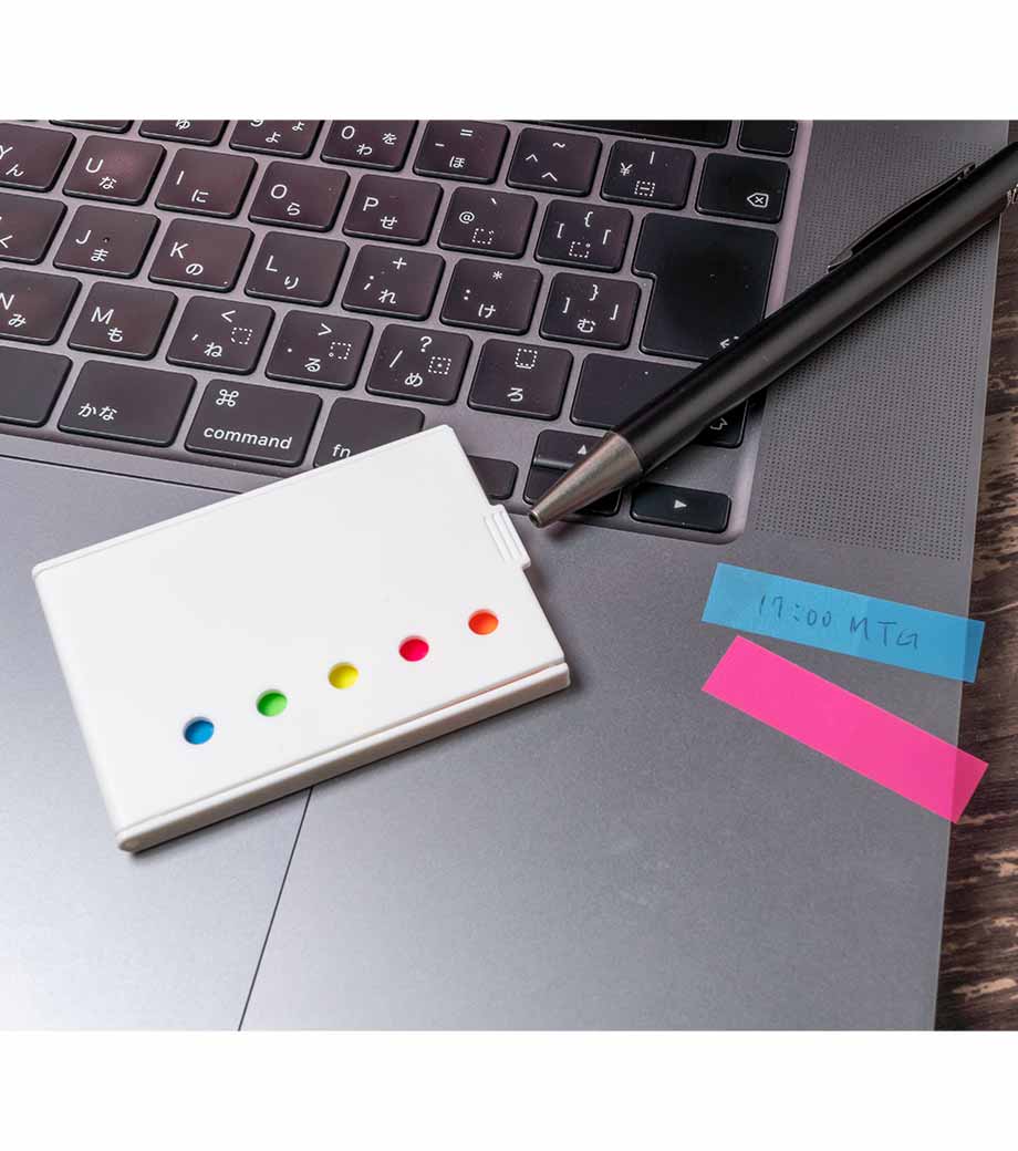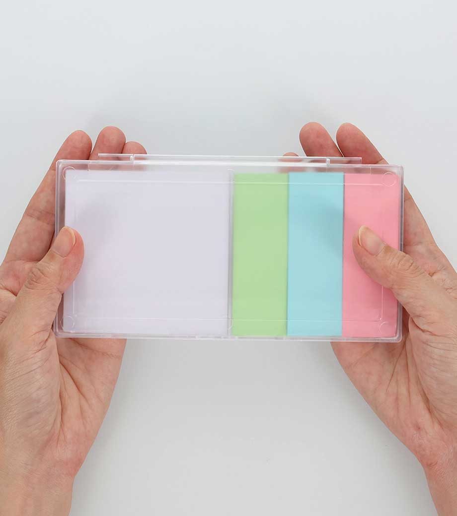 思いついたアイデアをすぐにメモできるケース入ふせんセット。4種類のふせんがケースに収まっており、持ち運びにも便利。鞄の中でかさばらず、ふせんがバラつく心配もありません。透明ケースで中身が見えるから、デスク上で必要なふせんをサッと取り出せます。