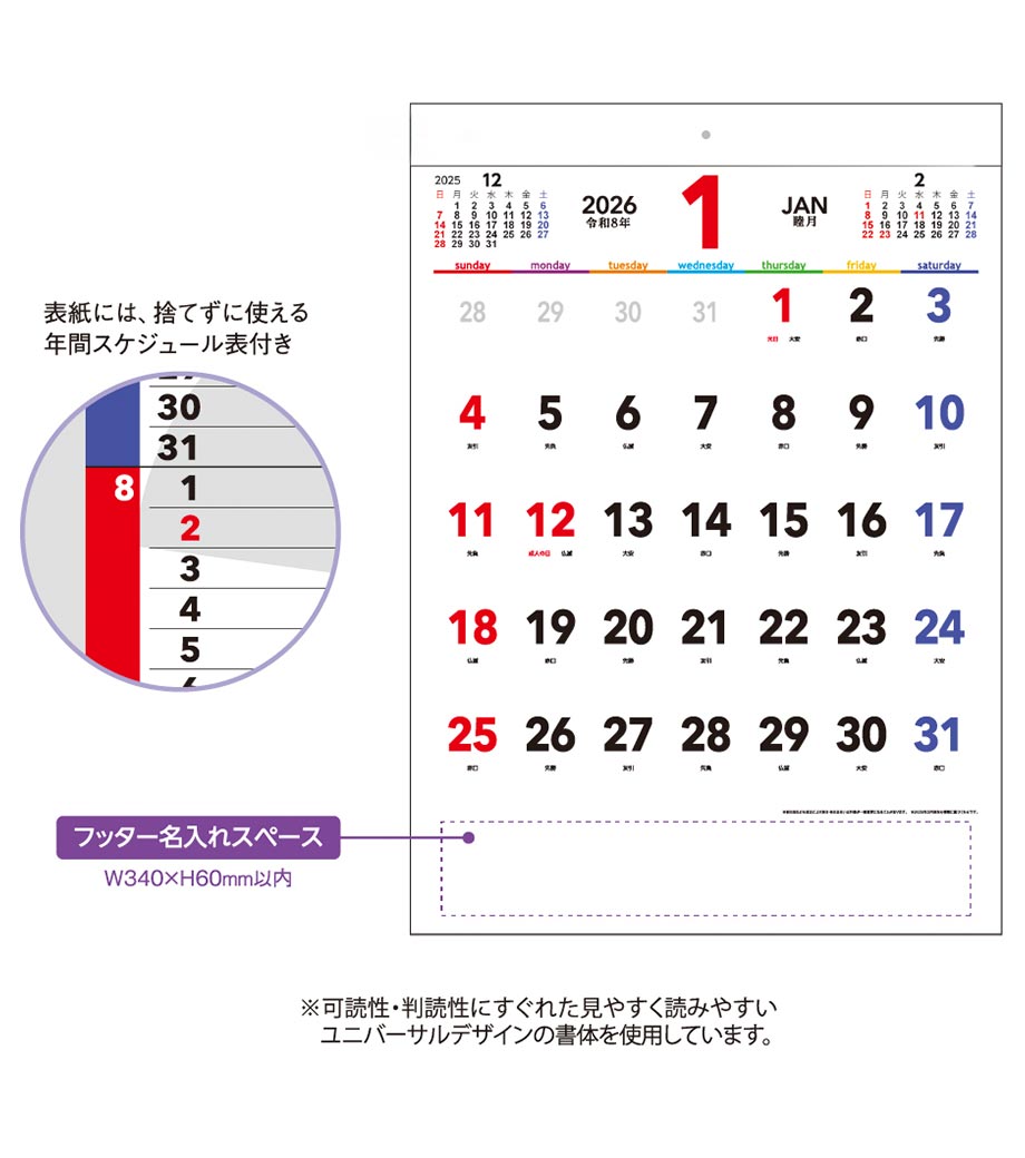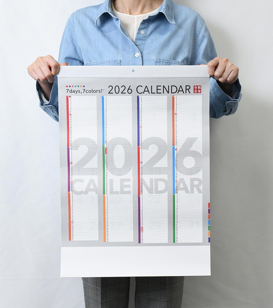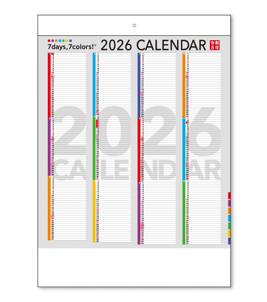 曜日表示の7色のカラー使いが楽しい、シンプルなデザインの壁掛けカレンダー。サイズは46/4切ほどです。日曜始まりの大きく見やすい日付表示が特徴。書体は、可読性、判読性にすぐれたユニバーサルデザインを採用しています。表紙は1年365日の予定を書き込めるようになっているので年間スケジュール表としても使用可能です。