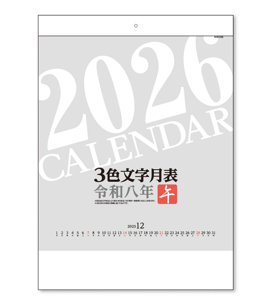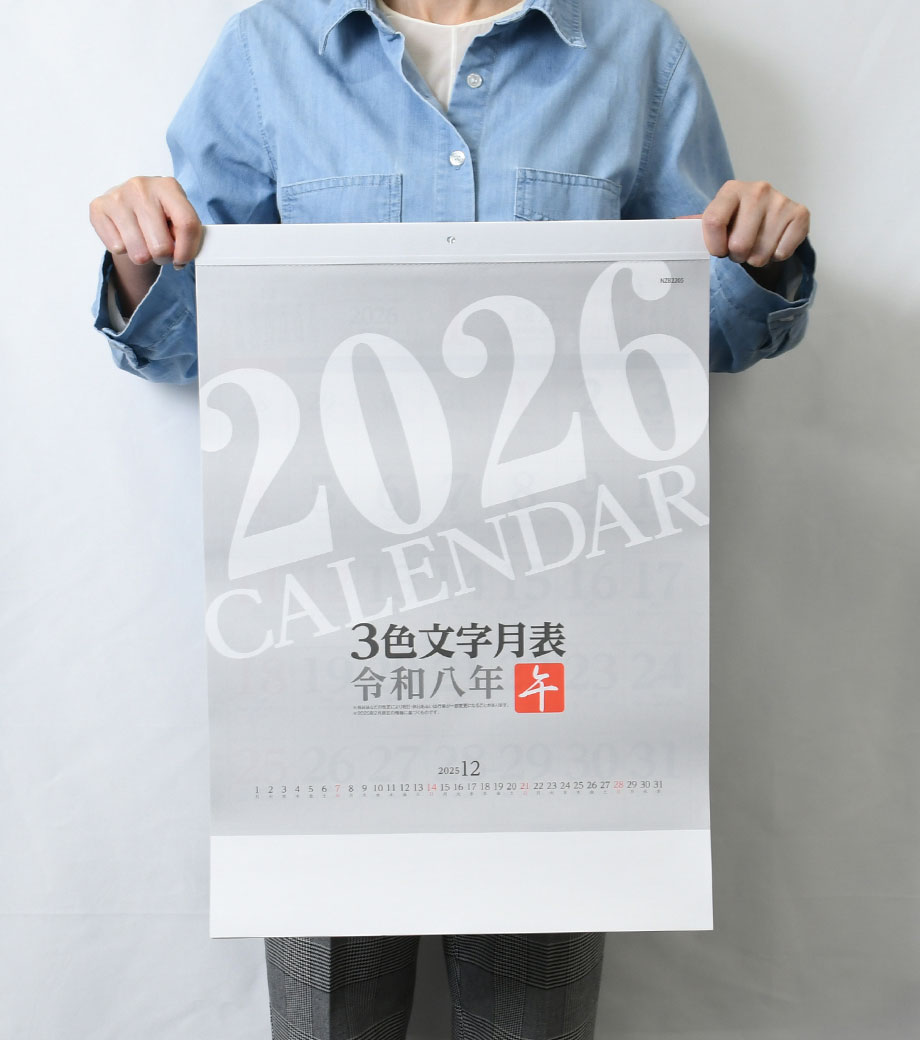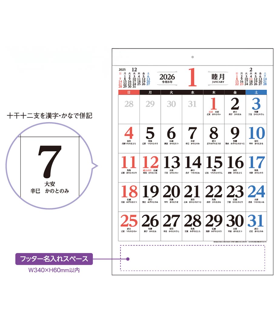 土日のみ色付きの定番型壁掛けカレンダー。46/4切ほどで、大きく見やすいサイズです。日々の十干十二支が漢字・かなで併記されています。日付の下にスペースがあるので、予定を書き込むことも可能。自宅にもオフィスにも馴染むシンプルなデザインです。
