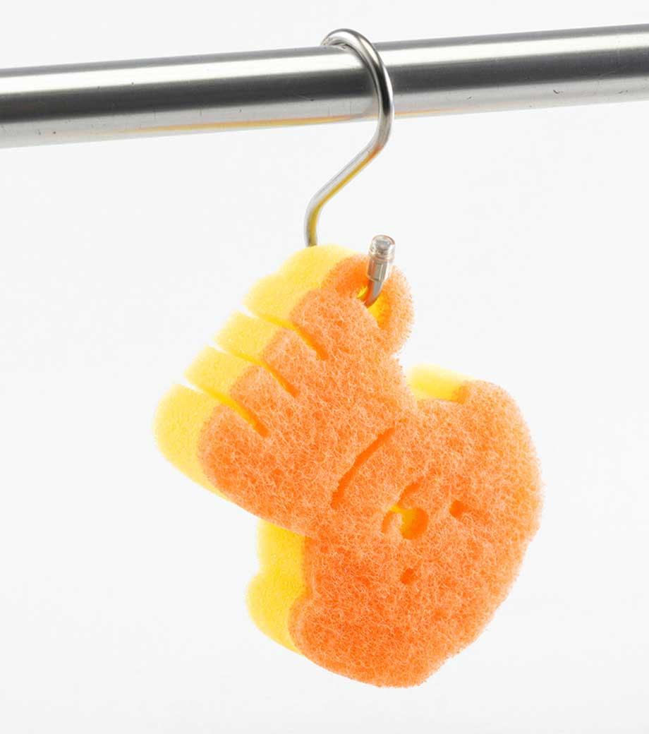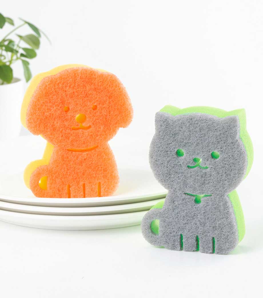ワンちゃんとネコちゃんの形をしたキュートなキッチンスポンジのセットです。ビビッドな色味で毎日の食器洗いが楽しくなります。厚みのある2層構造になっていて、握りやすく実用的。しっぽ部分はフックに引っかけられるようになっているので、衛生的に使えるのも嬉しいポイントです。