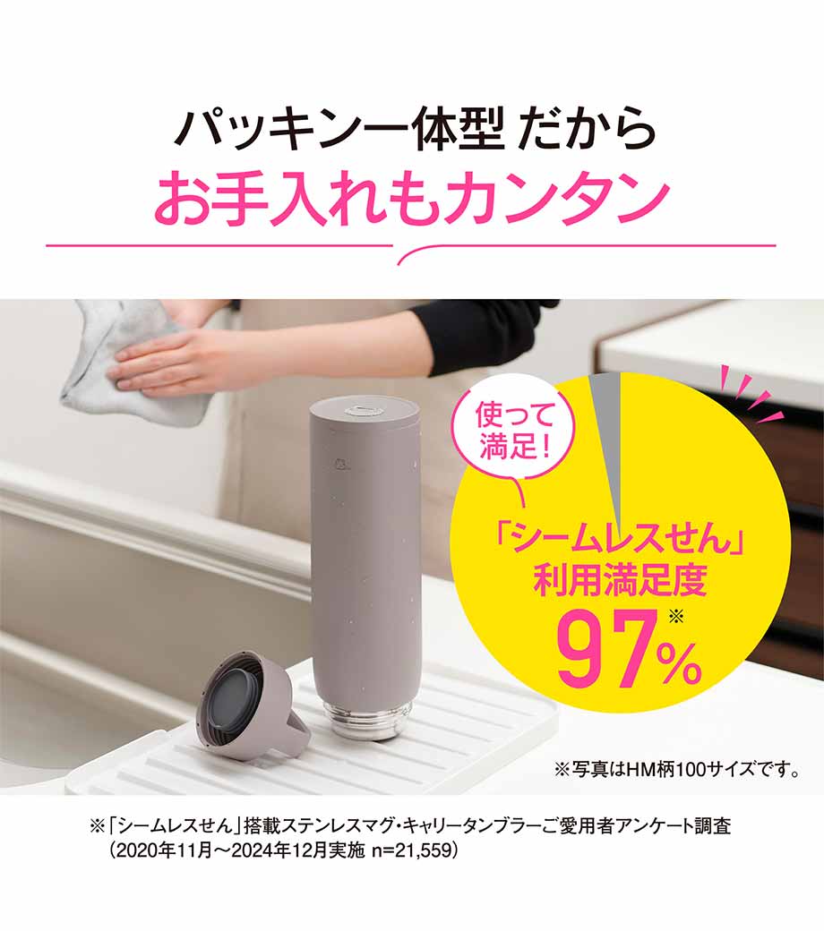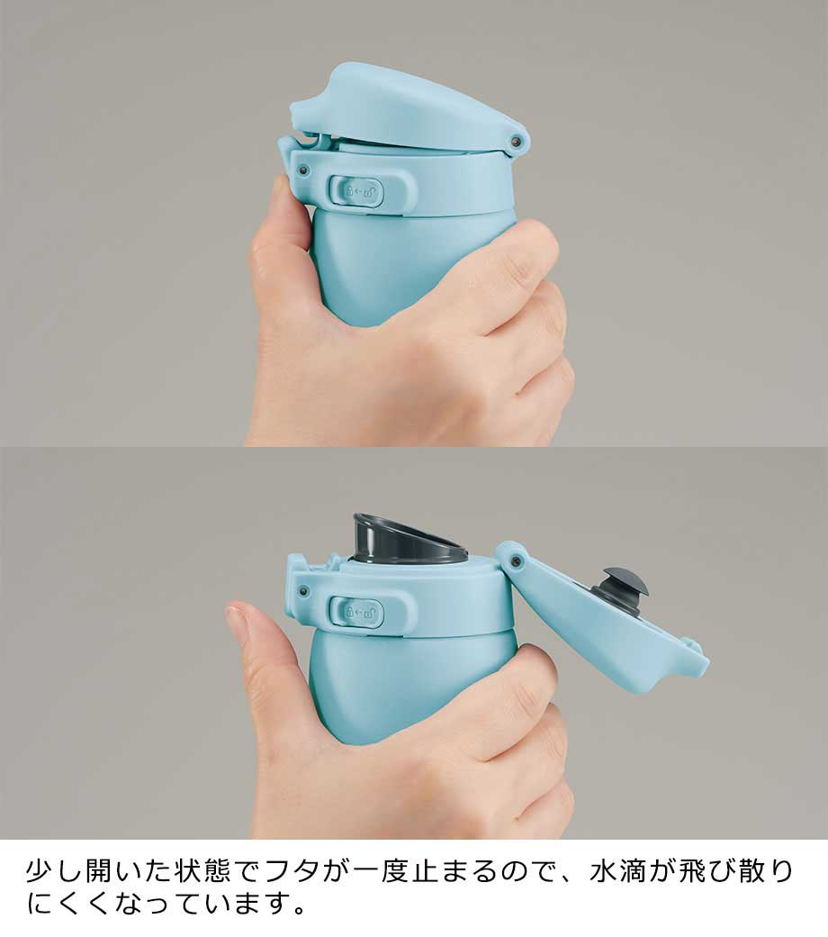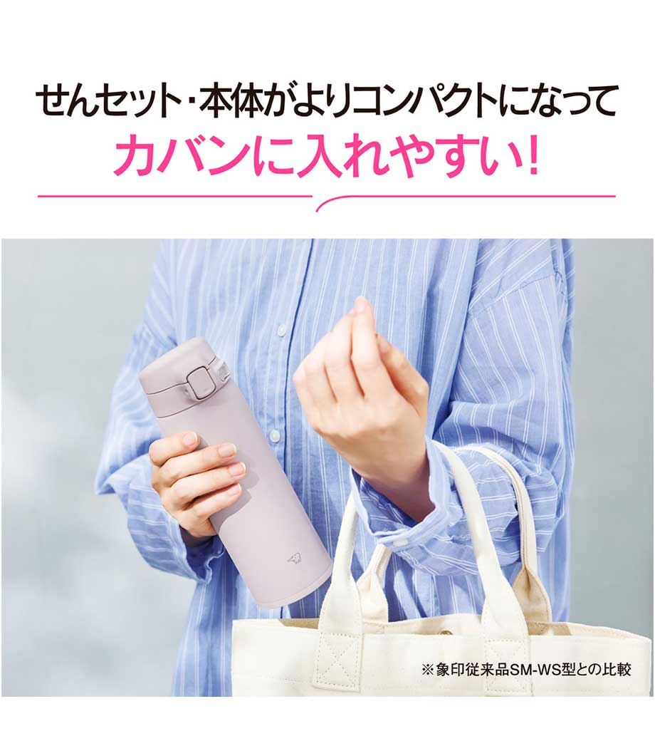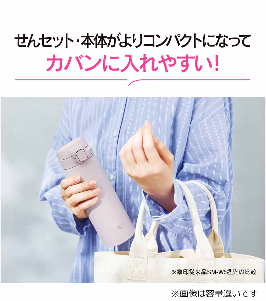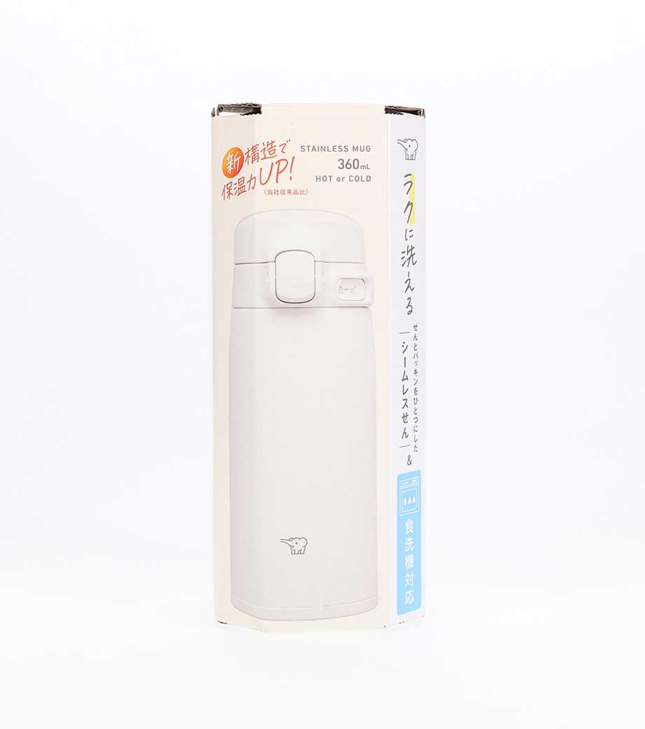 象印独自の「サーモリング構造」で高い保温・保冷力を誇る真空ステンレスボトルです。ワンタッチで開閉できるキャップは、栓とパッキンが一体化したシームレスせん。パーツが少なく食洗機対応なので、とにかくお手入れが簡単です。ボトル内面は耐食性が高くサビに強い加工がされています。開閉ロック付きでキャップがしっかり閉まるのも嬉しいポイント。容量約360mlで、ランチバッグにもすっぽり収まるサイズ感です。