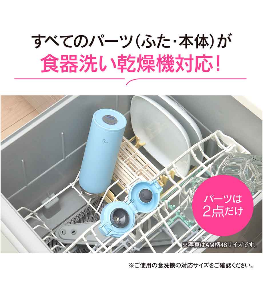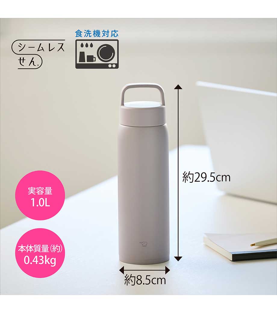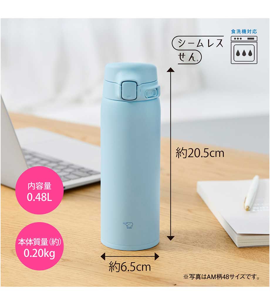象印独自の「サーモリング構造」で保温・保冷力抜群な真空ステンレスボトルです。栓とパッキンが一体化したシームレスせんで、パーツが少なくお手入れ簡単。さらに食洗機対応でいつでも清潔に使えます。内面はサビに強い加工が施されており、耐久性も抜群。開閉ロック付きでしっかり閉まる安心設計です。毎日使うのにちょうどいい容量約480mlで、通勤・通学のおともにぴったり!