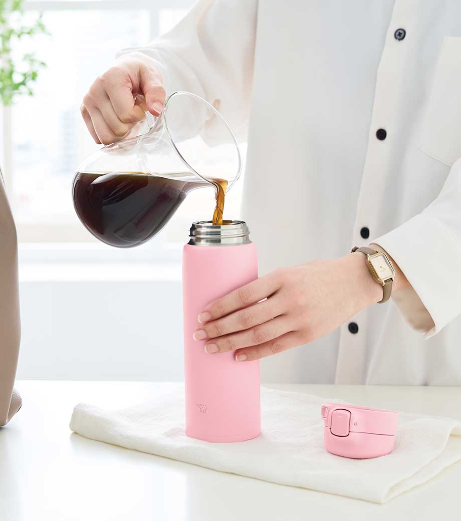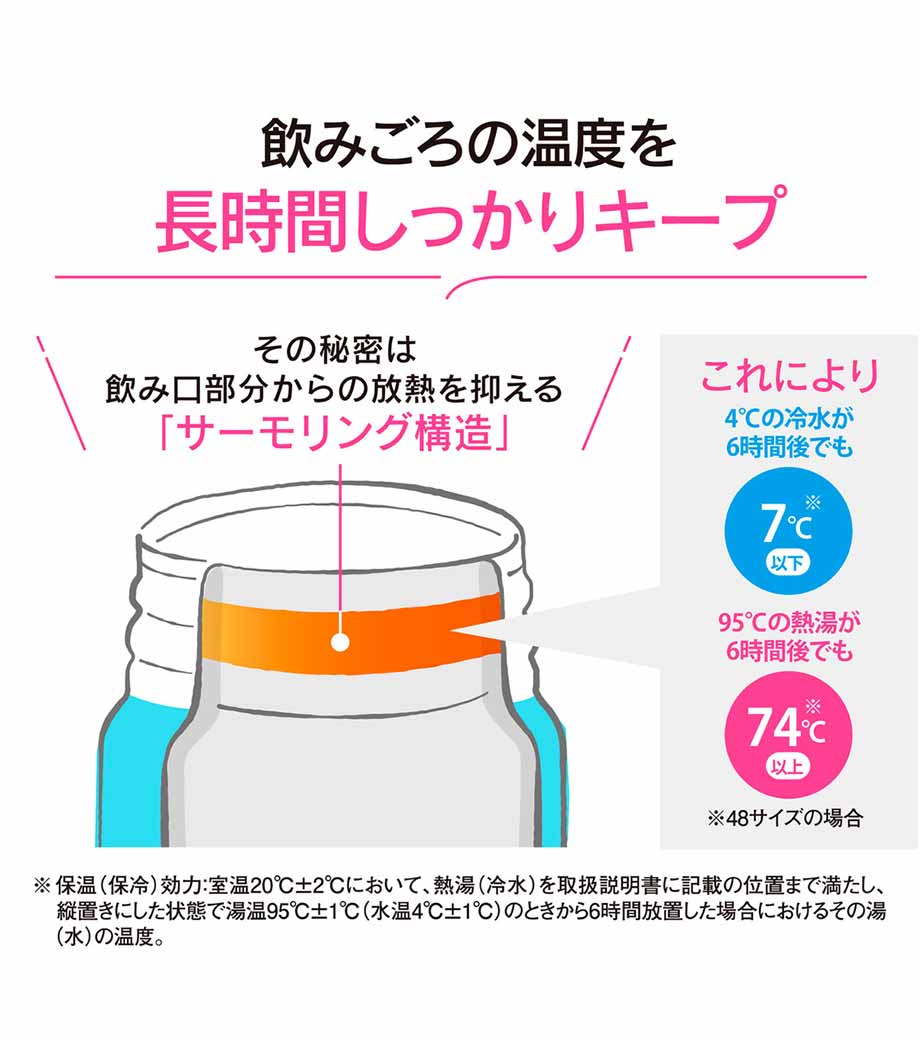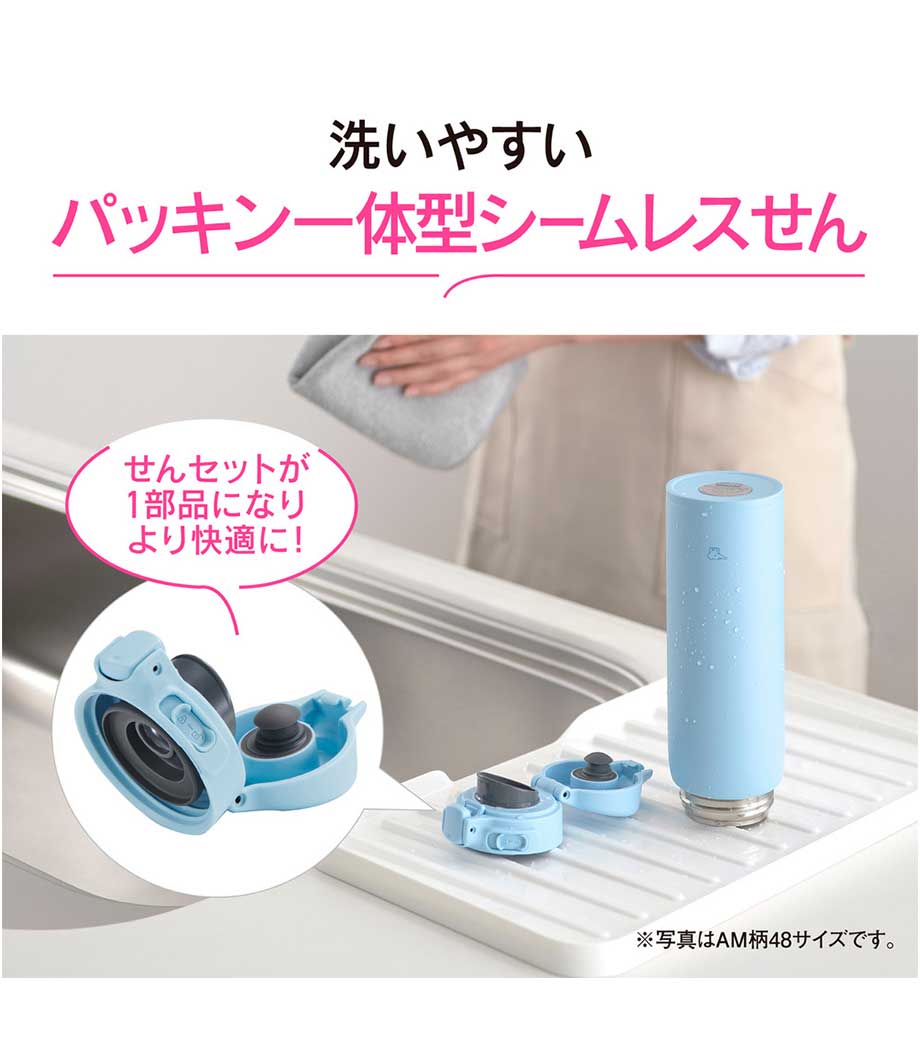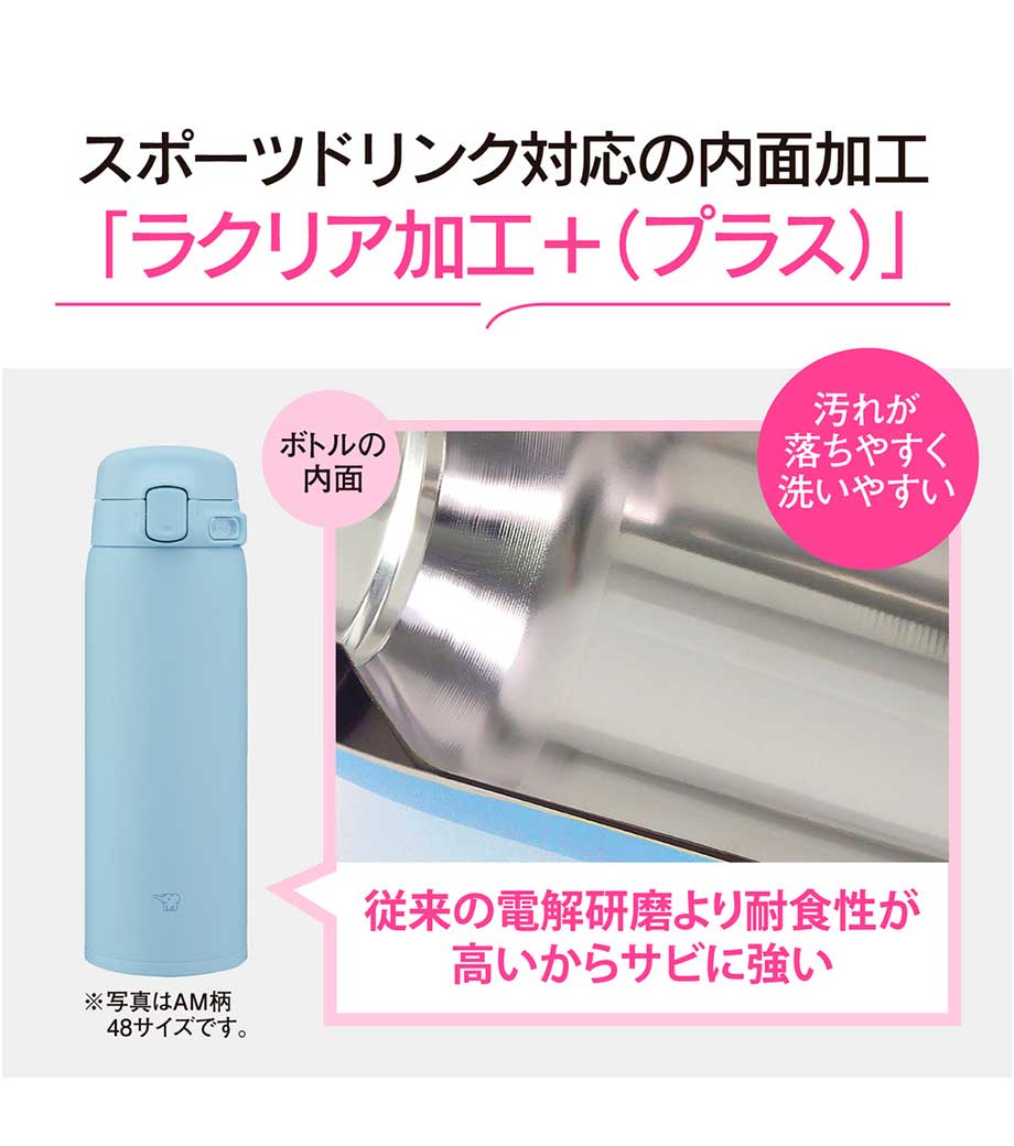象印独自の「サーモリング構造」で保温・保冷力抜群な真空ステンレスボトルです。栓とパッキンが一体化したシームレスせんで、パーツが少なくお手入れ簡単。さらに食洗機対応でいつでも清潔に使えます。内面はサビに強い加工が施されており、耐久性も抜群。開閉ロック付きでしっかり閉まる安心設計です。毎日使うのにちょうどいい容量約480mlで、通勤・通学のおともにぴったり!