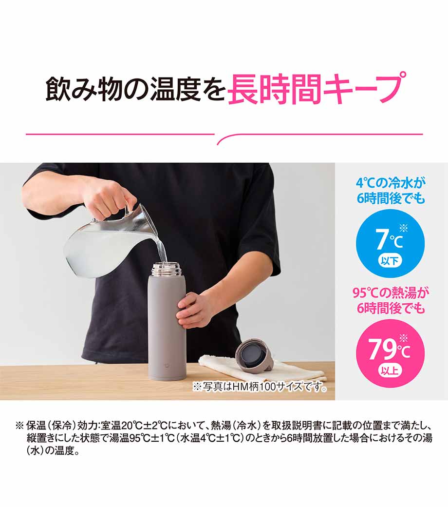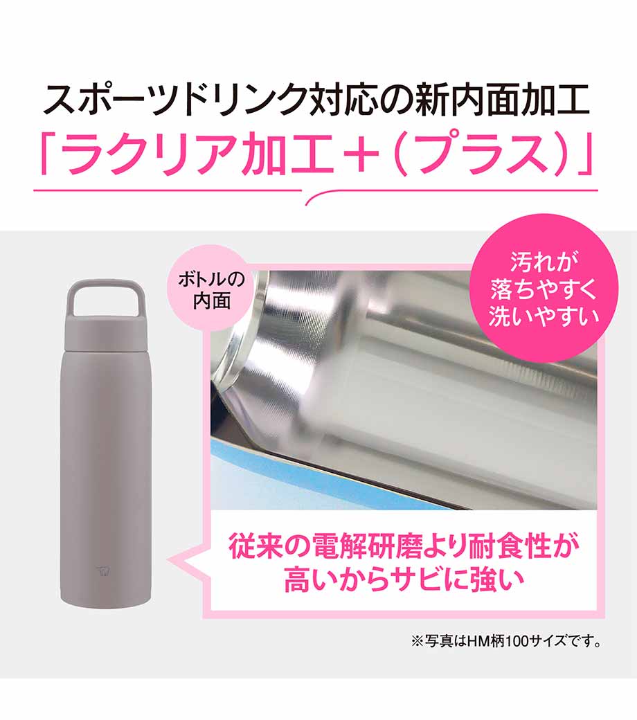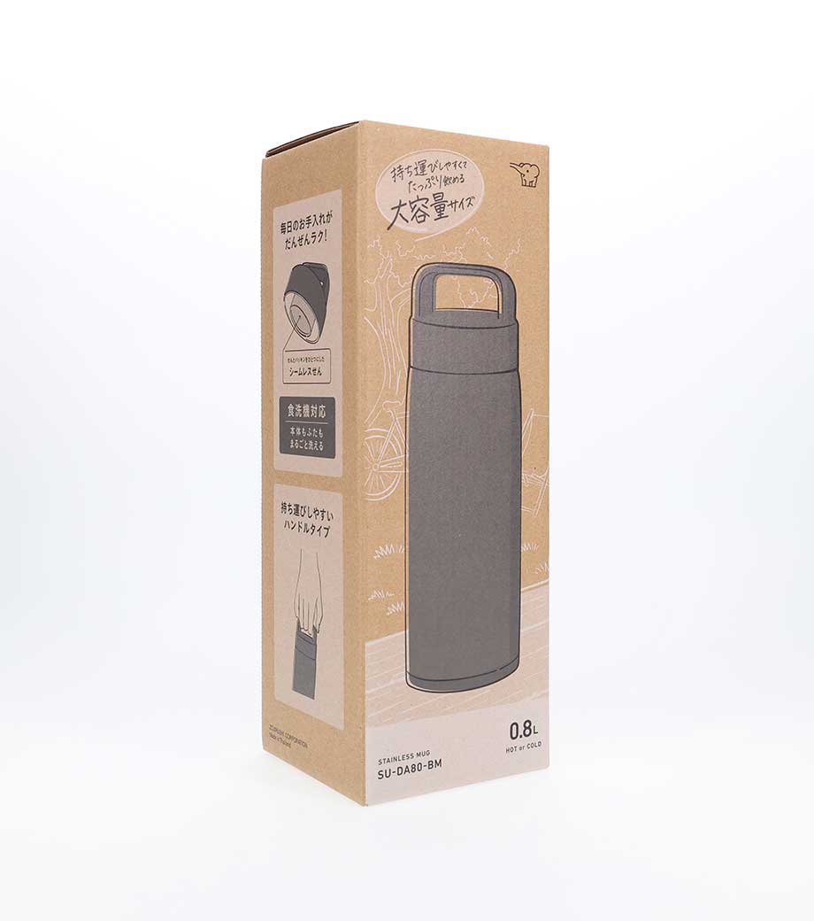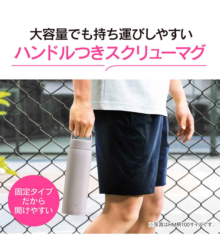 持ち運びに便利なハンドル付きマグボトル。氷が入れやすい広めの口径で、たっぷり飲める容量約800mlです。保冷温効果抜群の真空二重構造。スポーツドリンクも入れられるので、ジムやフィットネスのお供に最適!せんとパッキンをひとつにした「シームレスせん」採用でお手入れしやすく、内側はニオイや汚れが付きにくい特殊なコーティングがされています。