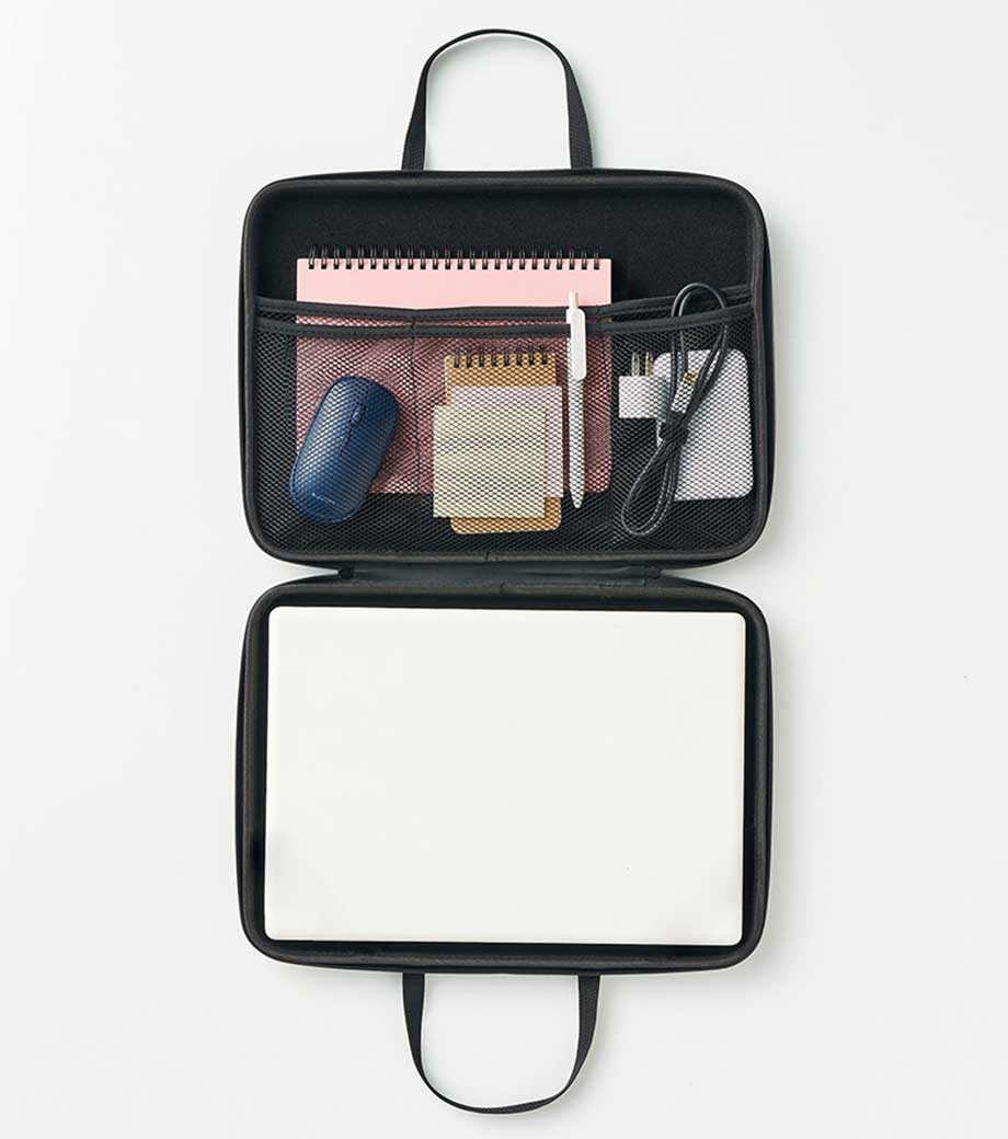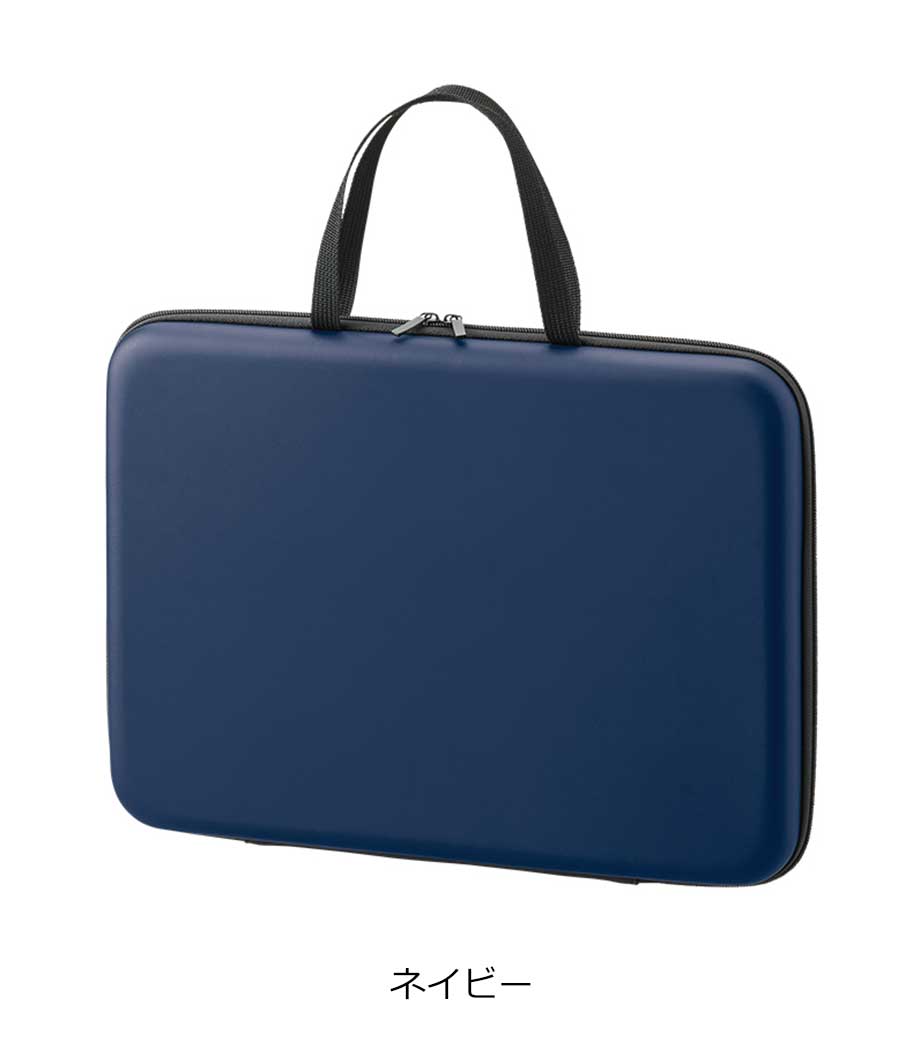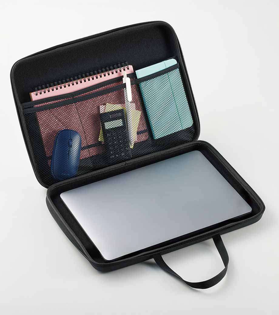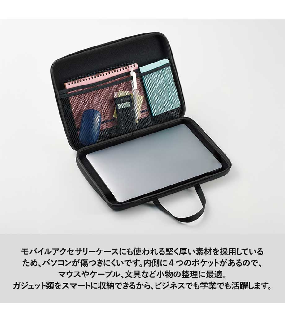 PCを安全に持ち運べるハードタイプのPCケースです。コの字型に大きく開くダブルファスナーで、PCの出し入れもスムーズ。内側にはメッシュポケットが4つあり、大きな仕切りポケットには書類等を、3つの小分けポケットにはケーブルや小物の整理にも便利です。