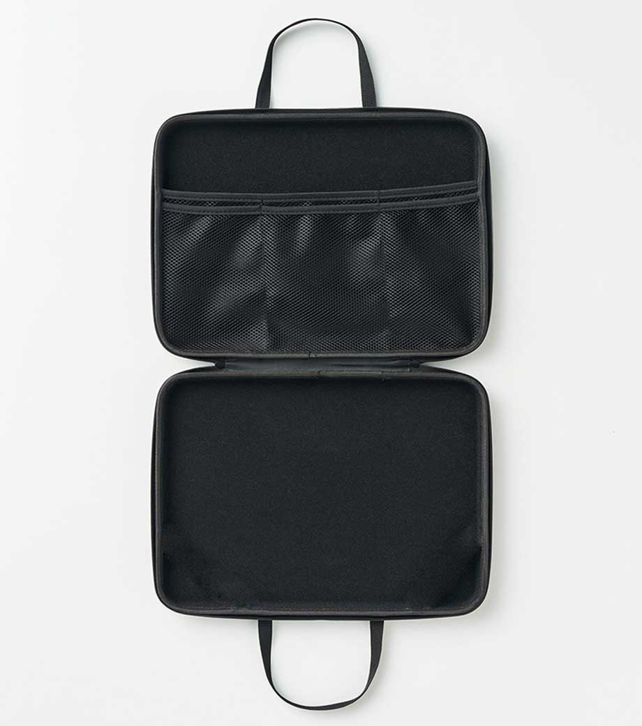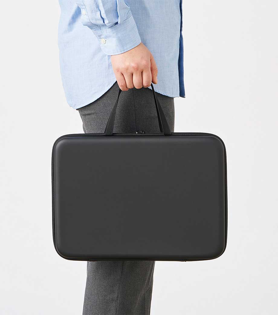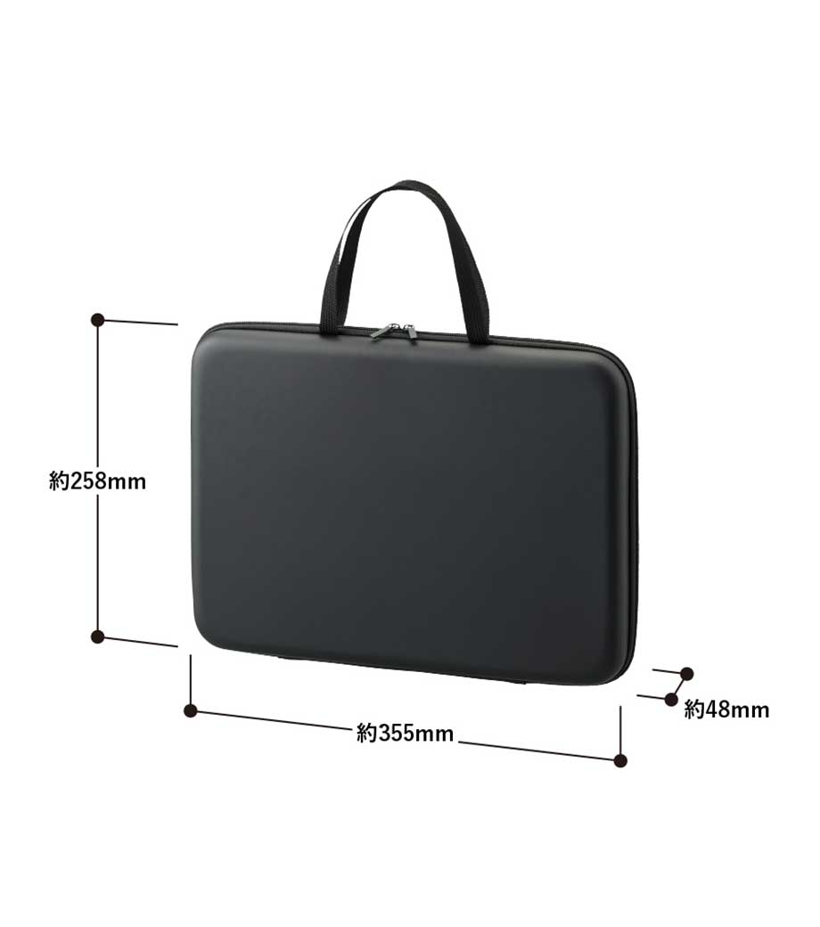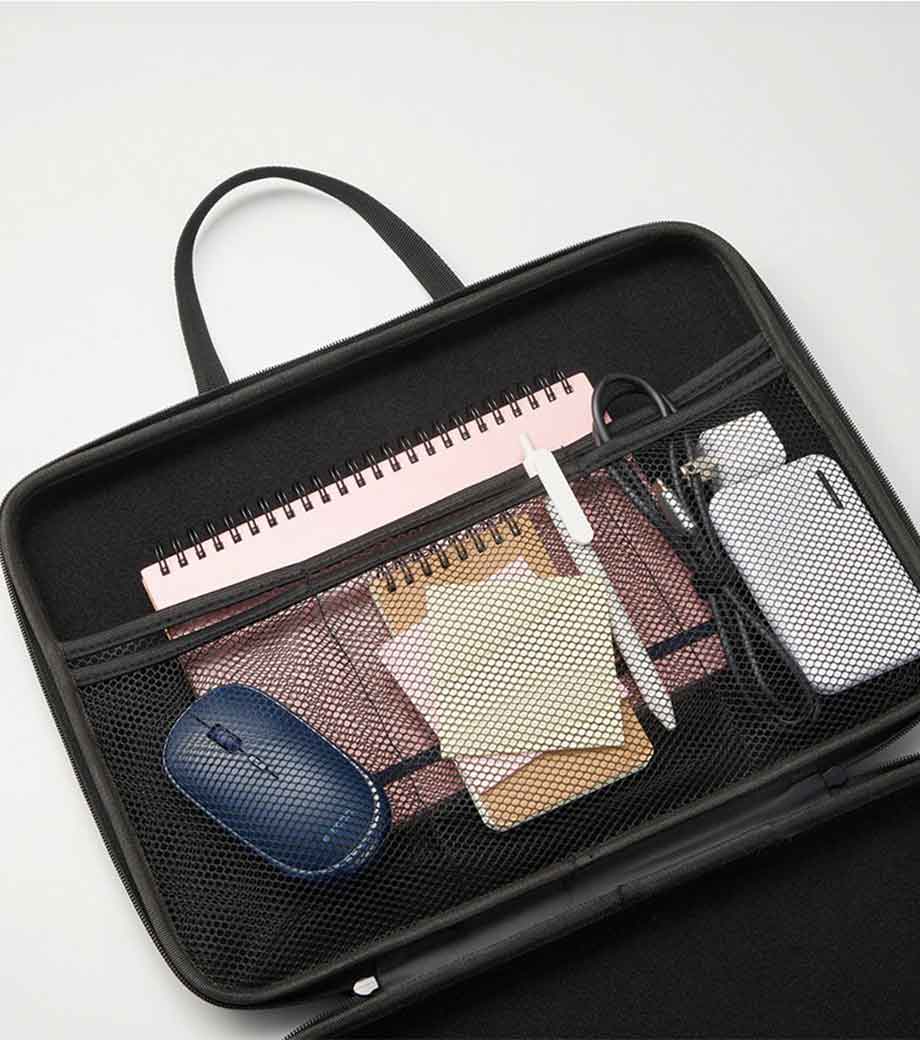PCを安全に持ち運べるハードタイプのPCケースです。コの字型に大きく開くダブルファスナーで、PCの出し入れもスムーズ。内側にはメッシュポケットが4つあり、大きな仕切りポケットには書類等を、3つの小分けポケットにはケーブルや小物の整理にも便利です。
