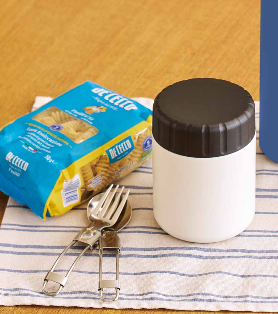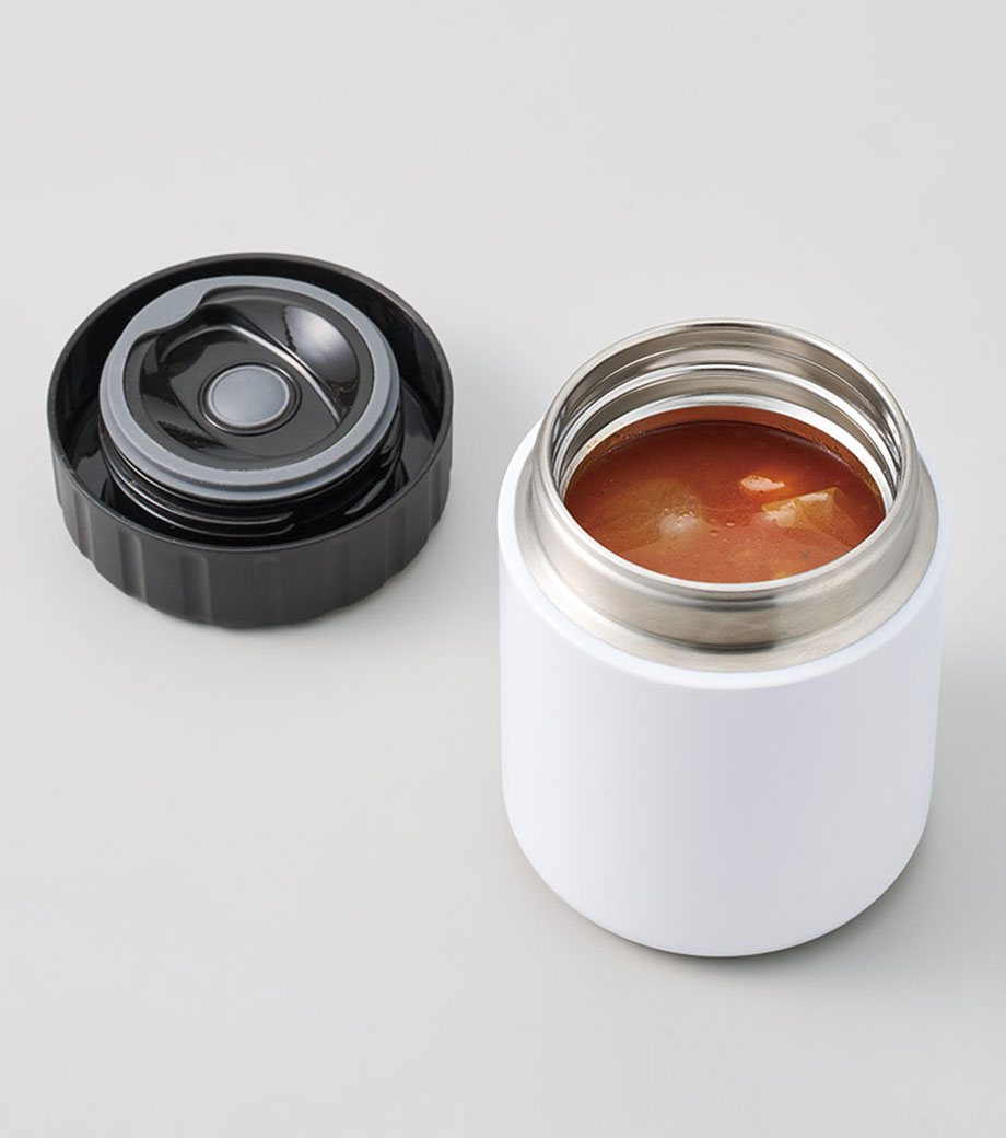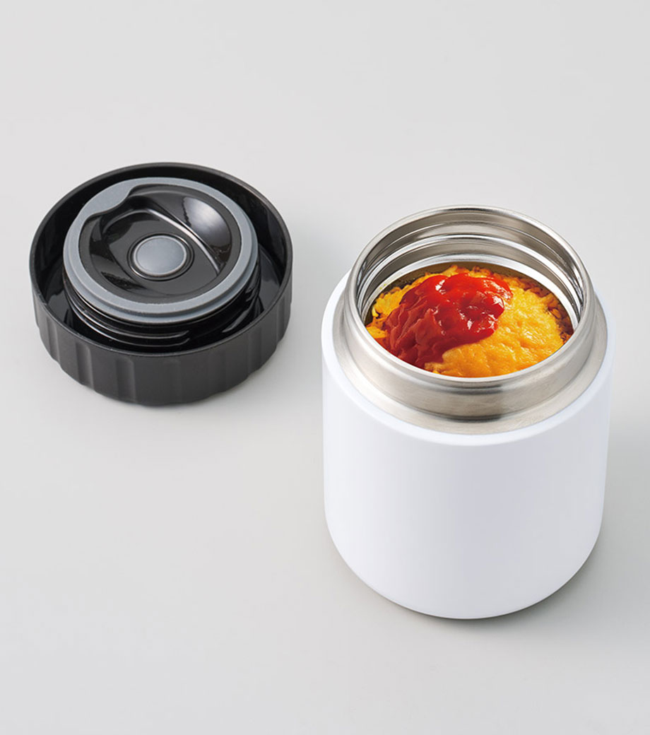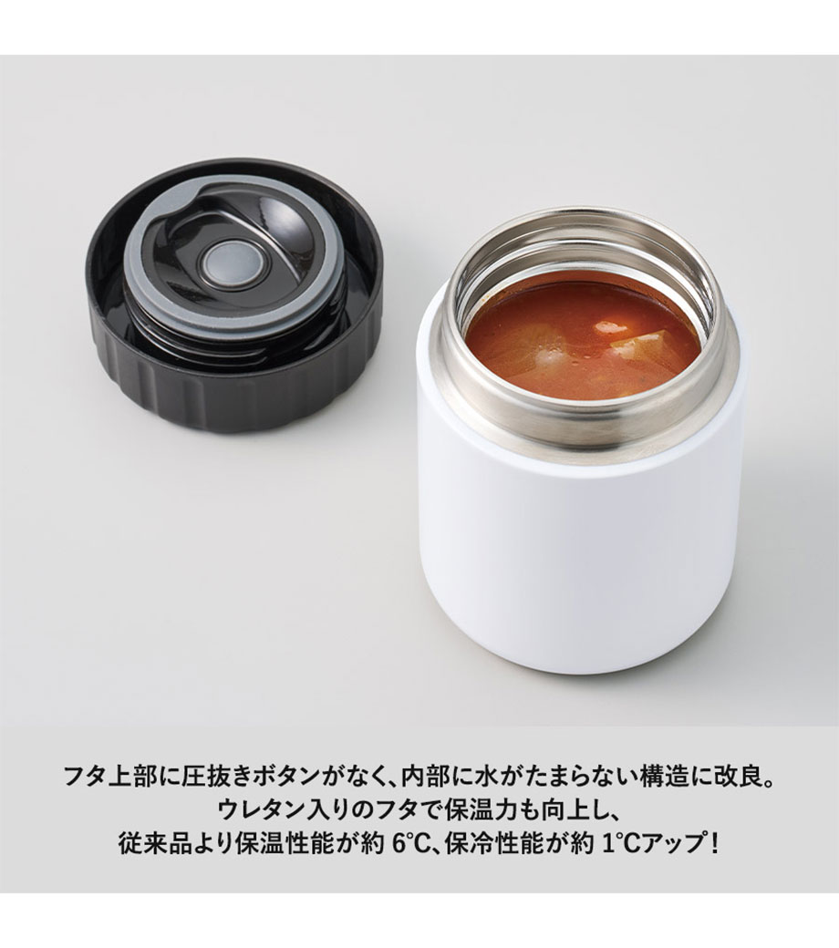 ザラっとした手触りのマット塗装が特徴のお洒落フードポット。真空二層構造で保冷保温効果が続き、長時間の持ち運びでもおいしさをキープしてくれます。420mlの十分な容量。大きめの具も入りやすい広めの口径で、開けやすい蓋も嬉しいポイントです。