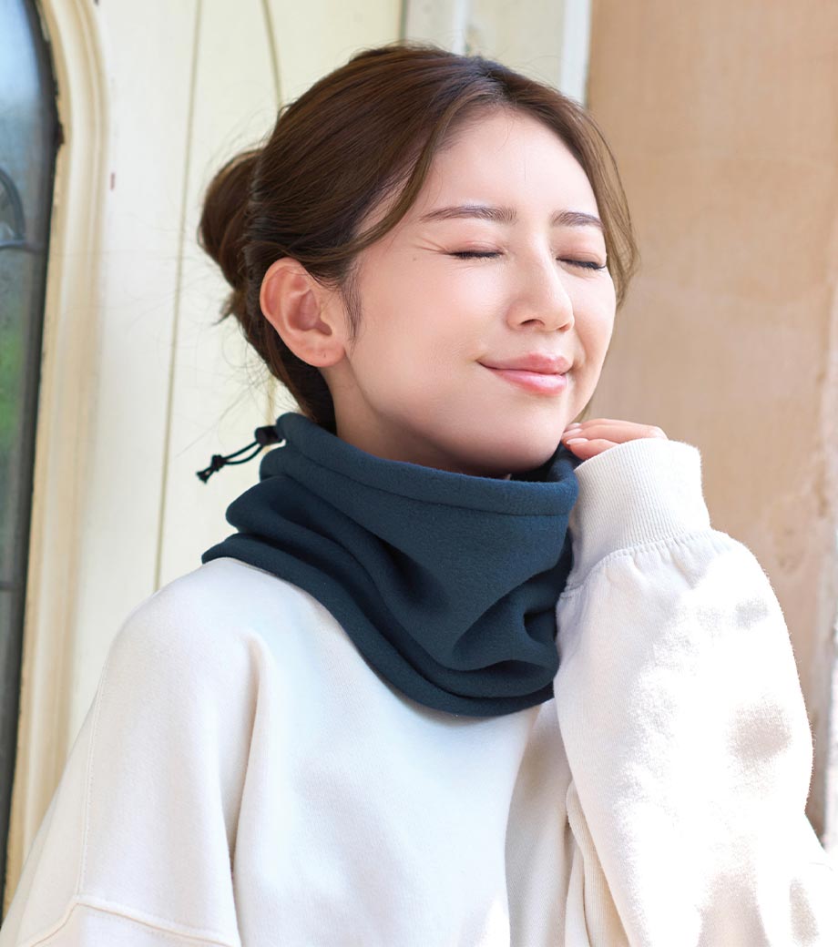 首元を温めると血行がよくなりリラックス効果が期待できるネックウォーマー。屋外に限らず室内でも脱着が楽チンです。冬場のウォーキングや庭仕事、自転車に乗る時や映画館などでも邪魔にならず防寒できます。紐を締めれば帽子に変身しますよ。