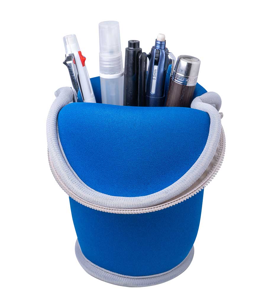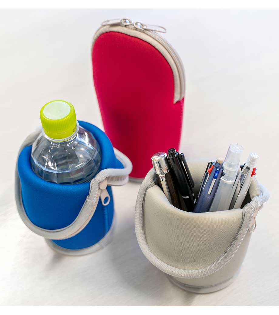 やわらかな手触りが気持ちよいスタンド型のポーチです。ペンケースとしてだけでなく、立てて使用できるので机の上ではペン立てに!場所をとらずに便利です。クッション性のある素材を使用しているので、ペットボトルホルダーや、ガジェットポーチとしても。