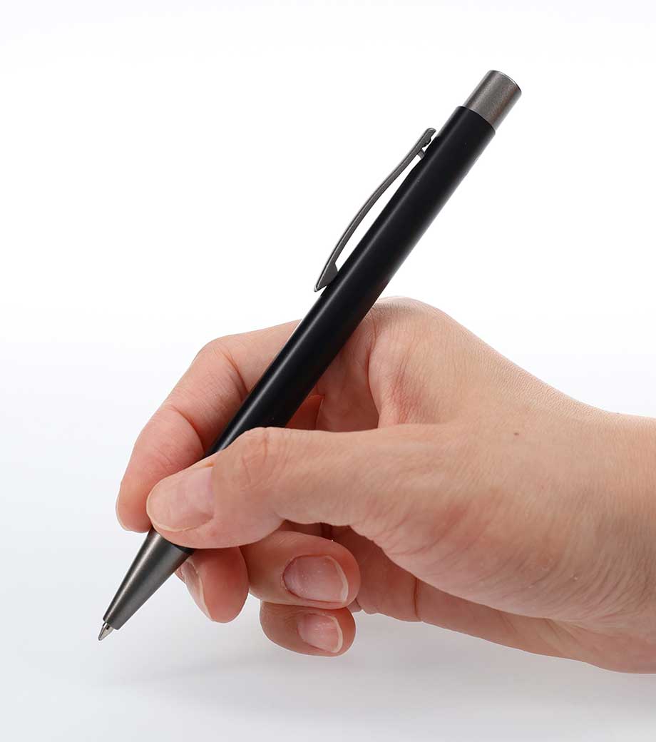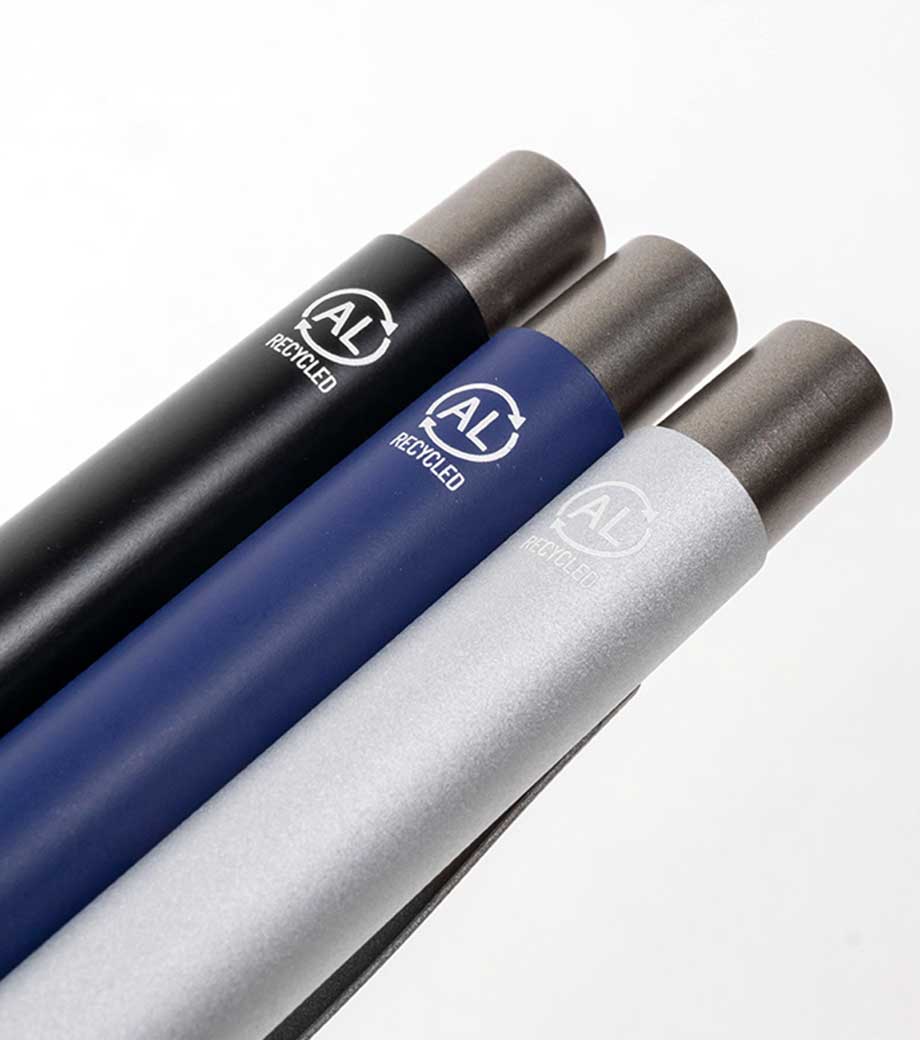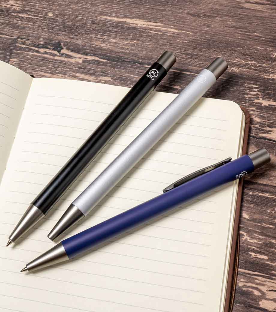 リサイクルアルミを使用した、環境にやさしいノック式ボールペンです。ノベルティとしてお渡しすれば、SDGsへの取り組みをさりげなくアピールできます。ベーシックな本体色で、オフィスや商談の場などビジネスシーンにもぴったり。全体的にマットな質感で、激安価格ながらも重厚感があります。