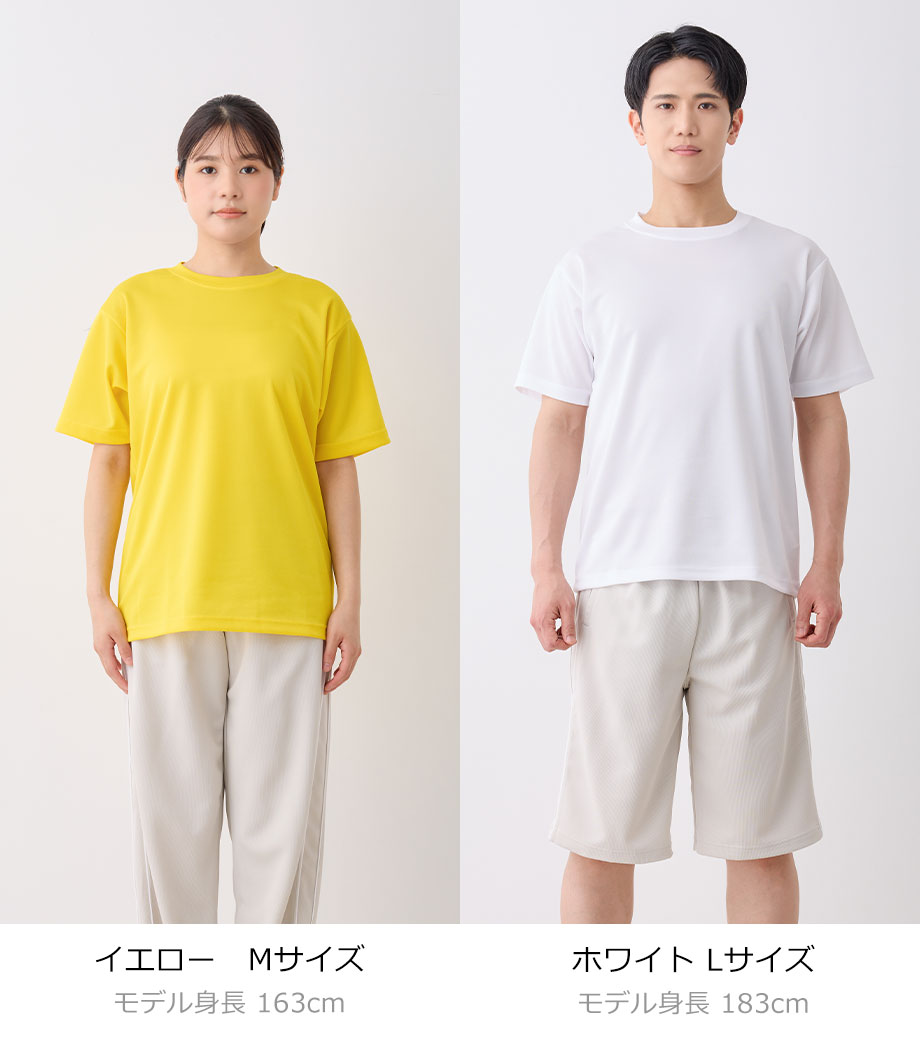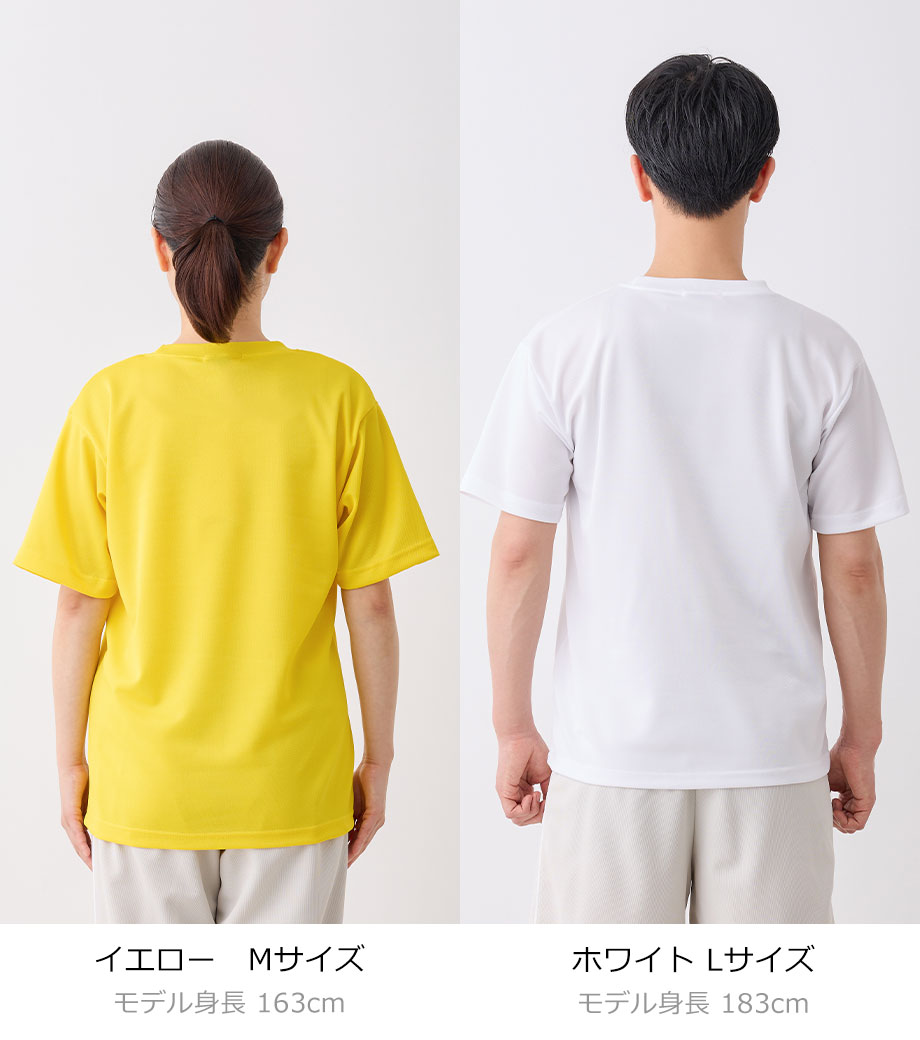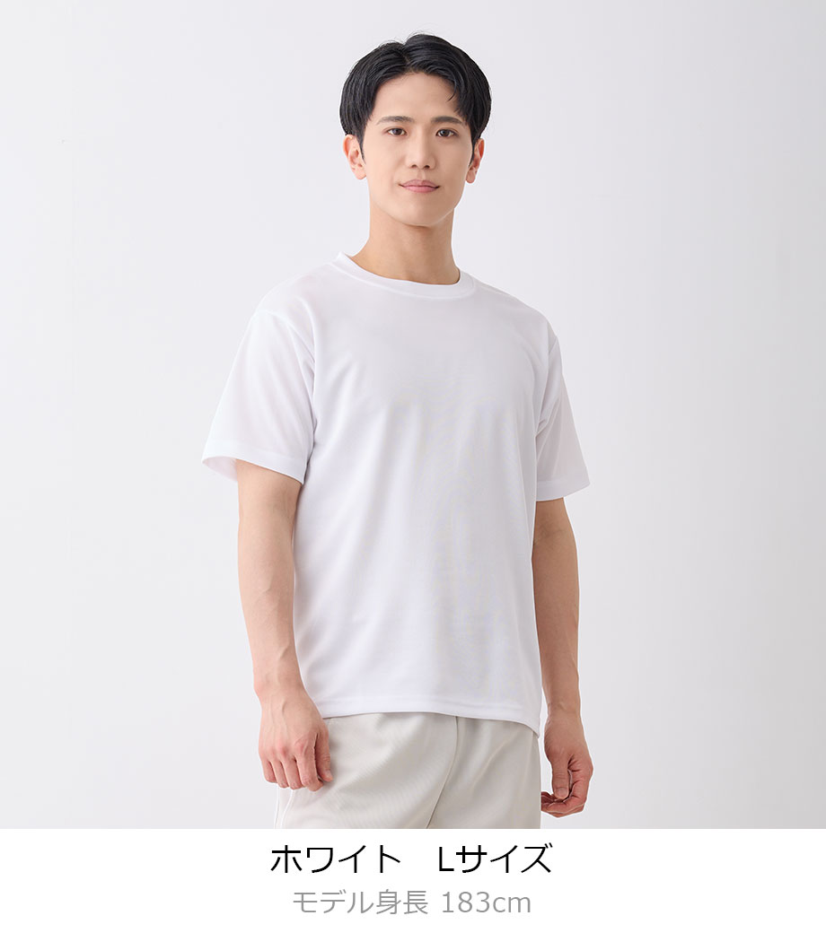 吸汗速乾性のあるポリエステル素材を使用した、ベーシックな半袖Tシャツです。表面はなめらかなスムース生地でシワになりにくく、裏地はメッシュ仕様でサラッとした着心地を実現。襟はフライス生地で型崩れしにくく、着脱もスムーズです。