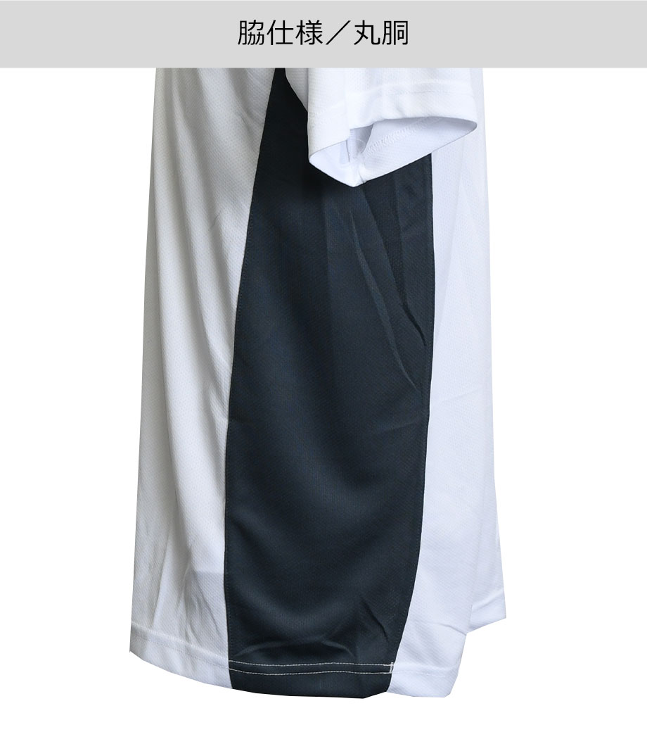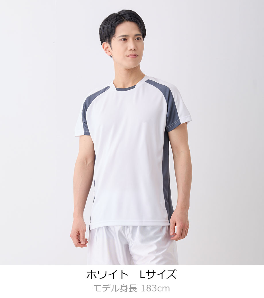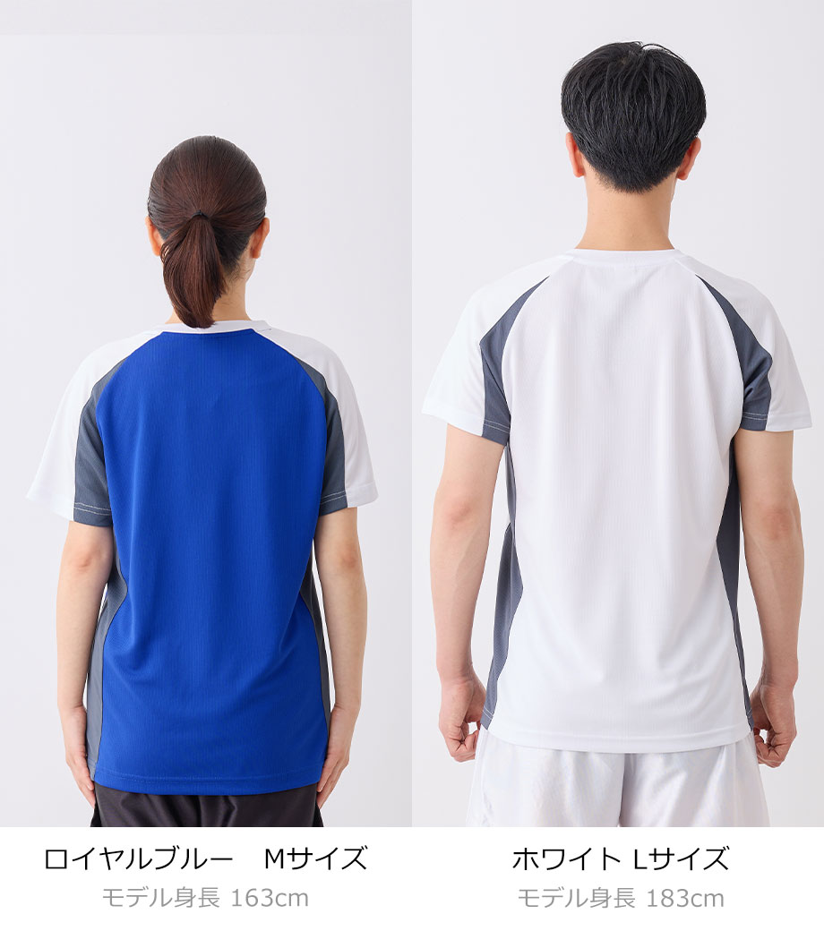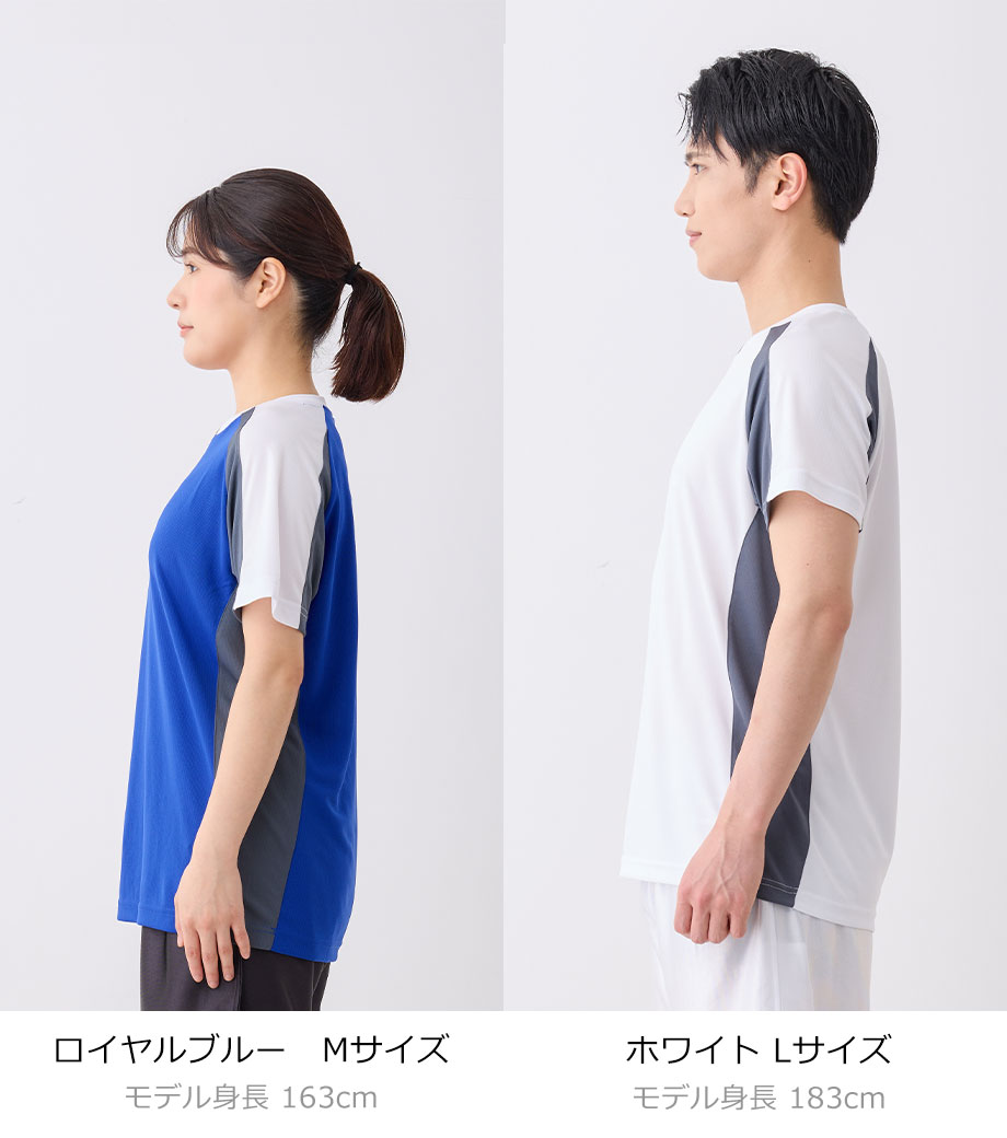吸汗速乾性のあるポリエステル素材のTシャツです。伸縮性のあるフライス編みの襟で着脱しやすく、襟から脇にかけて切り替えられたラグラン袖が肩や腕の動きをスムーズにサポート。シンプルながらもスポーティなデザインが魅力です。