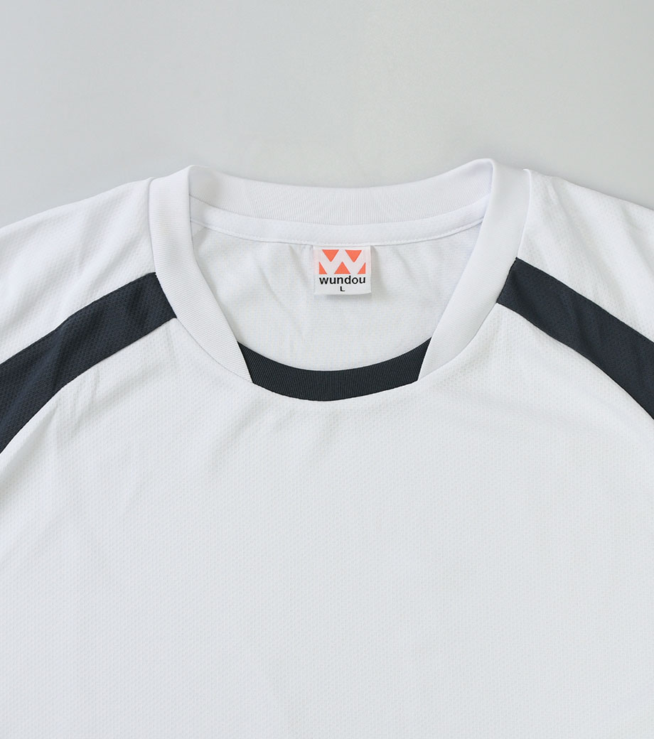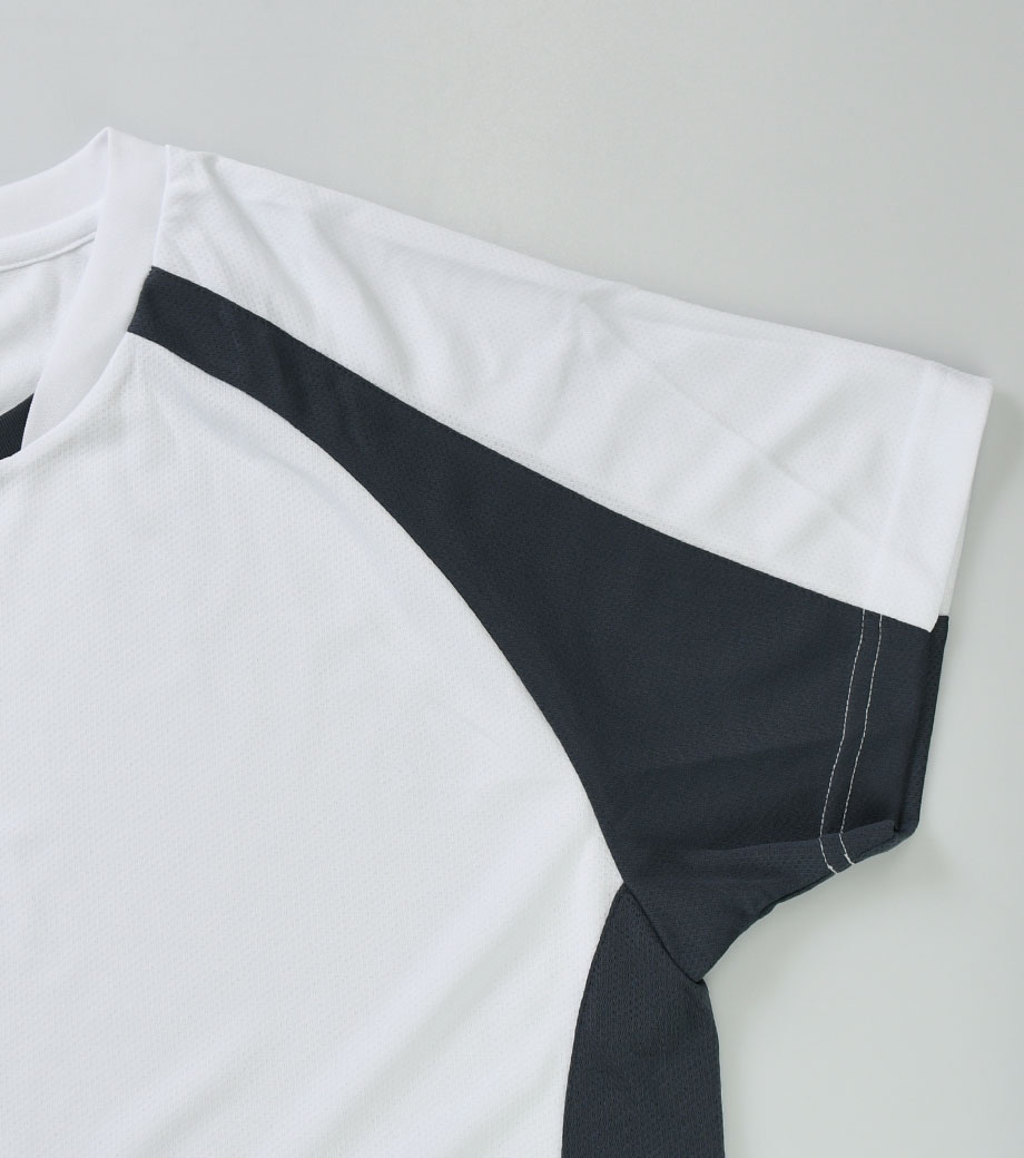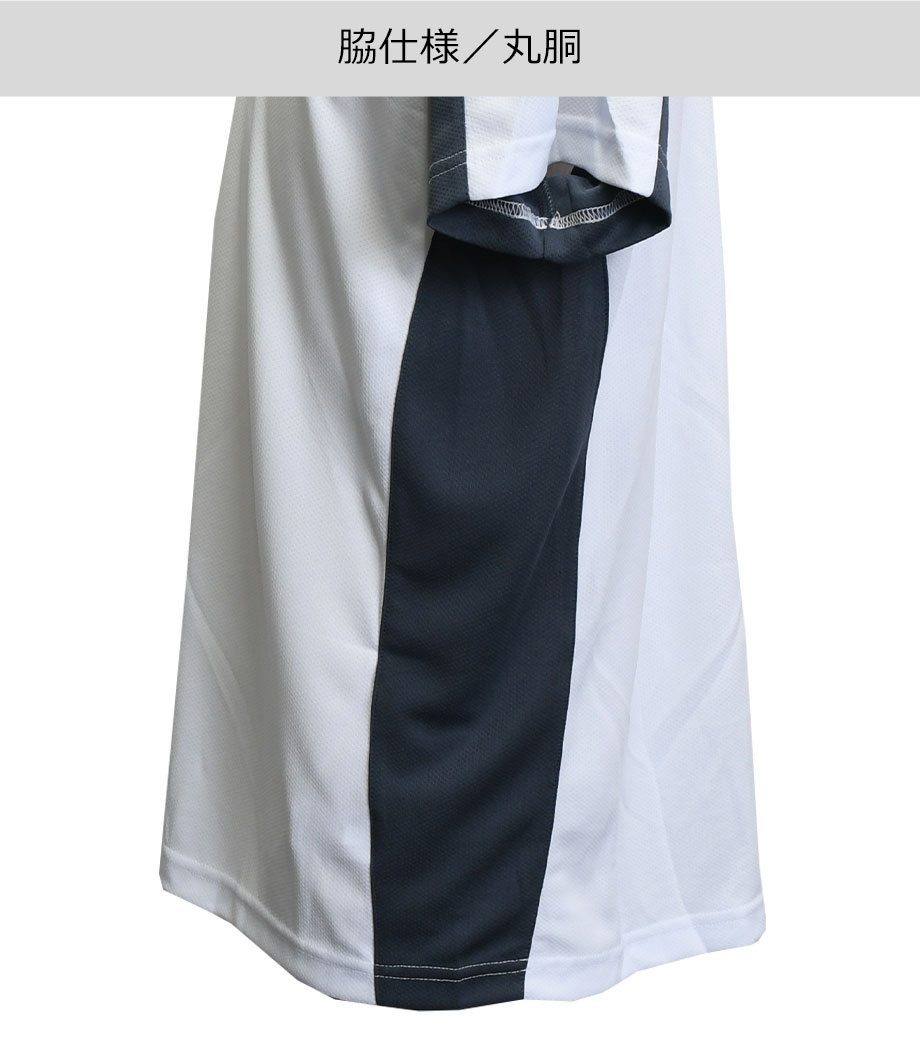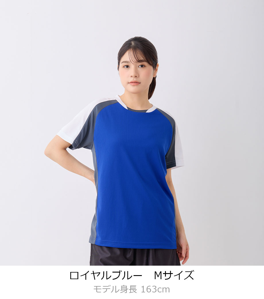 吸汗速乾性のあるポリエステル素材のTシャツです。伸縮性のあるフライス編みの襟で着脱しやすく、襟から脇にかけて切り替えられたラグラン袖が肩や腕の動きをスムーズにサポート。シンプルながらもスポーティなデザインが魅力です。