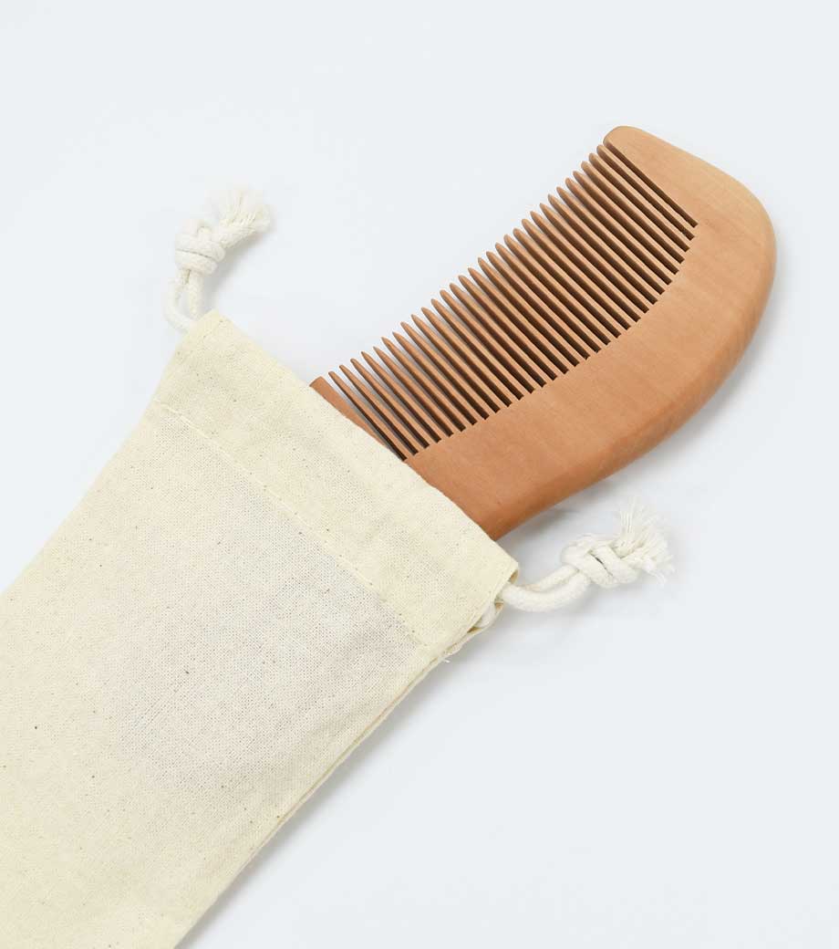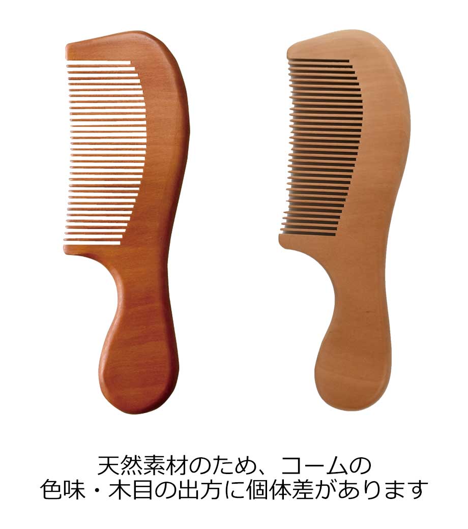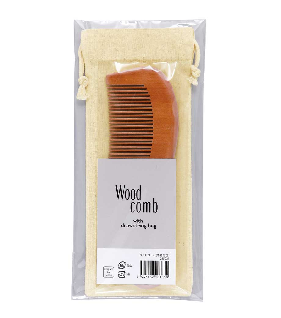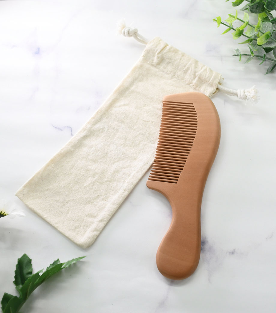 ウッドコーム(巾着付き)は、なめらかな触り心地が魅力の桃の木製。プラスチック製に比べ、静電気が起きにくく切れ毛になりにくいのが特徴です。髪のホコリや汚れも取ってくれて、誰でも手軽にヘアケアができます。持ち手が付いているので握りやすく、しっかり髪をとかすことができますよ。旅行などにも持っていきやすい巾着袋付きです。