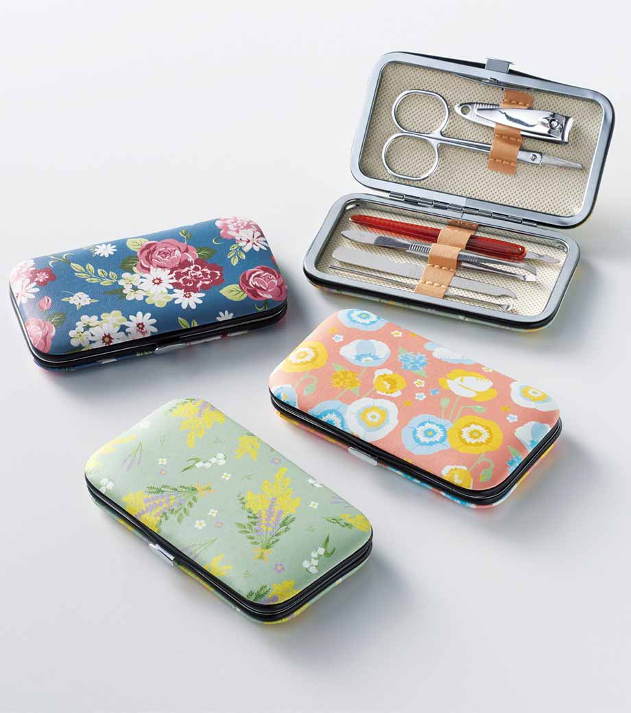ハサミ・爪切り・爪やすり・毛抜き・甘皮取り・耳かきの6点を収納ケースに収めた便利なグルーミングセットです。ケースは横のボタンを押すだけで開閉でき、しっかり蓋が閉まるので中身が飛び出さず安心。旅行や防災バッグに入れておけば、外出先や緊急時でも身だしなみを整えることができます。上品な花模様デザイン3柄アソートでお届けします。ネイルサロンや美容イベントの記念品に最適です。