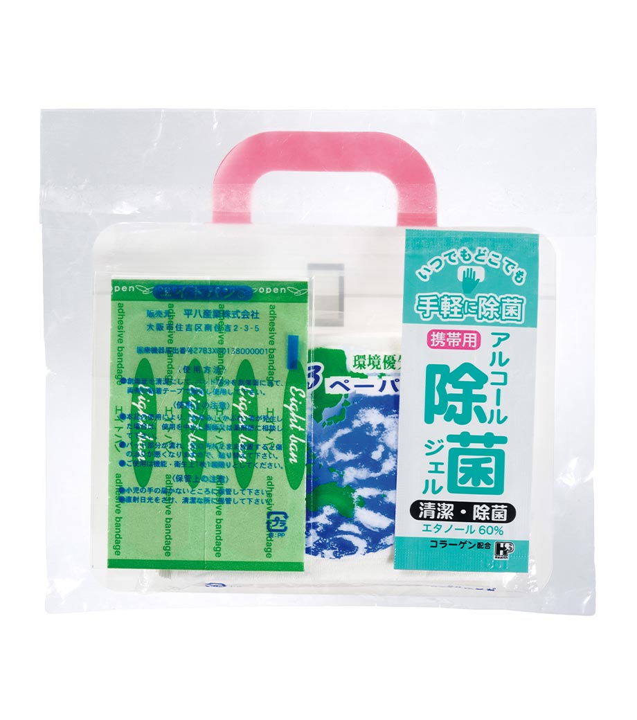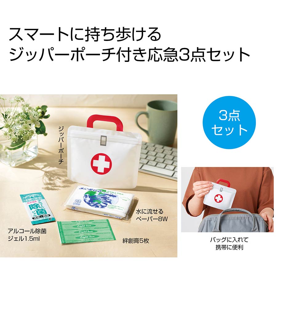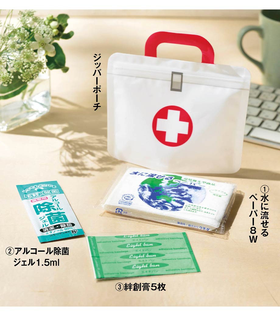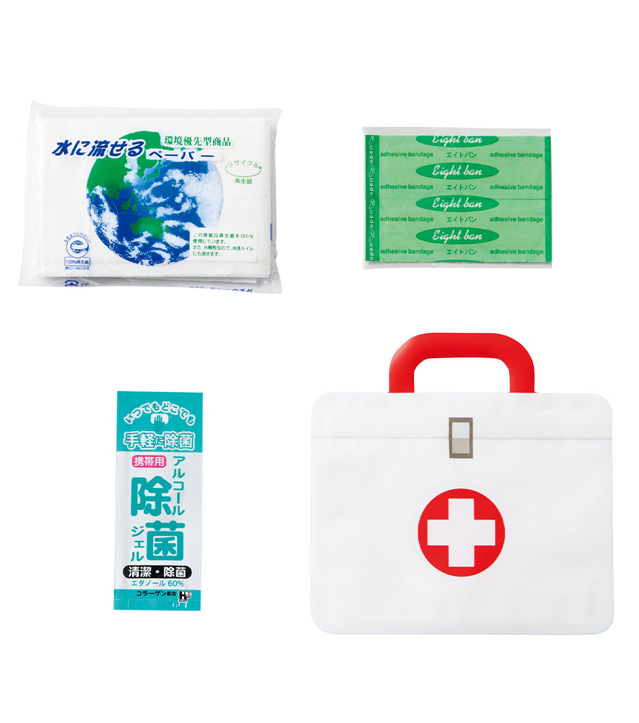 水に流せるペーパーや絆創膏、除菌ジェルをコンパクトにまとめました。薄型設計の専用ジッパーポーチ入り。毎日の携帯にも便利です。セット内容はオリジナルにカスタマイズ可能で、用途やターゲットに合わせた特別仕様の防災・衛生アイテムとして活用できます。お子様のスポーツや外出時のバッグに忍ばせておけば、いざという時にも安心。参加特典のばらまきノベルティとして人気です。