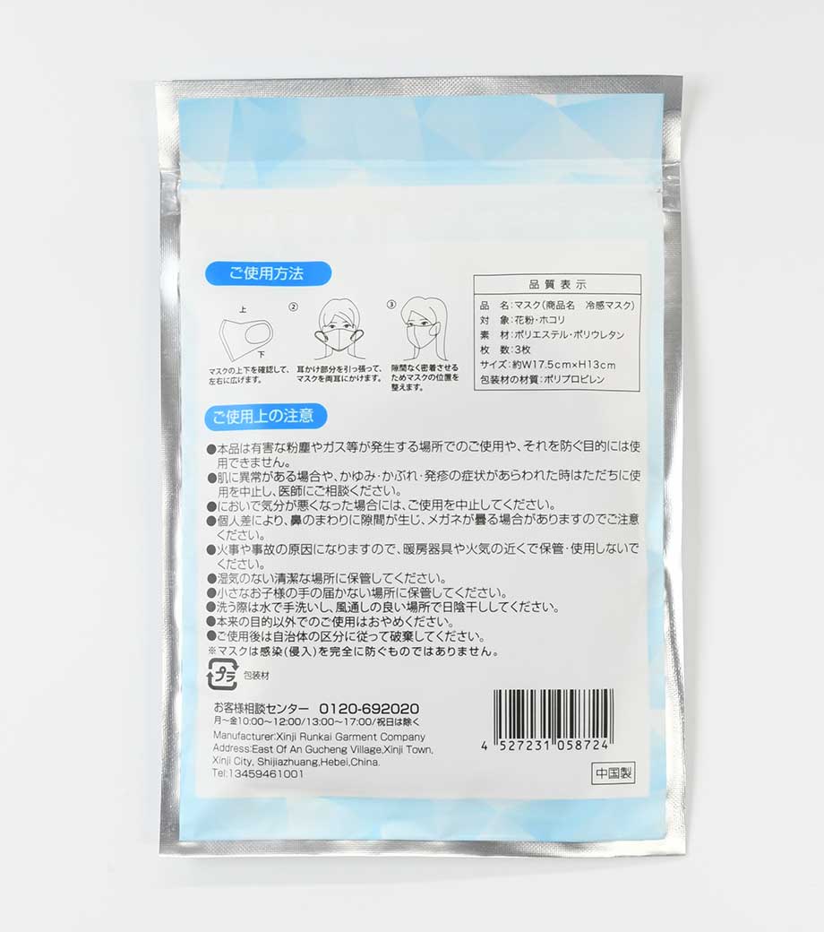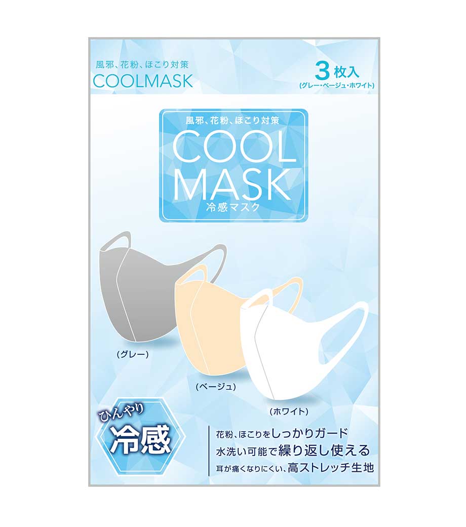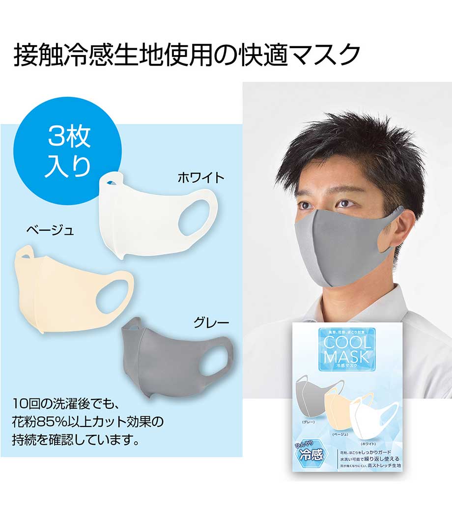 冷感マスク3枚入りは、暑い季節でもひんやり快適な接触冷感生地使用のマスク3枚入りです。繰り返し洗えるので衛生的。花粉、ホコリもしっかりガードします。メーカーの検査により、10回の洗濯後でも花粉85%以上カット効果の持続が確認されています。ストレッチ性が高く耳が痛くなりにくい生地です。ホワイト、ベージュ、グレーの3色セットなので家族で使い分けができますね。