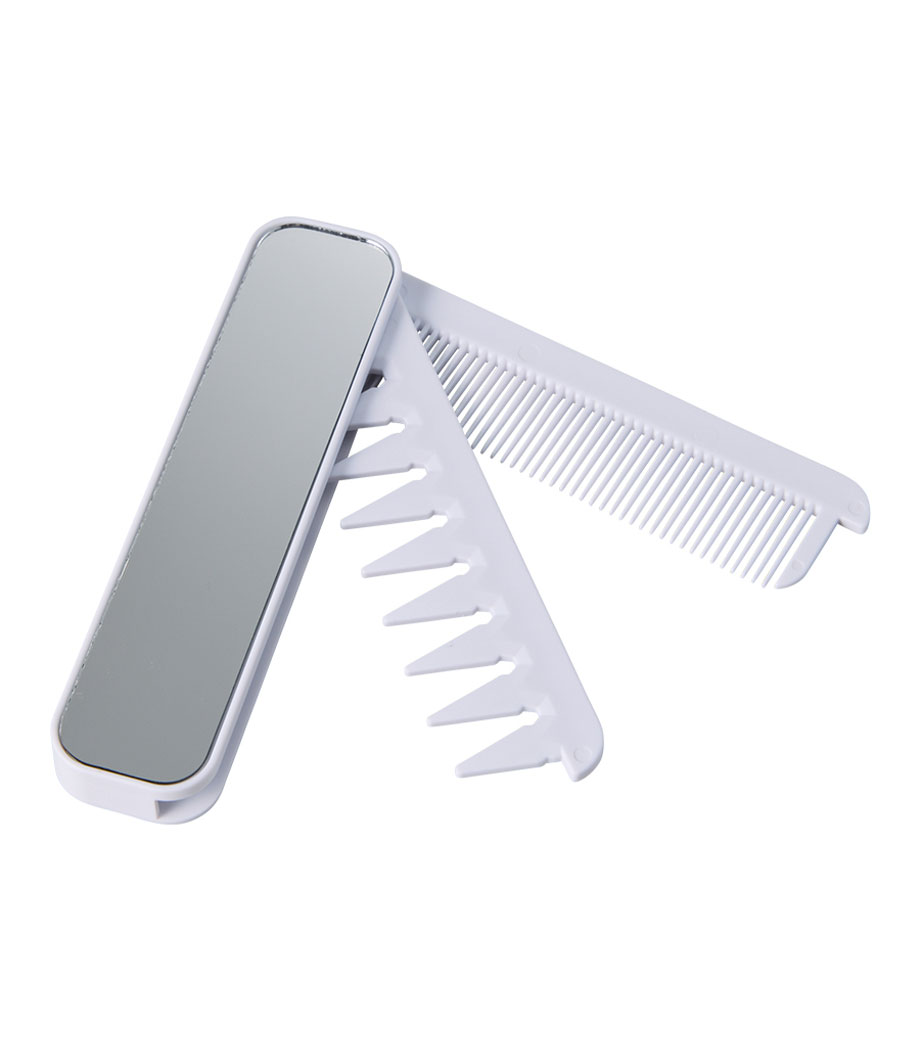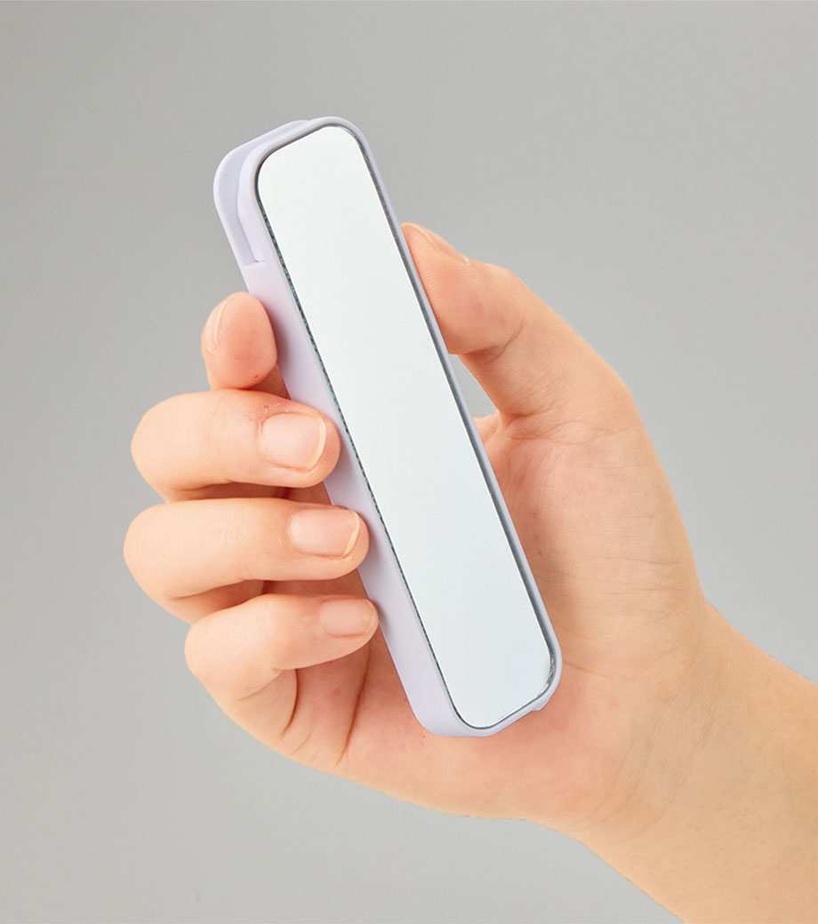 薄型で胸ポケットやポーチにスッと入れられる携帯用のエチケットブラシです。スライド式でもう一面にはミラー付き。身だしなみやメイクのチェックができます。
