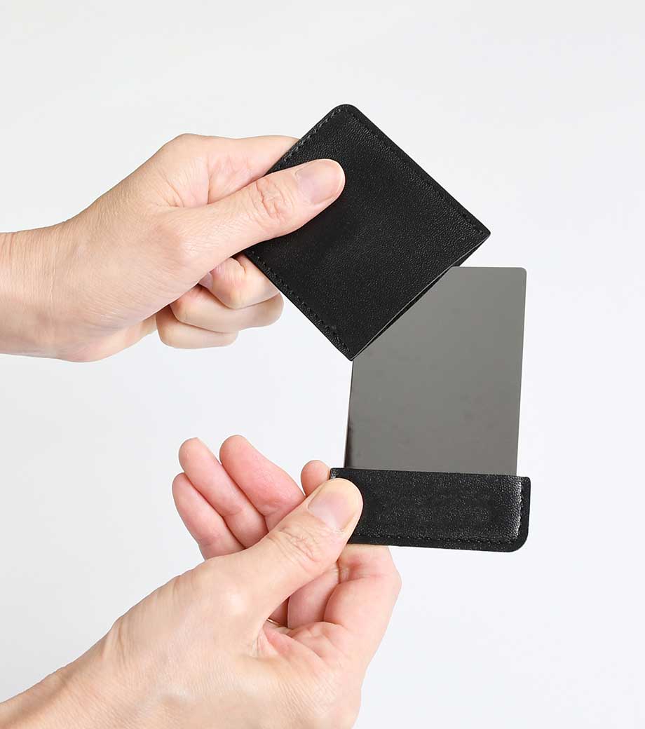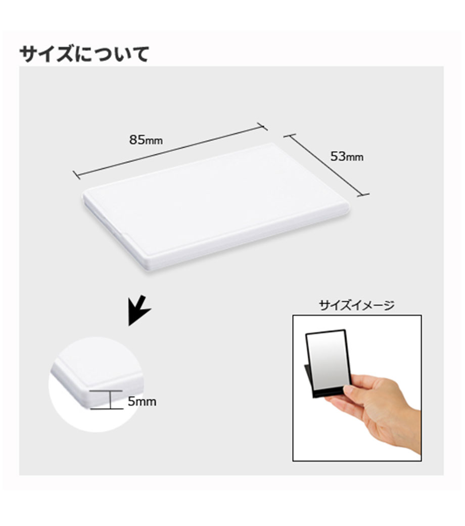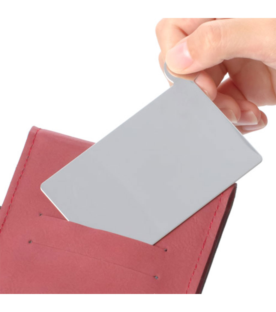丸い持ち手がついているのは、鏡面が指紋で汚れないようにする工夫。クレジットカードサイズなので、財布や定期入れにすっと入れることができます。