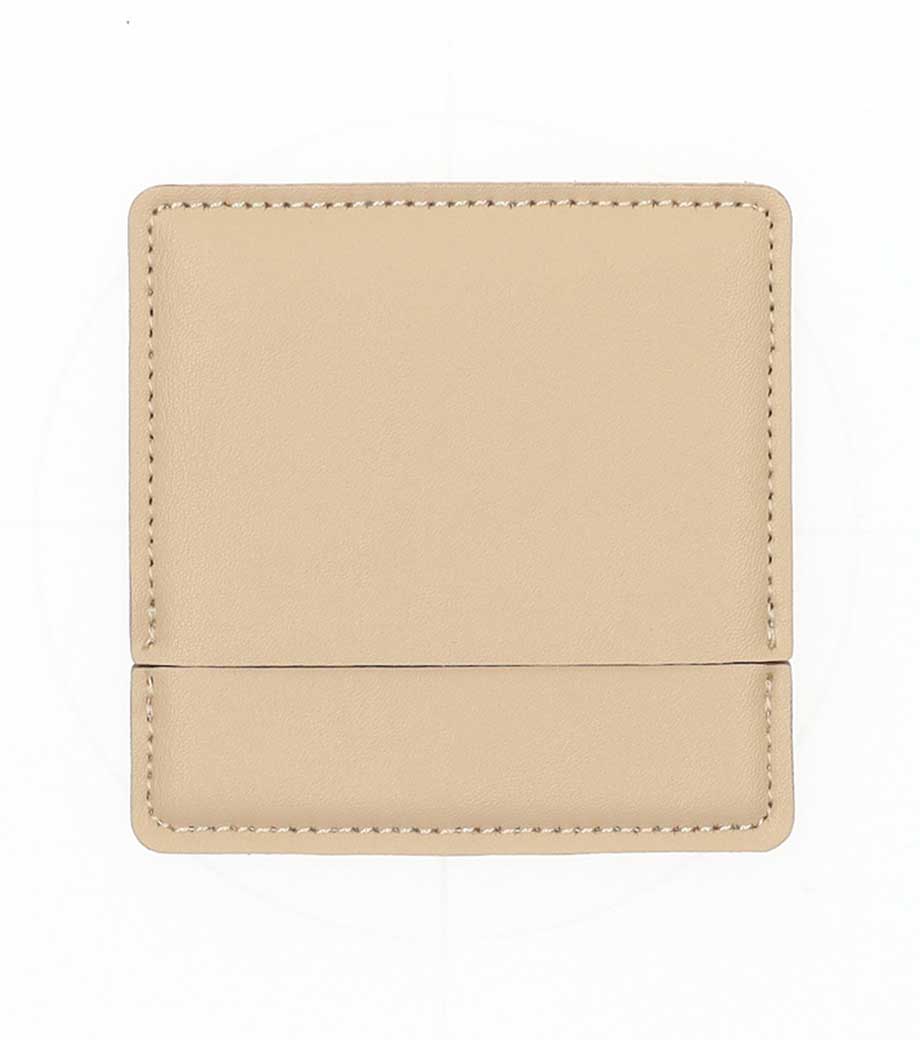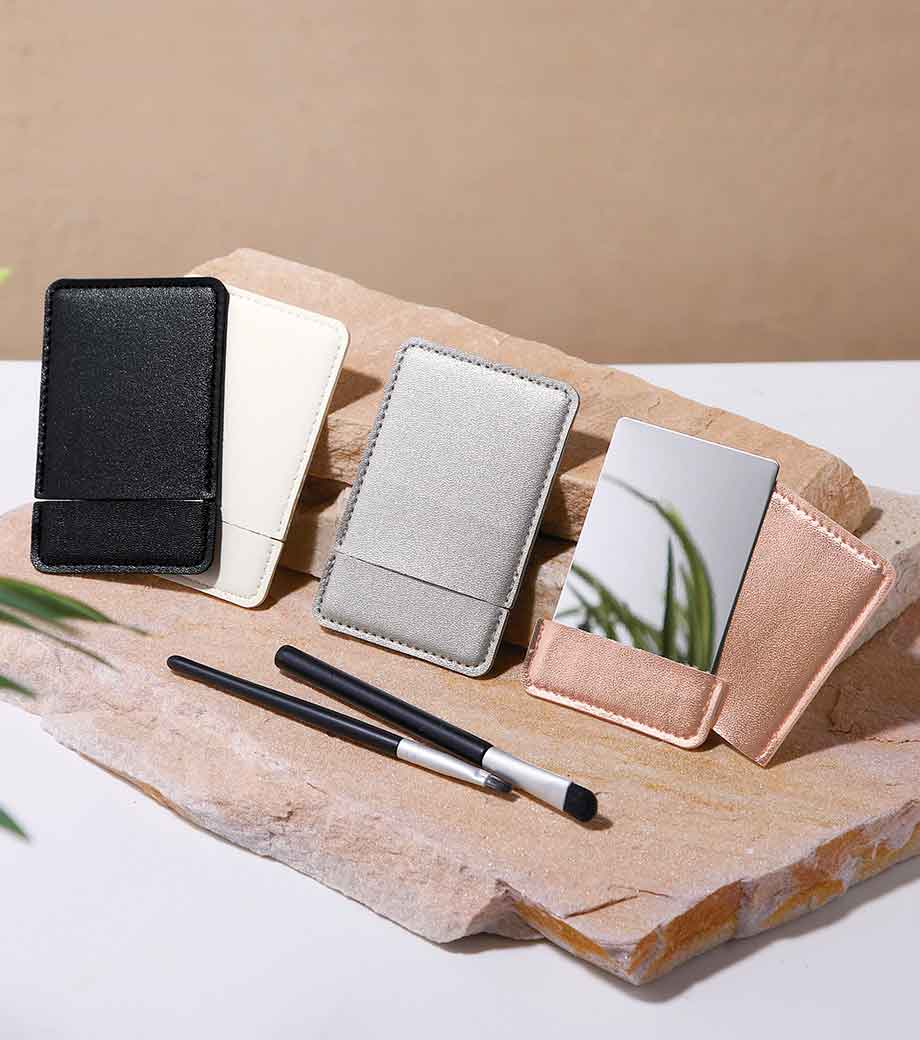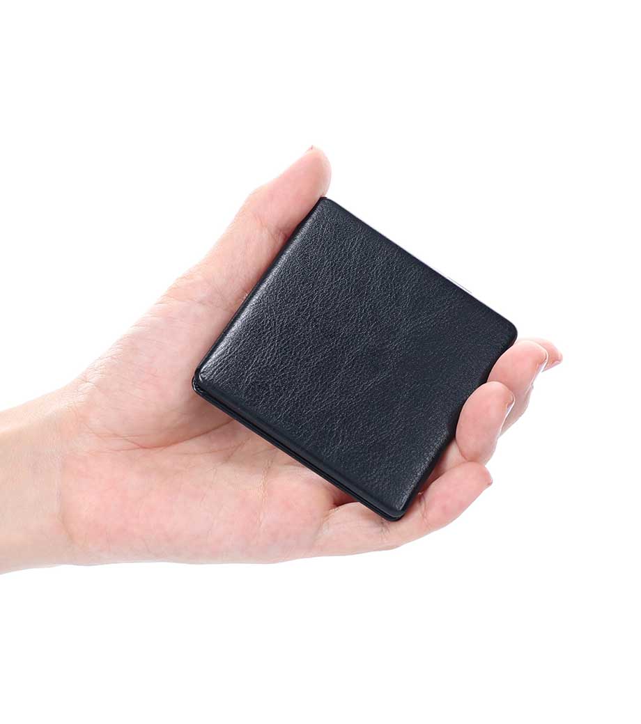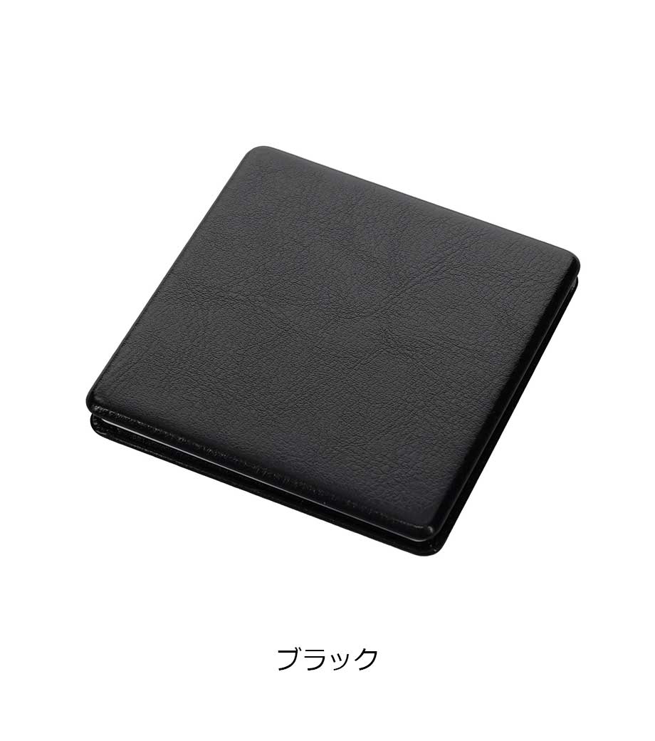 レザー調のケースが高見えするコンパクトミラー。等倍鏡と拡大鏡の2面タイプで、シーンに合わせて使い分けられます。スタイリッシュなスクエア型で、男女問わずお使いいただけます。