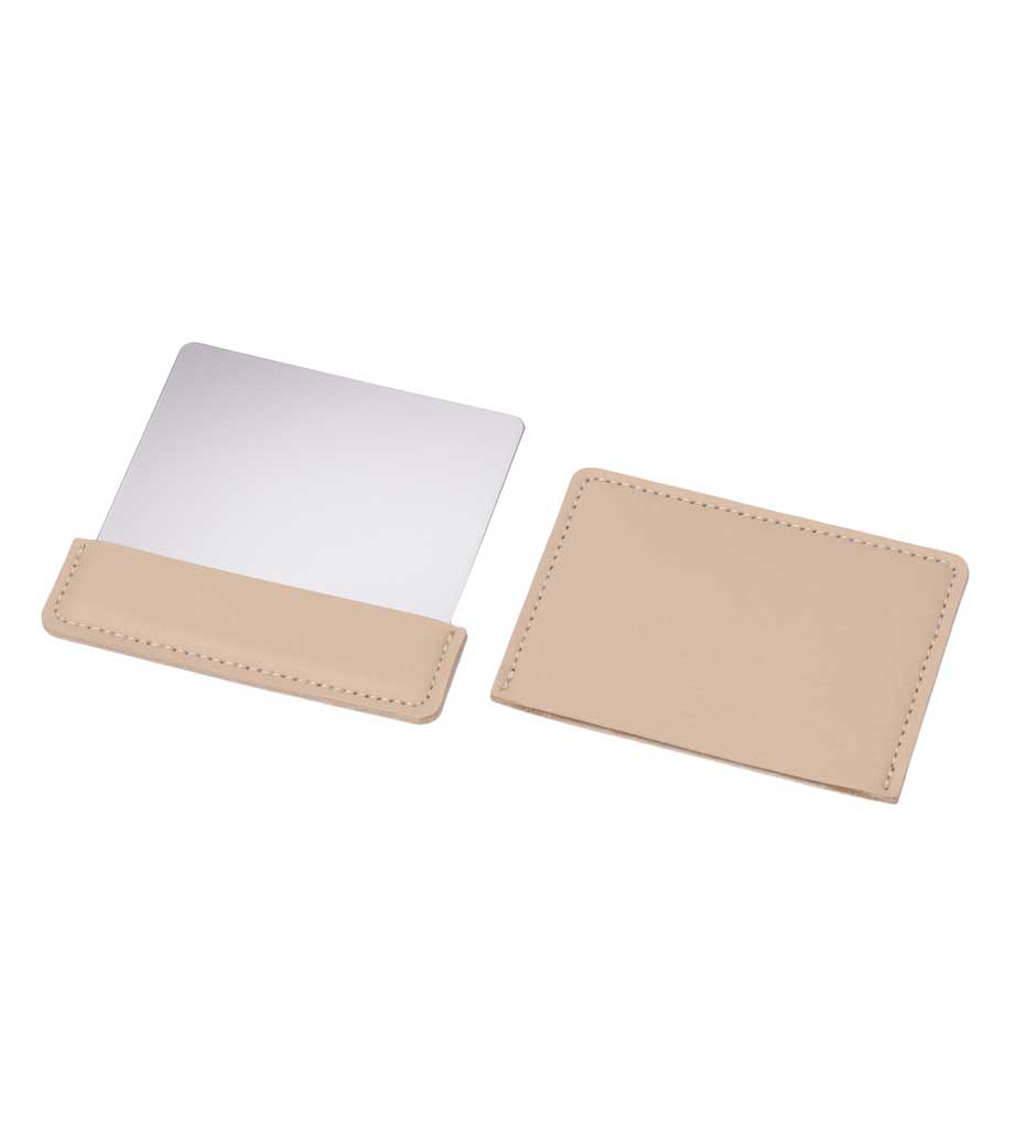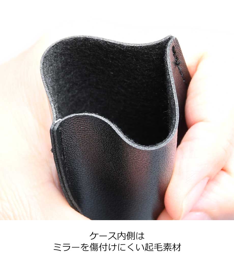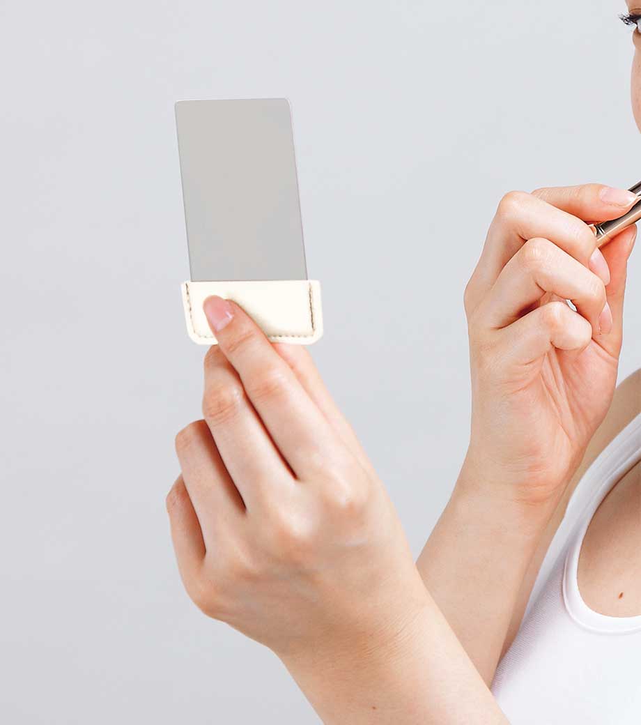 スリムプレートミラーはレザー調ケース入りのコンパクトミラー。出し入れが簡単なスライド式で、スマートにお化粧直しや身だしなみチェックができます。ケース下部はそのまま持ち手になるので、ミラーに指紋が付かないのが嬉しいポイント。ステンレス製ミラーなので割れる心配もありません。