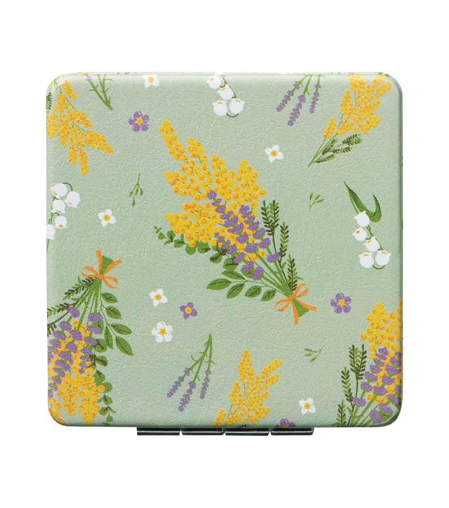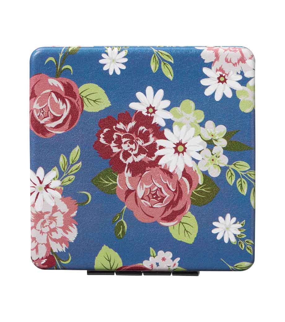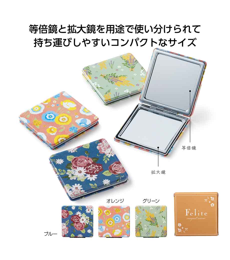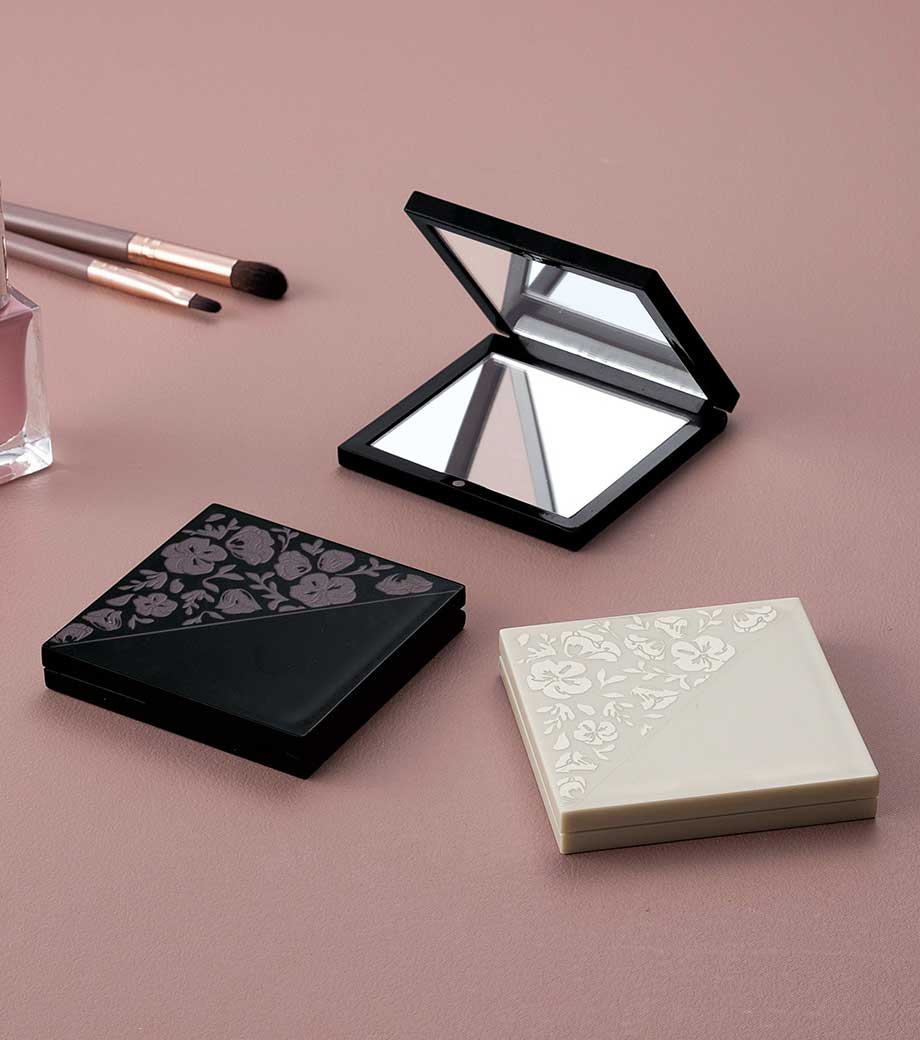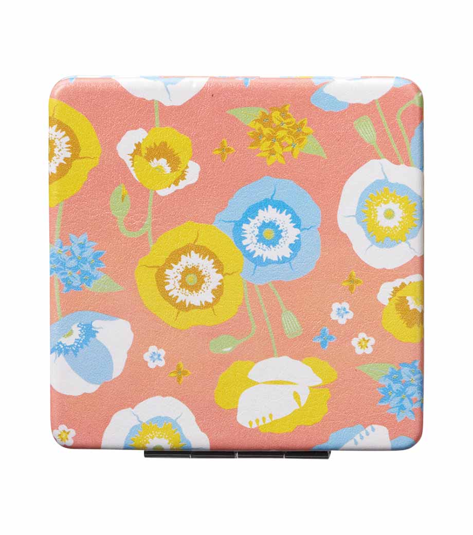 等倍鏡と拡大鏡を使い分けできる便利な2面鏡です。コンパクトサイズなのでポーチに入れてもかさばらず、外出先でのアイメイクや口元の化粧直しに重宝します。細部まで美しく仕上げたい方におすすめの必需品。上品な花模様デザインの3柄アソートでお届けし、女性に喜ばれるアイテムです。エステサロンのオープン記念品や美容イベントのノベルティにいかがですか。