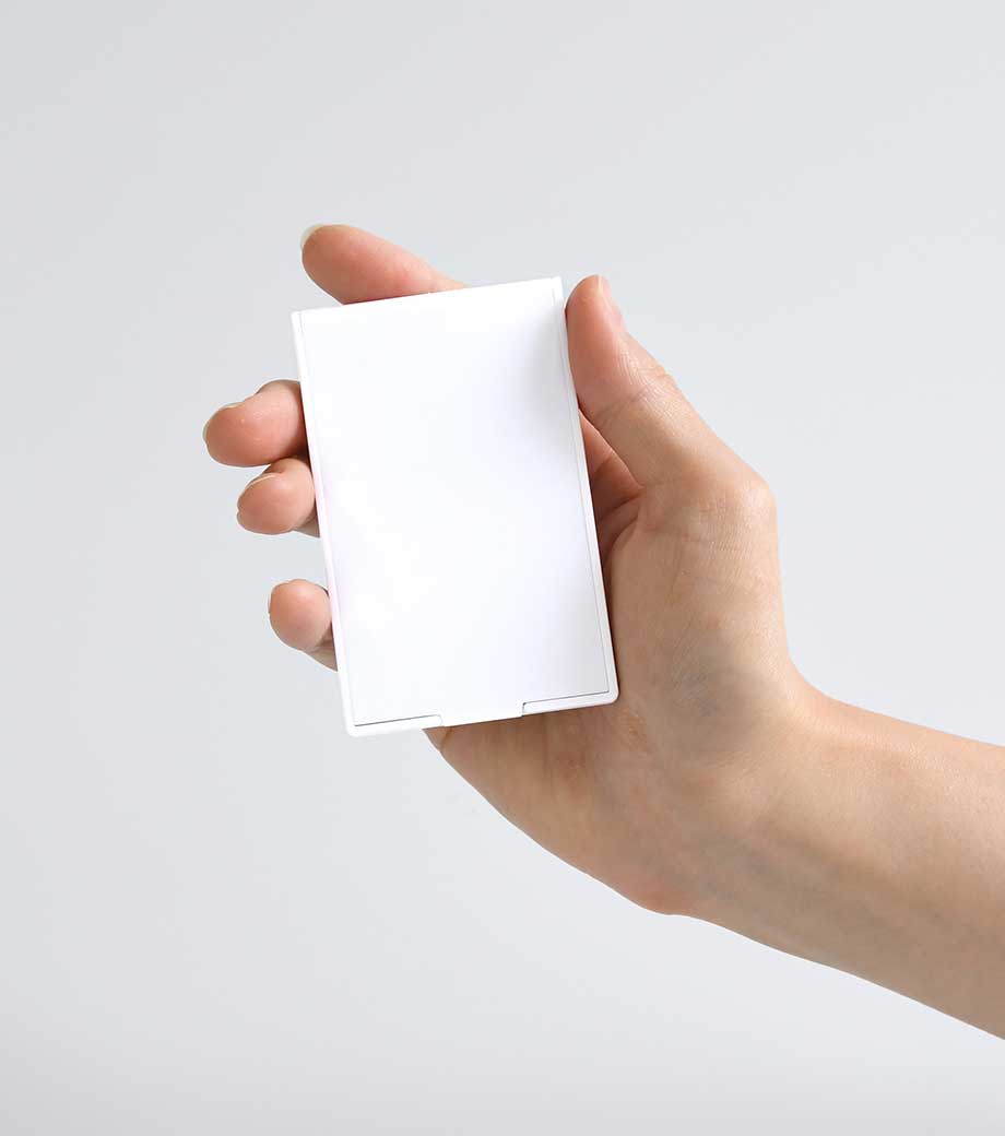 ホワイトミラーは、ボディも価格もコンパクトなスタンド式ミラー。ちょっと気になる部分をチェックするのに便利です。フルカラー印刷で、オリジナルデザインも可能。印刷は、インクの発色に優れたインクジェットを採用。白地に鮮やかなカラーが映えます。