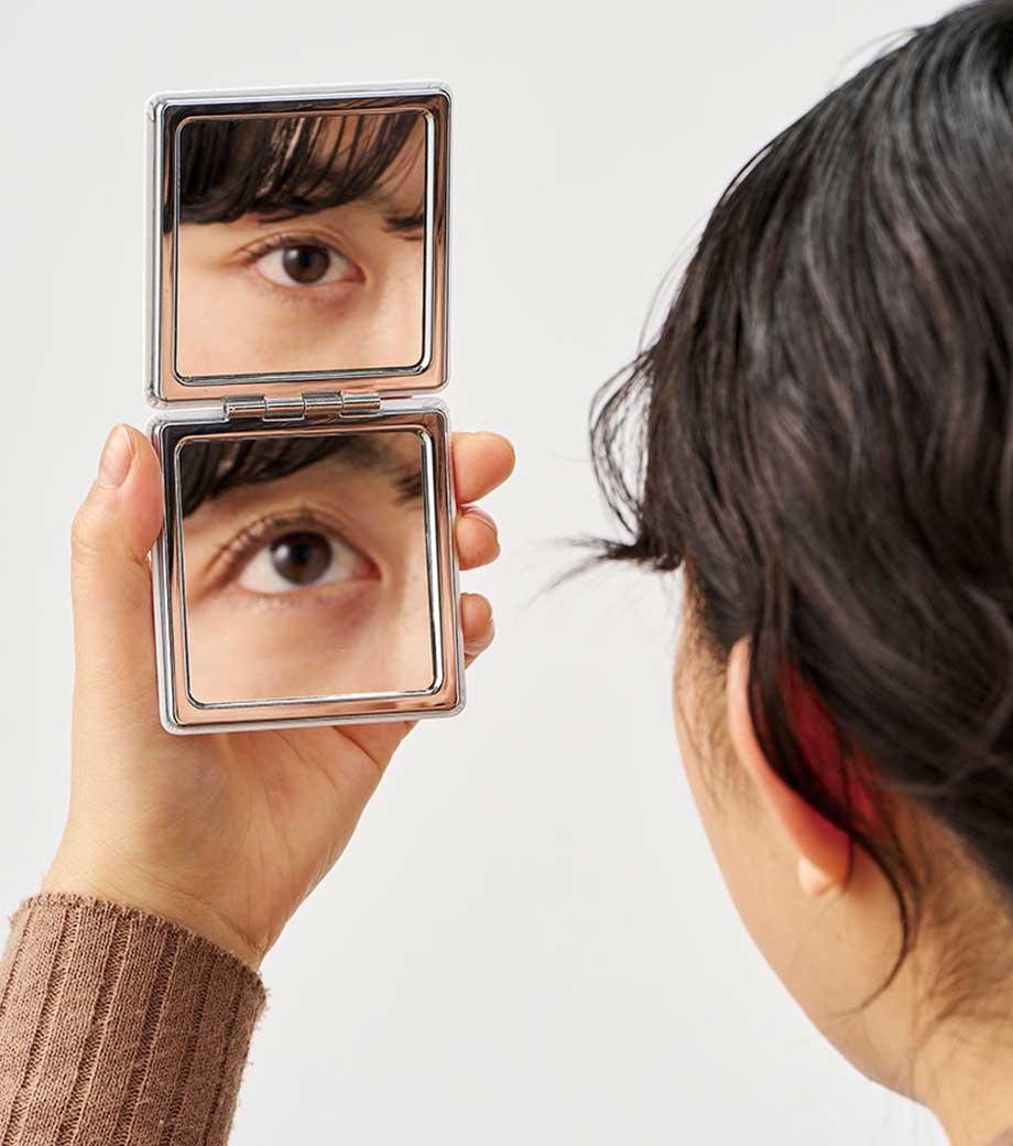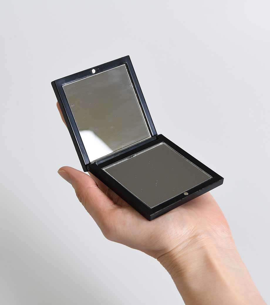 手の平サイズのミラーだから、ポーチやジャケットのポケットにもすんなり収納。必要なとき、いつでもどこでもサッと取り出し、メイク直しや身だしなみチェックができますよ!