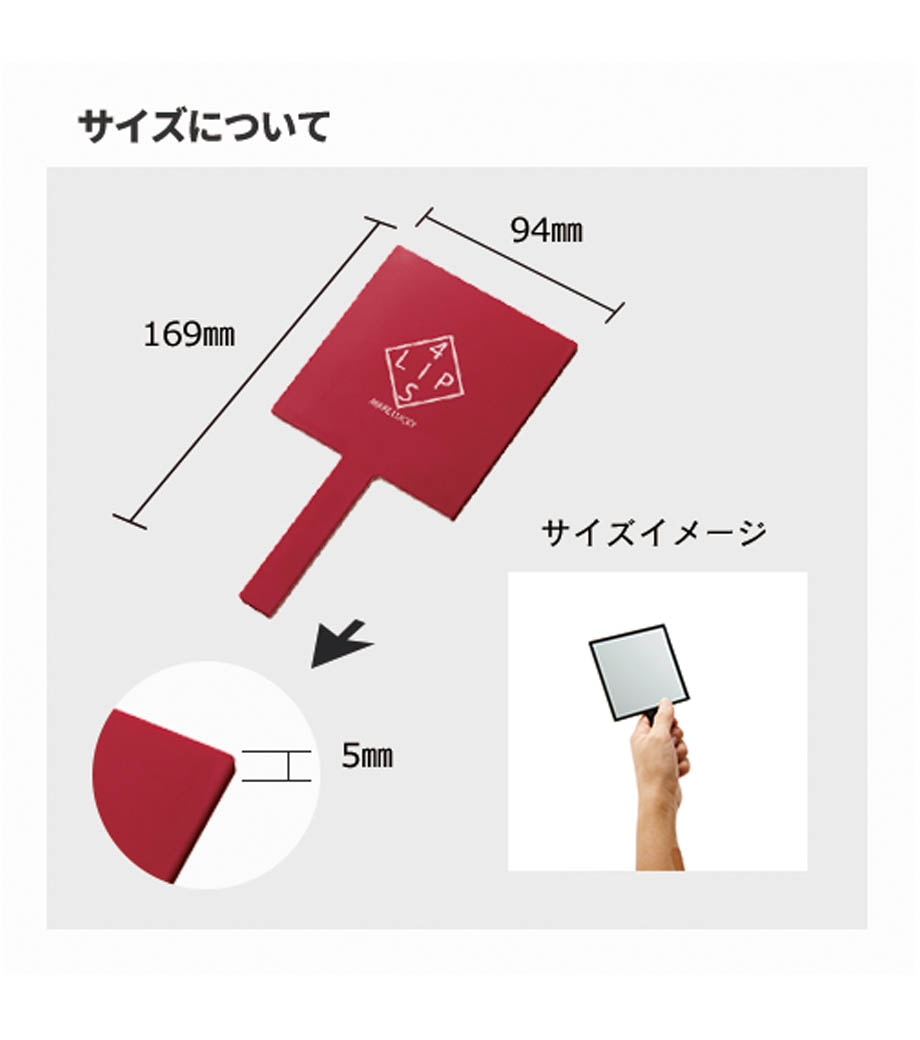 本体の角は丸みを帯び、サイズも手鏡として程よい大きさ。持ち手付だからミラーに指紋が付きにくいのも嬉しいですね。マットな質感でポップになりすぎず、コスメやアパレル業界向けの旬なノベルティとしてご提案いただけます。フルカラー印刷ができ、鏡面裏に大きく印刷面をとれます。注目のトレンドアイテムでインスタ映えするノベルティは、広告効果絶大です!