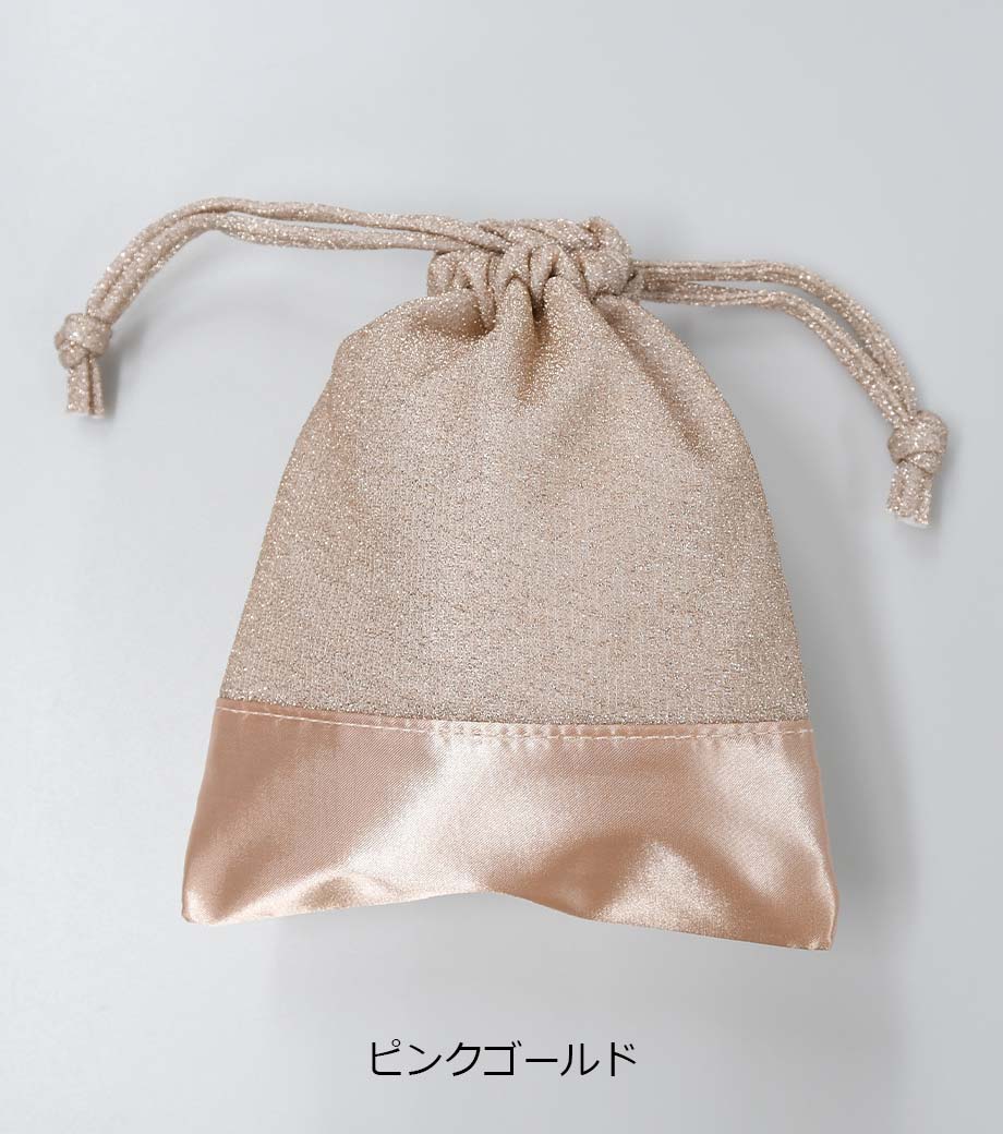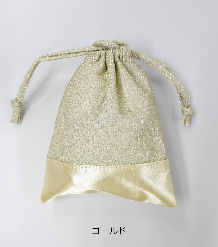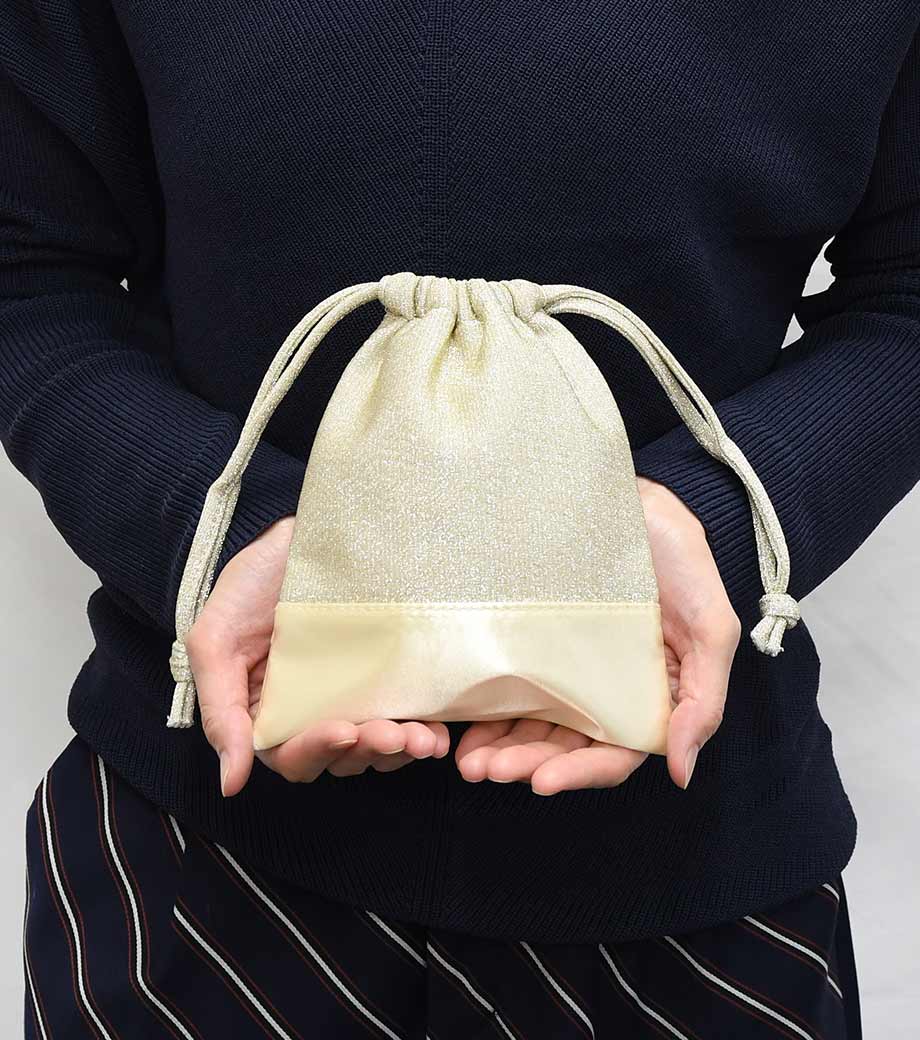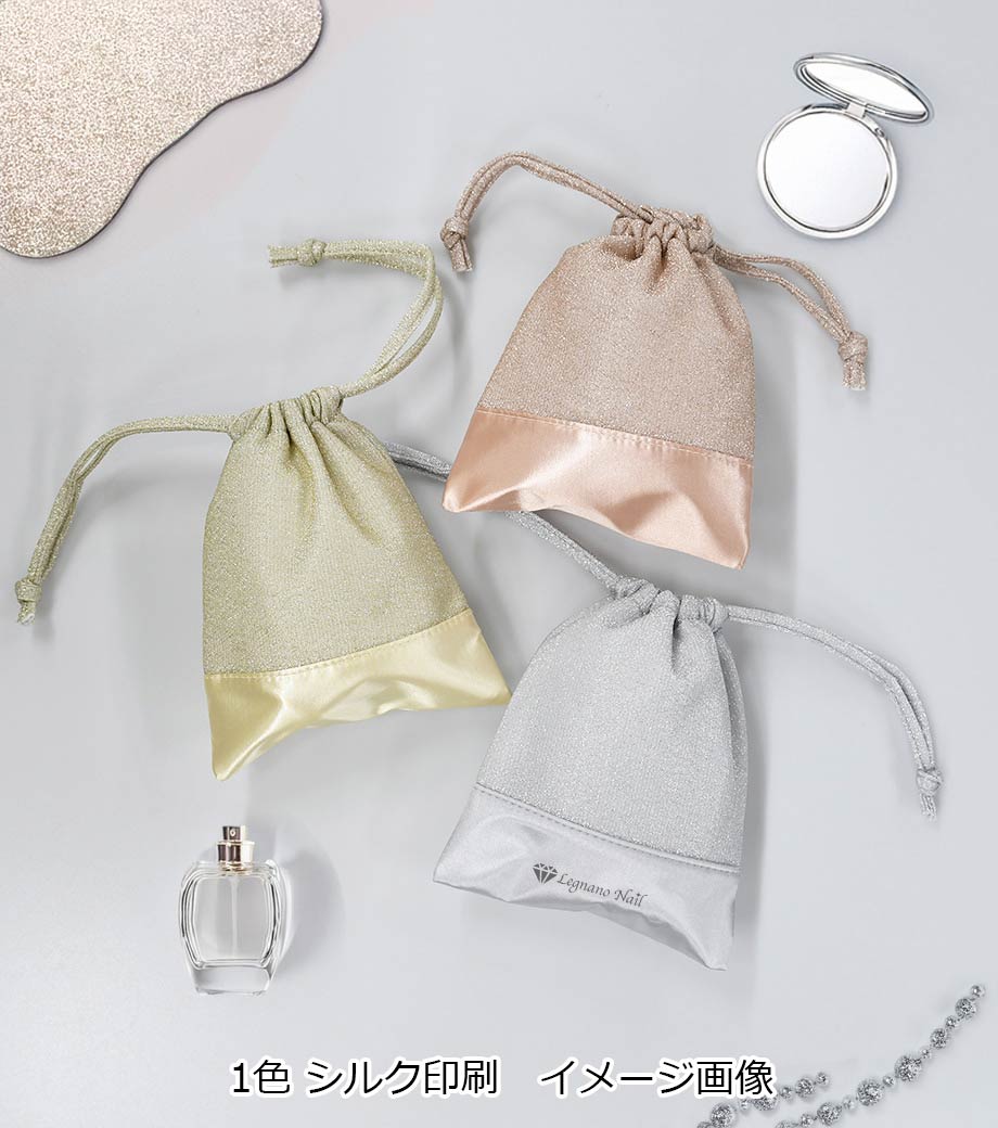 ラメ×サテンの輝きが目を引く、おしゃれなデザインの巾着です。コスメや雑貨を入れたギフトラッピングにぴったり!普段使いの収納アイテムとしても活用できます。見るだけで心が躍る、印象的なノベルティをお探しの方におすすめです。