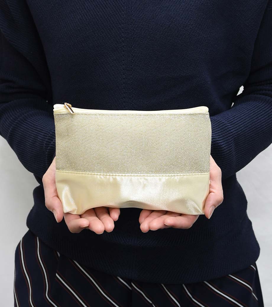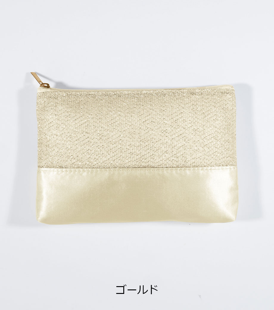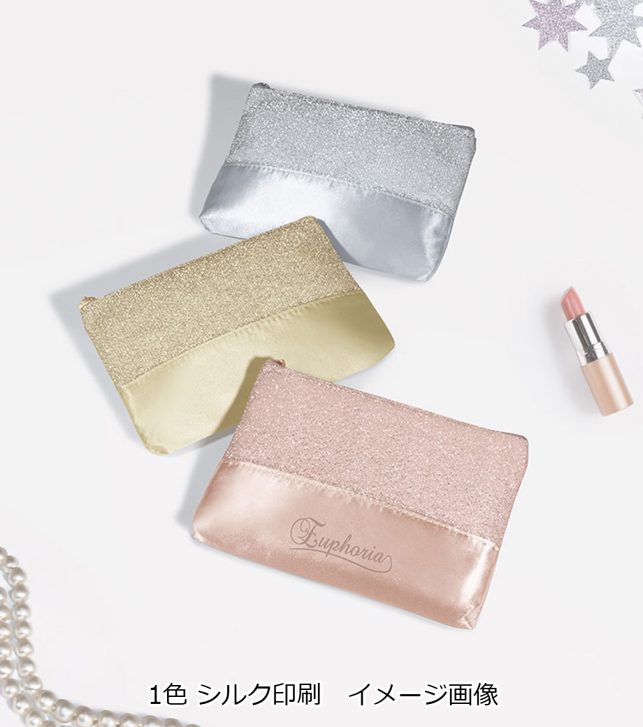 ラメが施された生地とサテン生地を組み合わせた、おしゃれなポーチのノベルティです。異なるタイプの輝きが華やかさを演出します。スリム形状なのでバッグに入れやすく、日常使いに便利。お直し用コスメやエチケット用品などを収納できます。イベントやパーティーなどのお出かけに持ち歩くのもおすすめです。