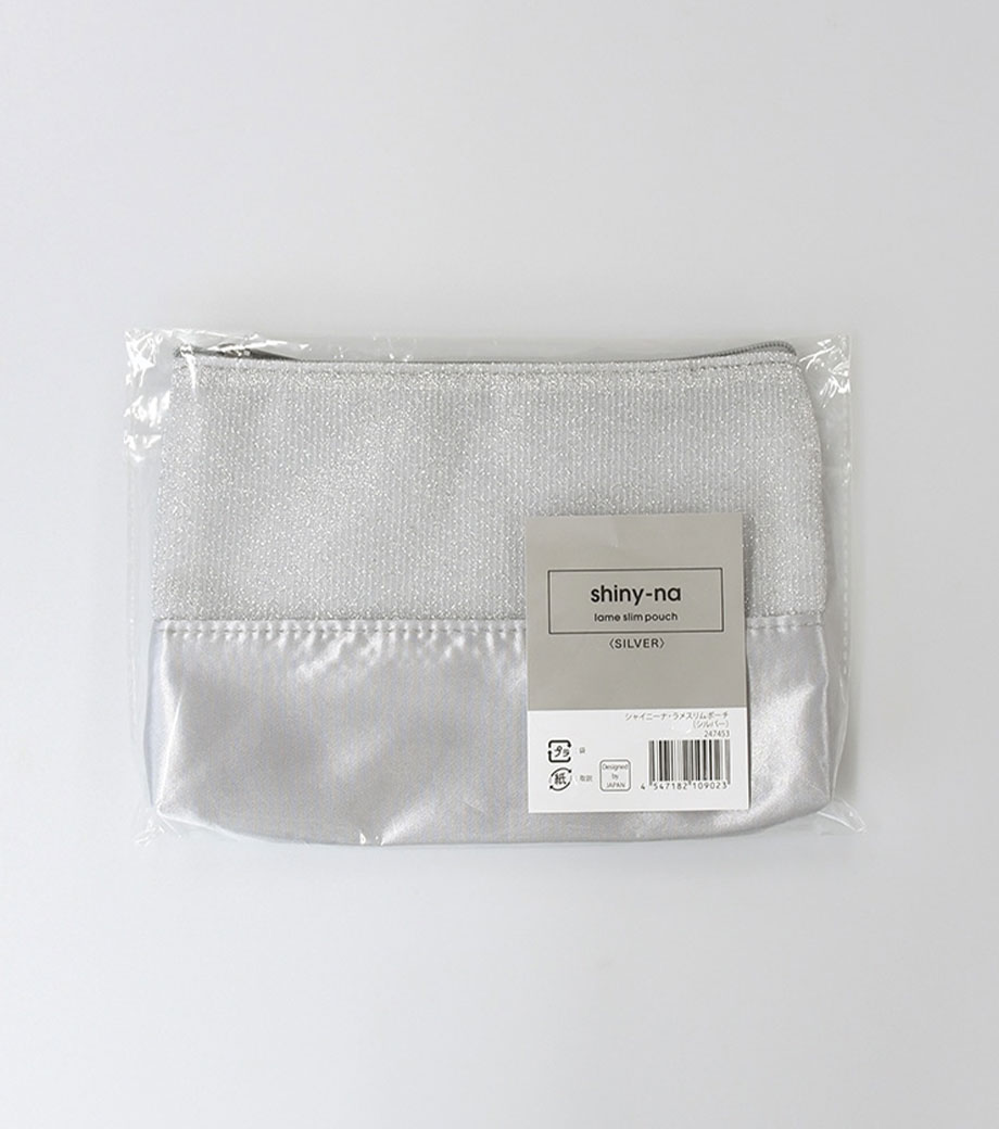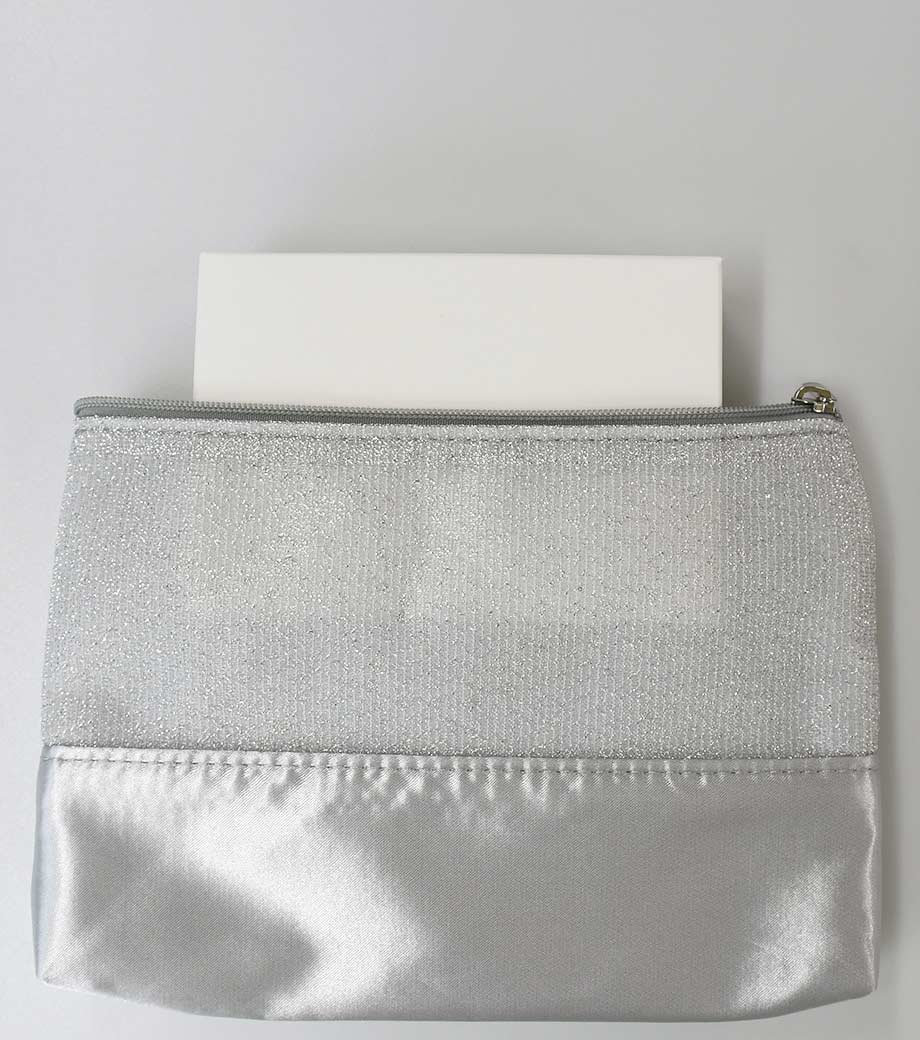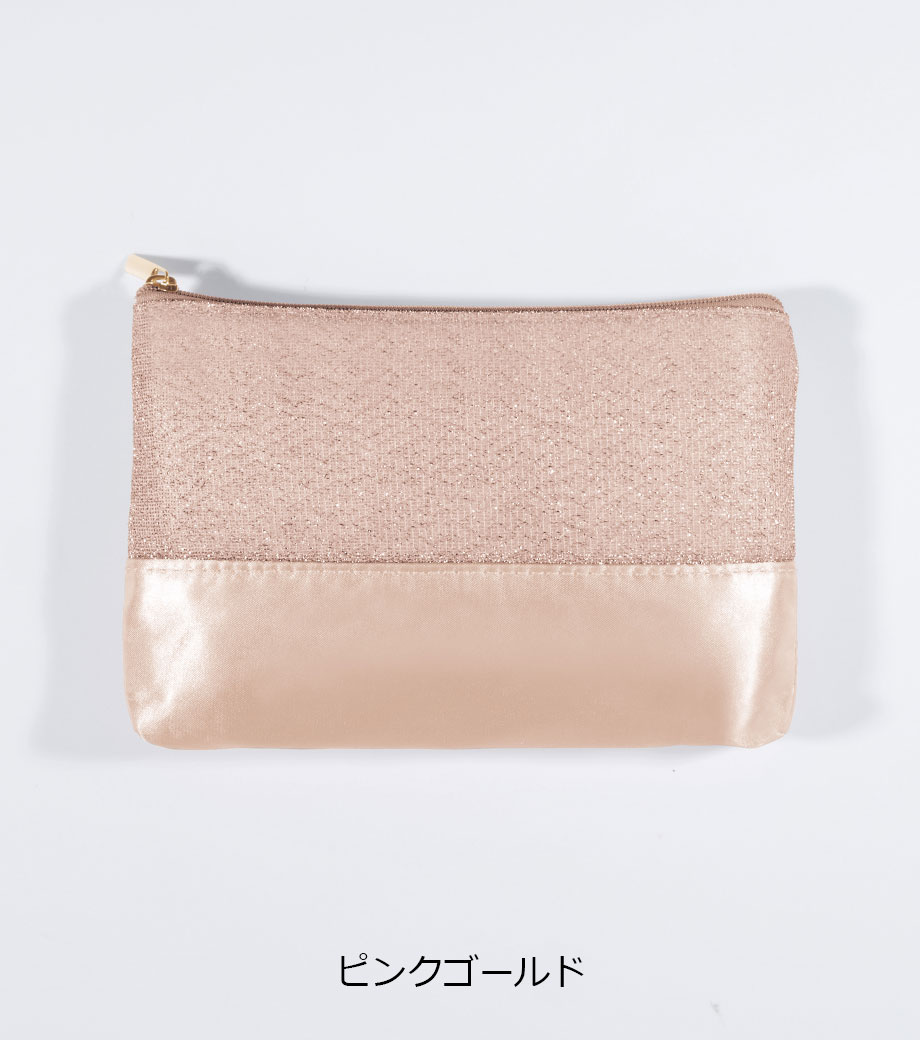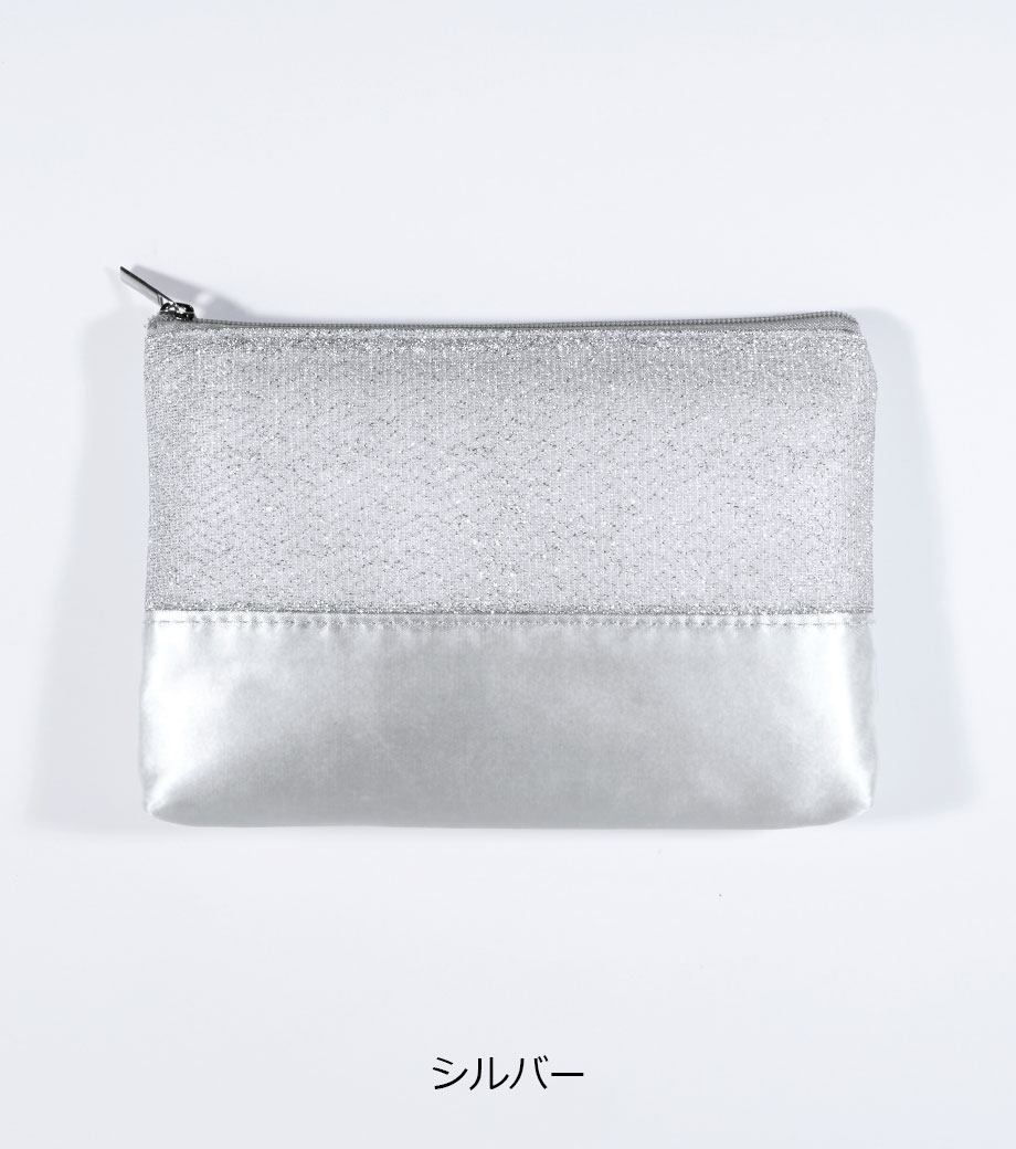 ラメが施された生地とサテン生地を組み合わせた、おしゃれなポーチのノベルティです。異なるタイプの輝きが華やかさを演出します。スリム形状なのでバッグに入れやすく、日常使いに便利。お直し用コスメやエチケット用品などを収納できます。イベントやパーティーなどのお出かけに持ち歩くのもおすすめです。