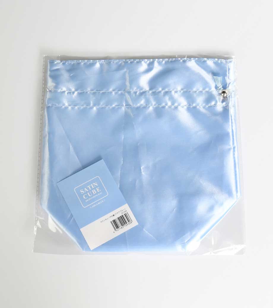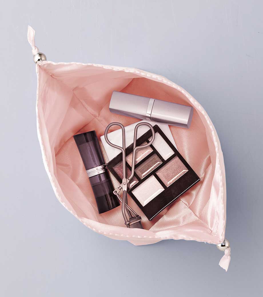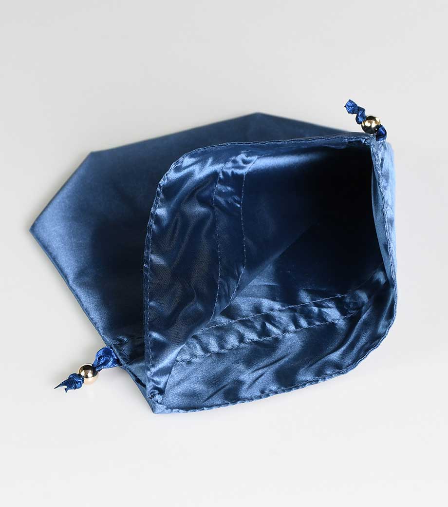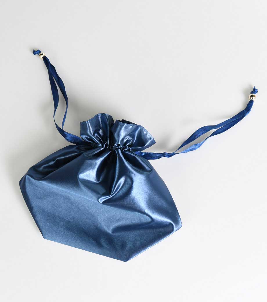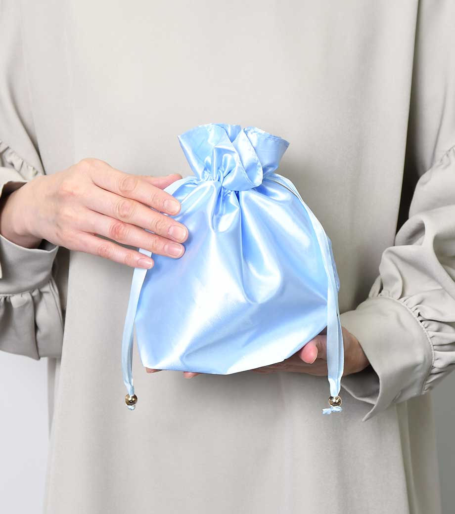 細部まで高級感にこだわった巾着です。光沢のあるサテン生地に紐の結び目の金具。マチ付きで、縫い代が内側にくるよう丁寧に作り込まれた2枚仕立て。サテンの艶っとした見た目に反して、予想以上にハリのある素材感です。リボン紐をぎゅっと絞ると、巾着の口がフリルになります。旅行中の小物整理や、美容アイテムの持ち運びにぴったりです。