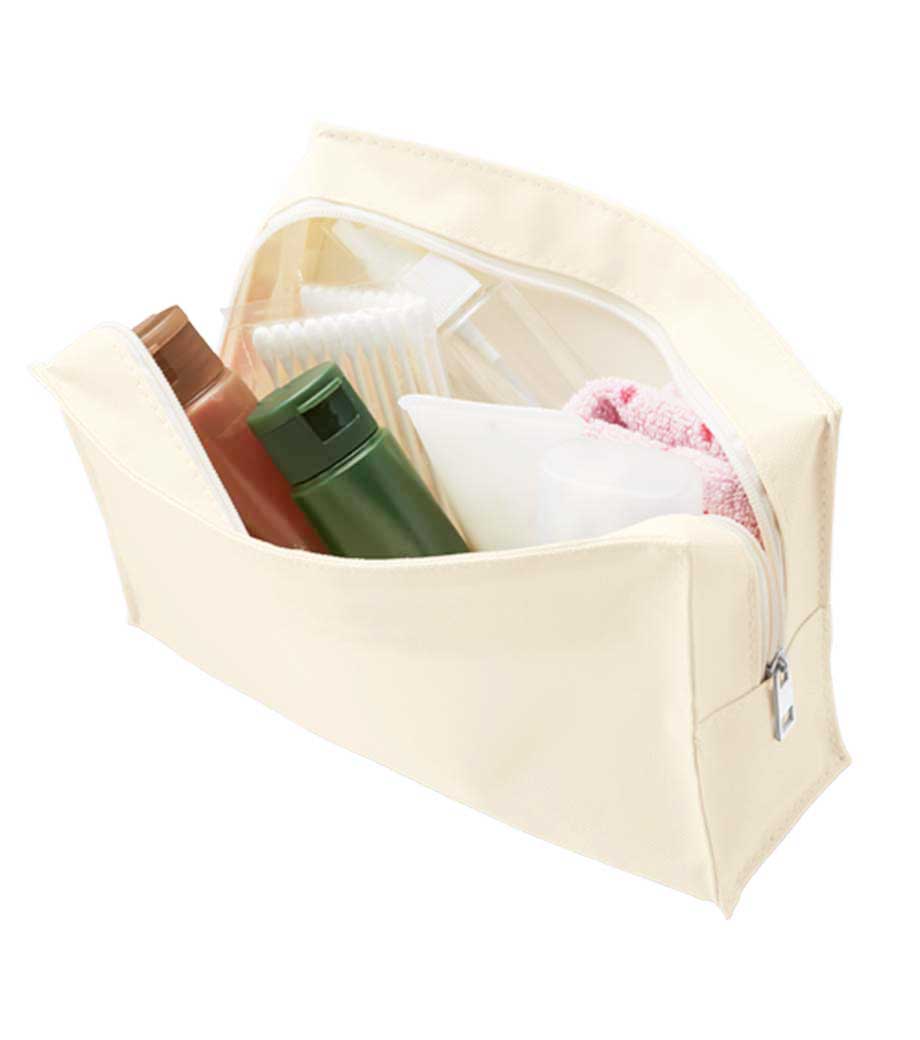 ベーシックスクエアポーチは、しっかりと自立するポリエステル素材のポーチです。内ポケットがついており、たっぷり入る大容量なので、コスメポーチからトラベル用の小物入れなど用途も色々。ファスナー部分がぐるっと長めについているので、開口部が広くなっています。使いたいものをパッと見つけられ時短にもなります。中身が飛び出さないストッパー付きで安心。