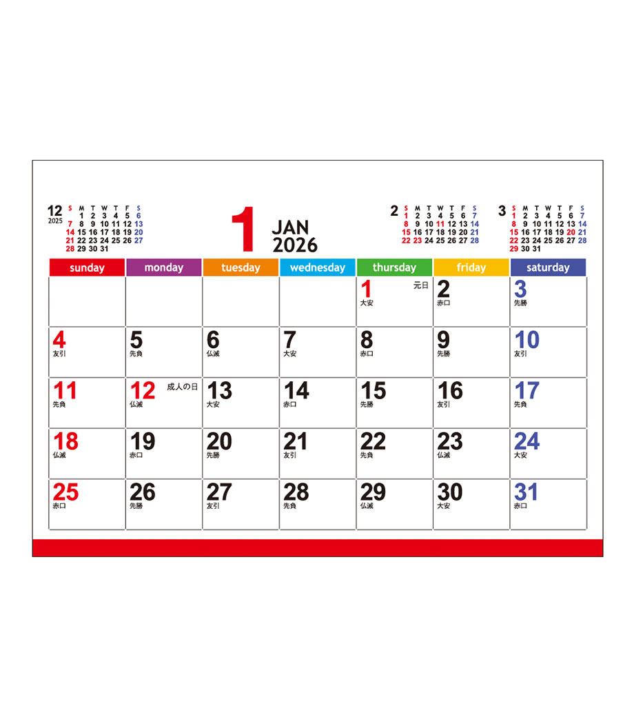 それぞれの曜日が綺麗に色分けされており、六曜も記載されているので行事の調整にも役立つしっかりとしたカレンダーです。記入欄も大きく取られているので、オフィスでもしっかりサポートしてくれる、貰って嬉しいノベルティです。