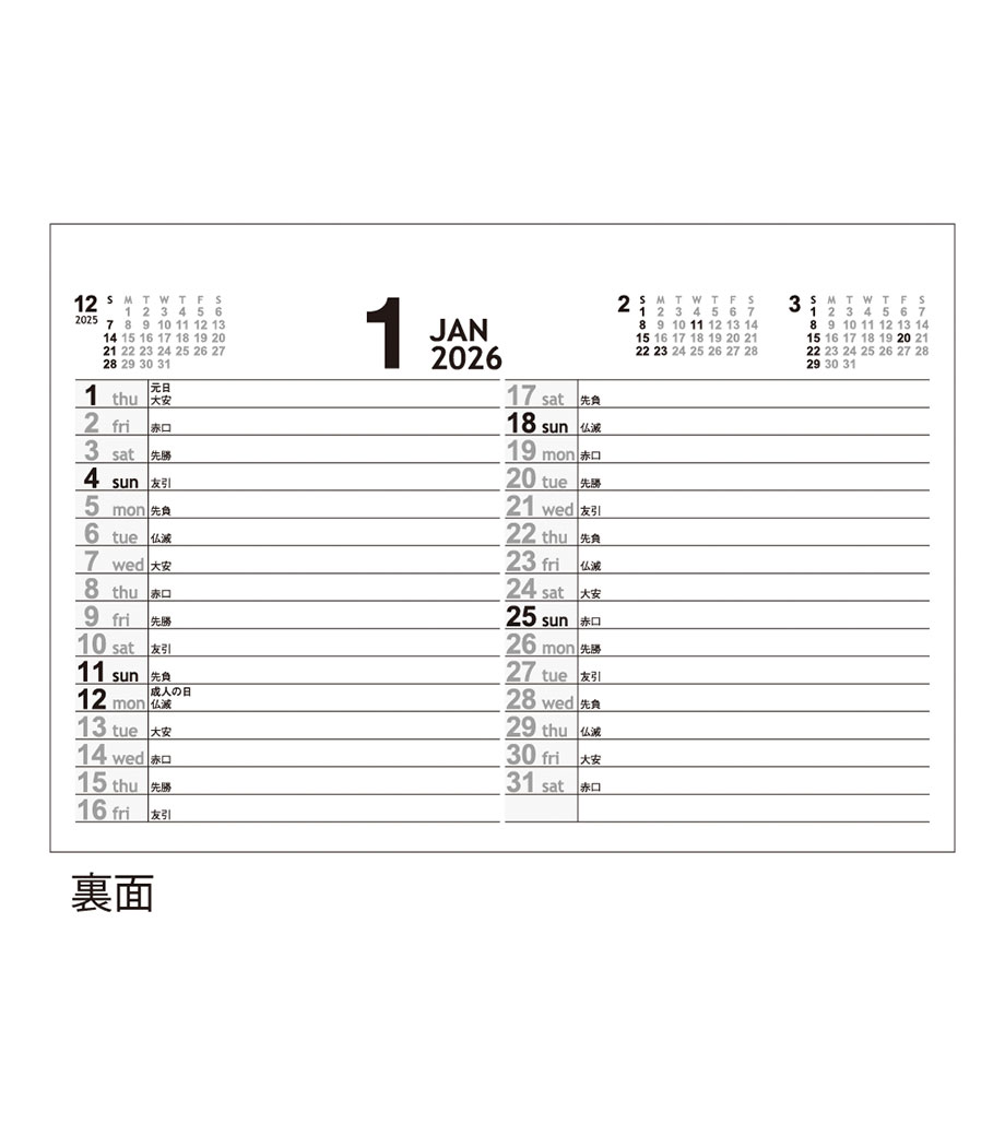 月ごとに色が変わるシンプルカレンダー。オフィスの受付やデスクに飾りやすいデザインです。西暦・和暦の両方が表記されていて、前後月のカレンダー入り。ビジネスシーンや冠婚葬祭に便利な六曜付きです。裏面はモノトーンカラーで横書きできるメモ欄があり、表・裏面お好みでスケジュール管理ができます。