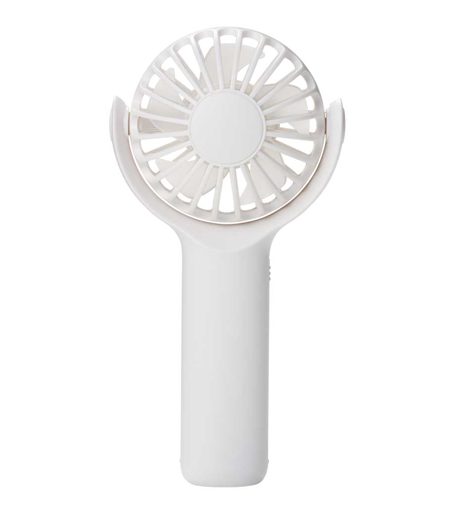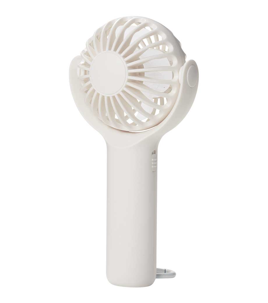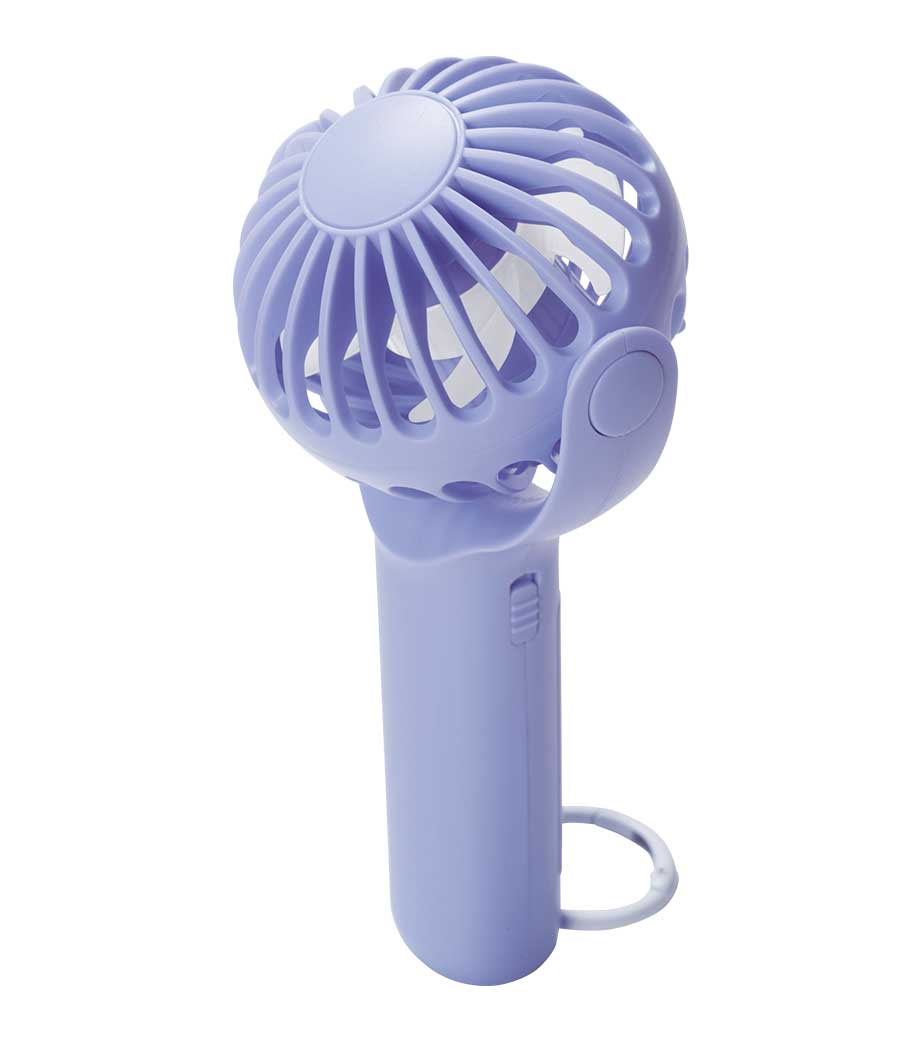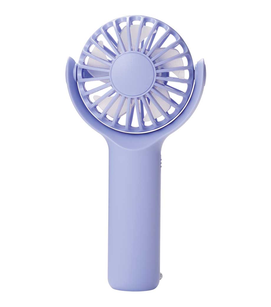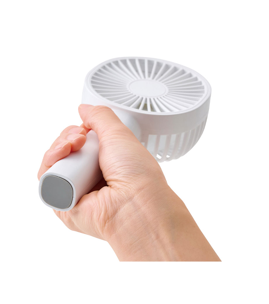 パワフルハンディファンは、卓上置き型でもハンディでも使える2WAYファン。電源ボタンを2度押しで電源ONと弱風。1回押すたびに、中、強、電源OFFと切り替わります。スイッチ2度押しで作動する設計は、鞄の中に入れても誤作動防止になり安心ですね。ファンの首部分は上向きに25度、下向きに20度の調節が可能。好みに合わせて風量と角度の調整ができて快適です。