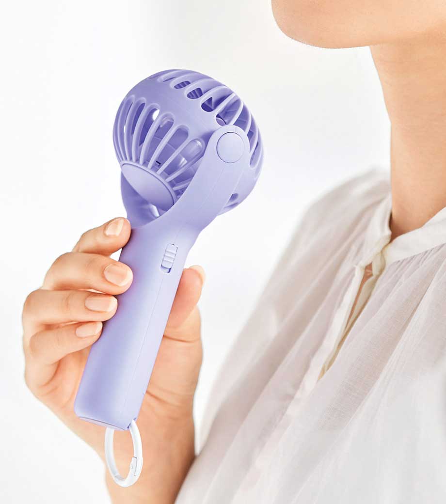 ファン部分は上下最大45度の角度調節が可能でどの角度でも涼しく快適。ハンディファンとしての持ち運びにも便利です。スイッチ2度押しで作動する設計は誤作動防止になり、鞄の中に入れても安心。