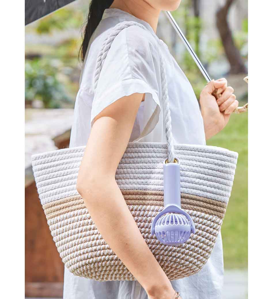 コンパクトハンディUSBファンは、スタンドにもなるフック付きのミニファン。持ち手に収納されているフックを引き出せば、バッグに取り付け可能。外出時の持ち運びも楽々です。フックを横に倒すと、スタンドタイプに変形。卓上置き型で使用できるので、室内でも移動中でも涼しく快適に過ごせます!