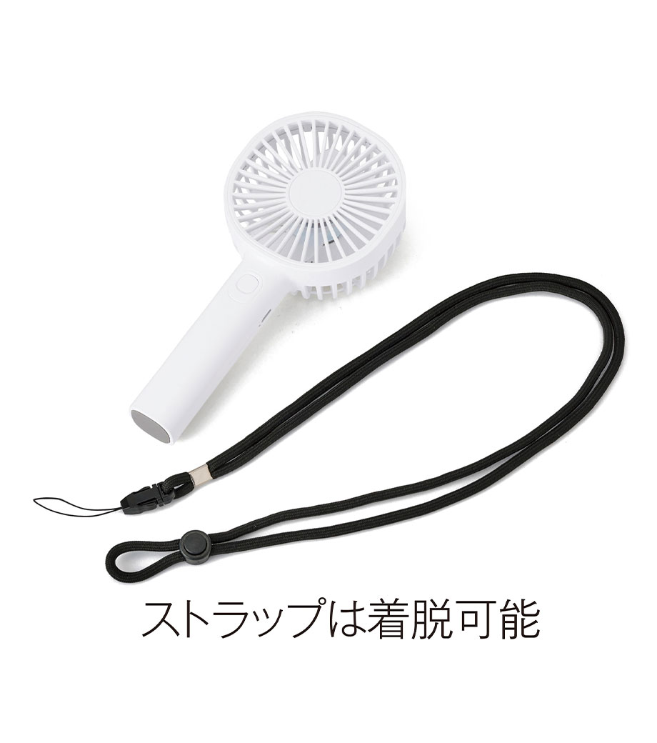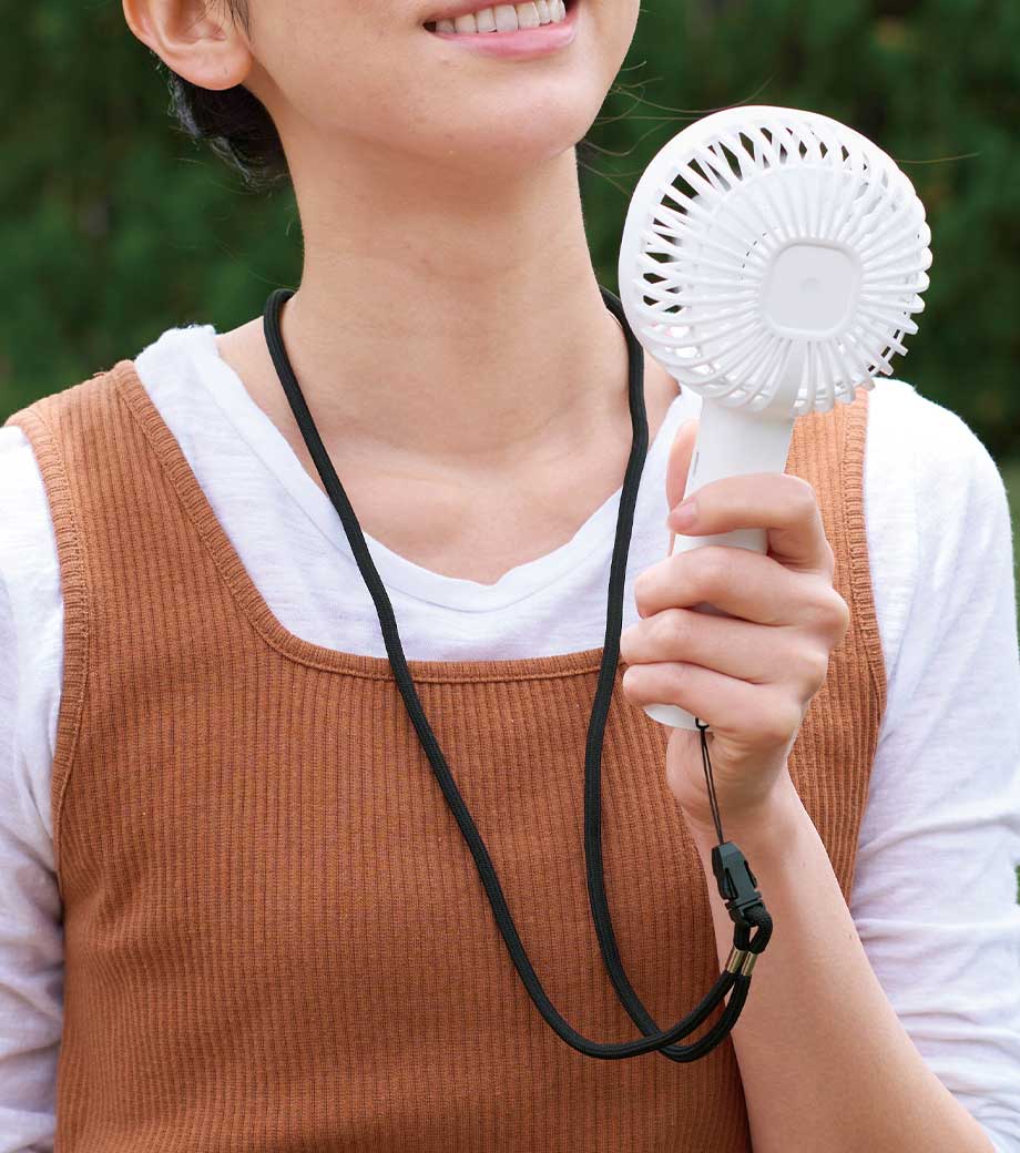 ストラップを付けて首から下げればハンズフリーに!持ち運びハンディファンにもなります。誤作動防止としてスイッチは2度押しで起動する安心設計。