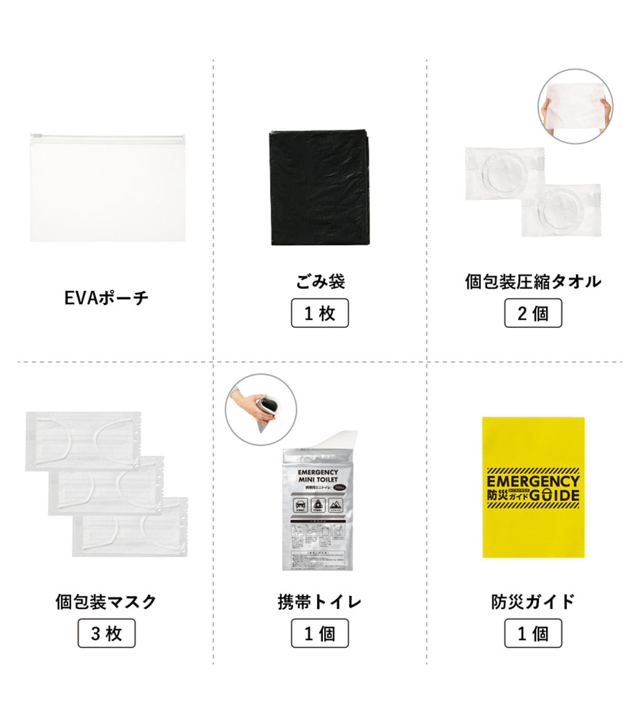 健康&衛生管理に着目した6つのアイテムが給水ボトルにひとまとめになっている防災セットです。