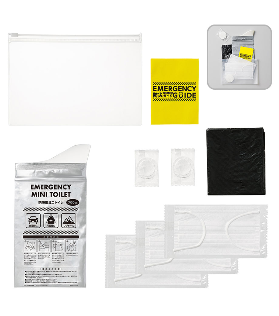 中身が見える給水ボトルに入った防災セットです。携帯トイレやライトなど、実用的なアイテムが7点入っています。災害時だけでなく、車内に入れておくといざという時に安心。コンパクトなので、学校や会社での備蓄品としてもおすすめです。