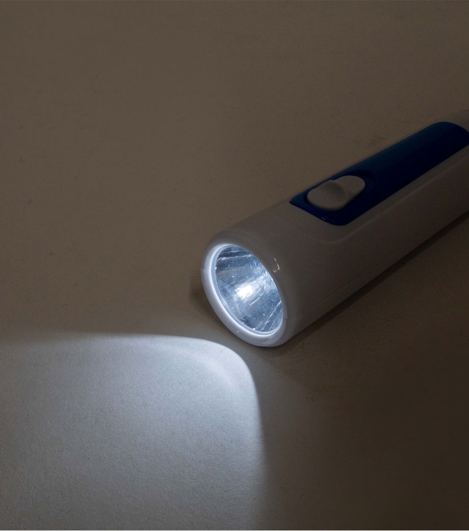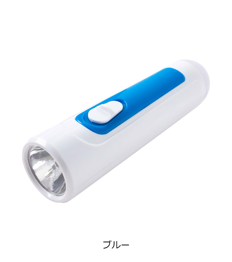 1色印刷でスイッチの横に名入れができます。化粧箱入りでコンパクトなので、配布しやすい。ブルーとグレーの2色取混ぜでお届けします。防災関連のイベントやセミナーの参加特典にいかがですか。