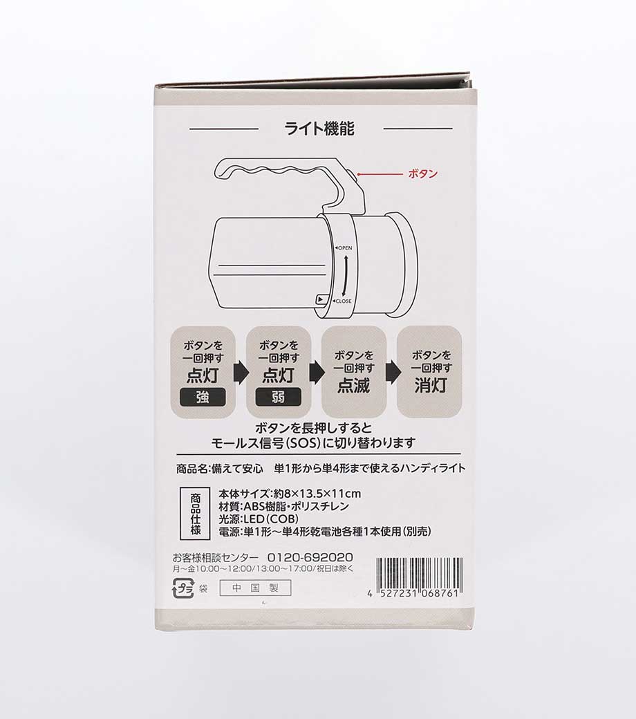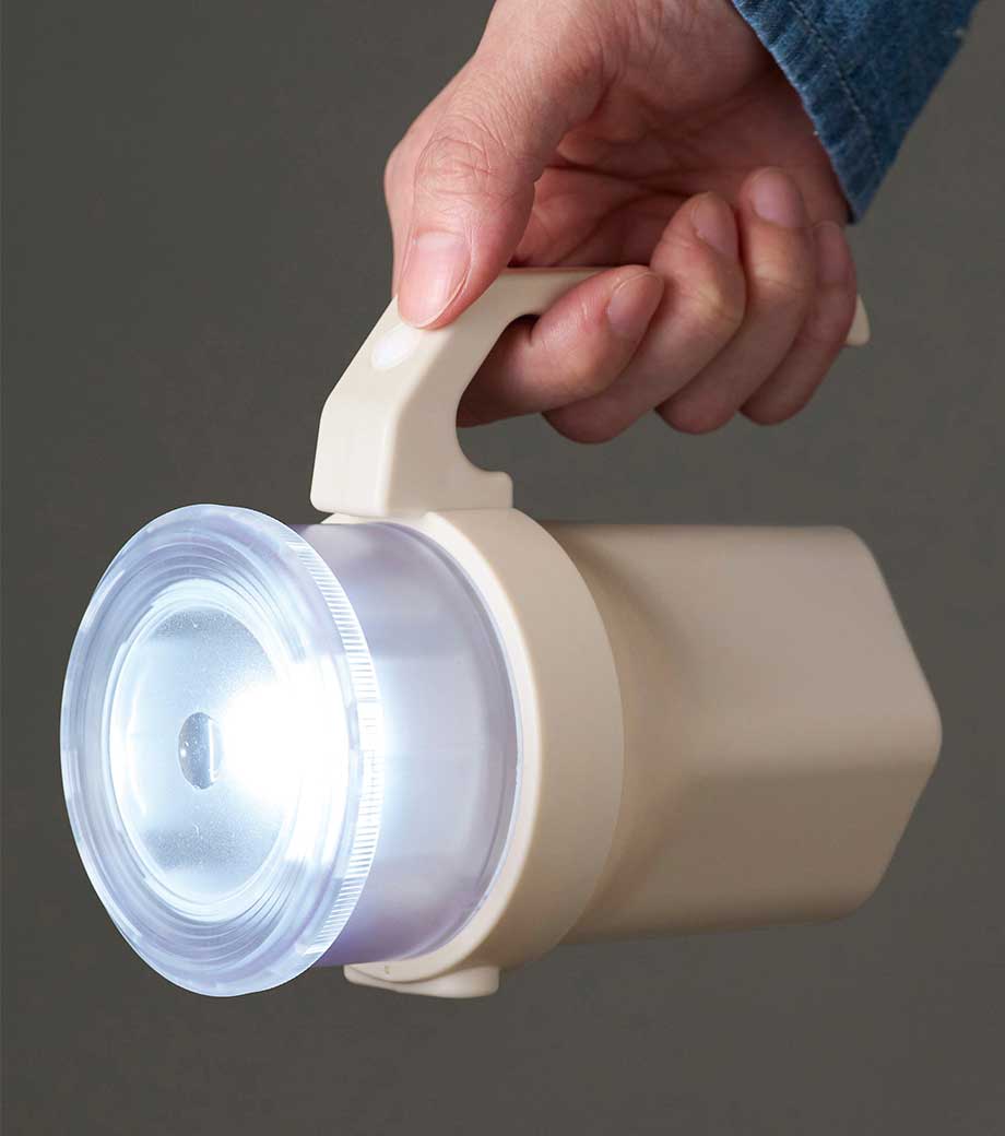 本体の上部を上に延ばすだけでランタンが点灯。懐中電灯使用時はスイッチでON/OFFを切り替えられます。取り外し可能な取っ手は、用途に応じて付け替え可能。コンパクトで軽いので、持ち運びも楽ちん!いつでもどこでもしっかり明るく照らしてくれます。