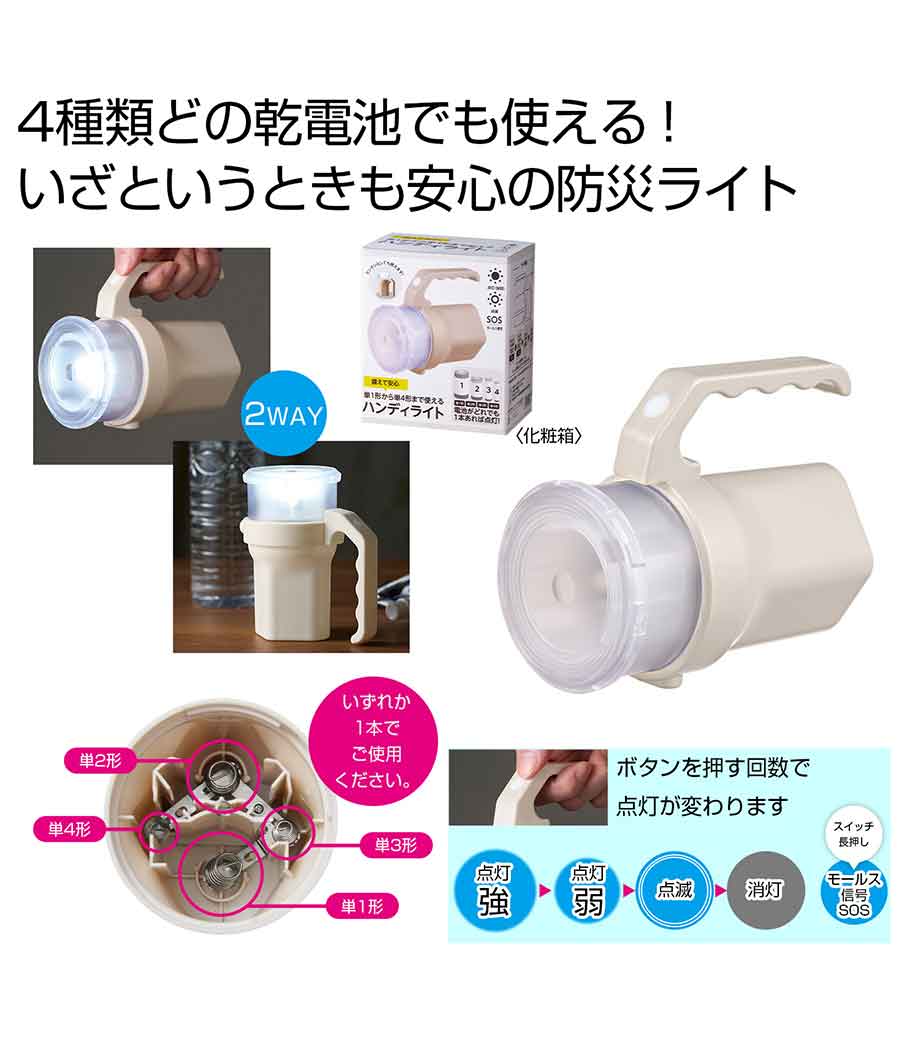 スタンド・ハンディ・ランタンの3WAYマルチライトです。側面のライトは、机の上で手元を照らす時や、ランタンのように吊り下げた時に照らしたい角度を調節できます。ハンディタイプは懐中電灯として使用可能。災害時などの暗い中の移動でも安心です。乾電池式で、充電切れの心配がありません。