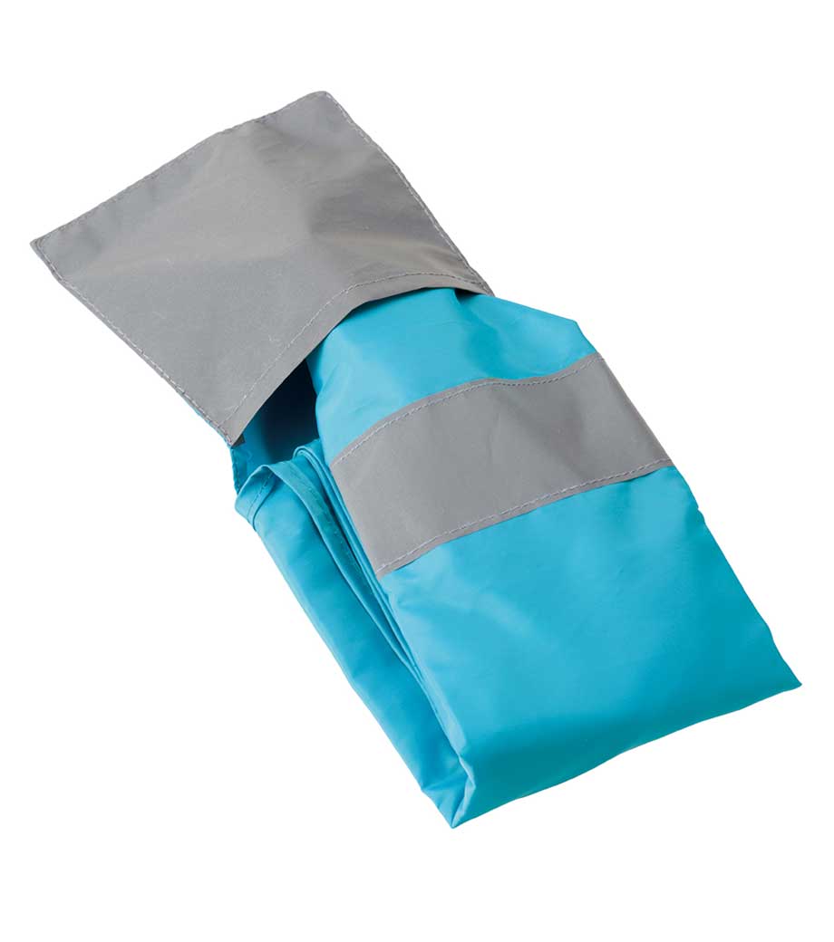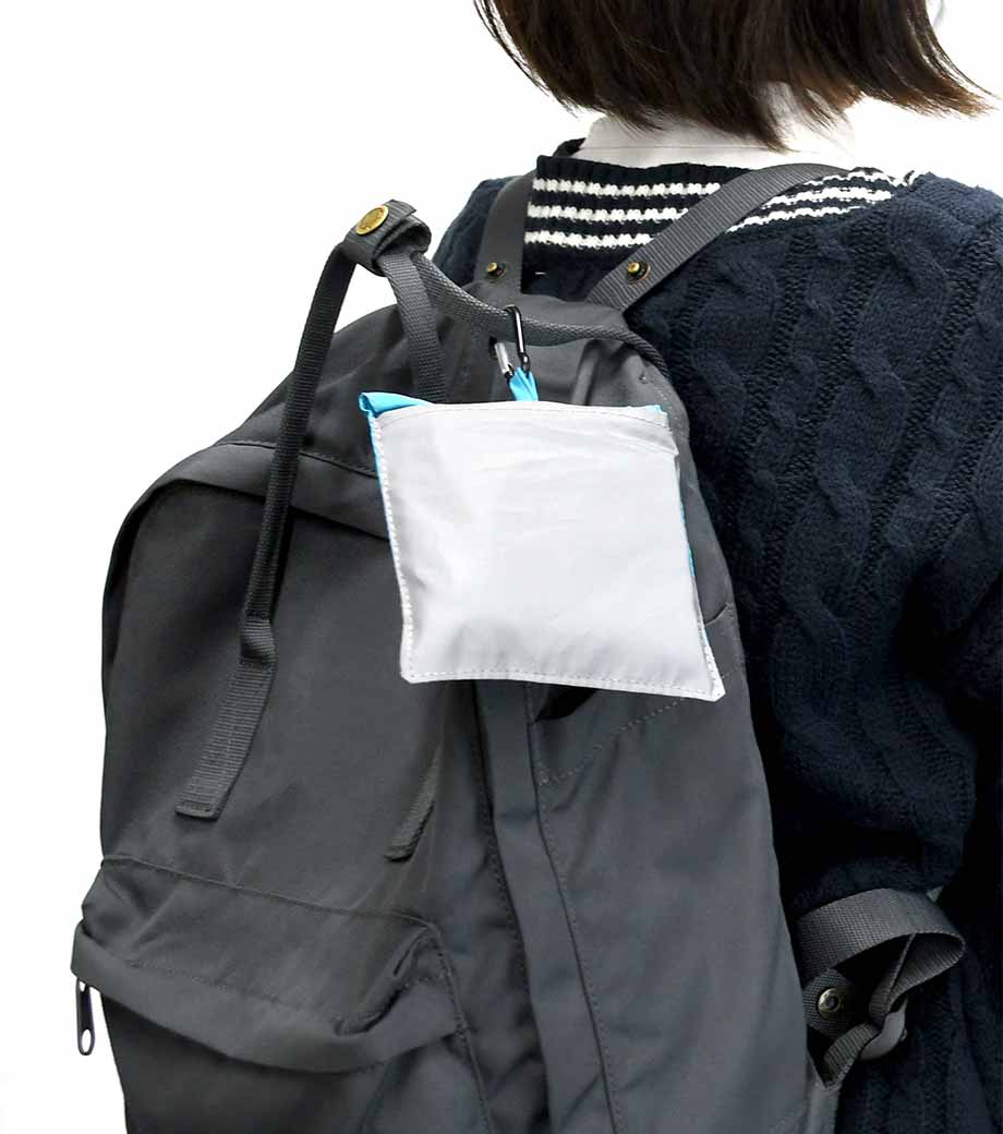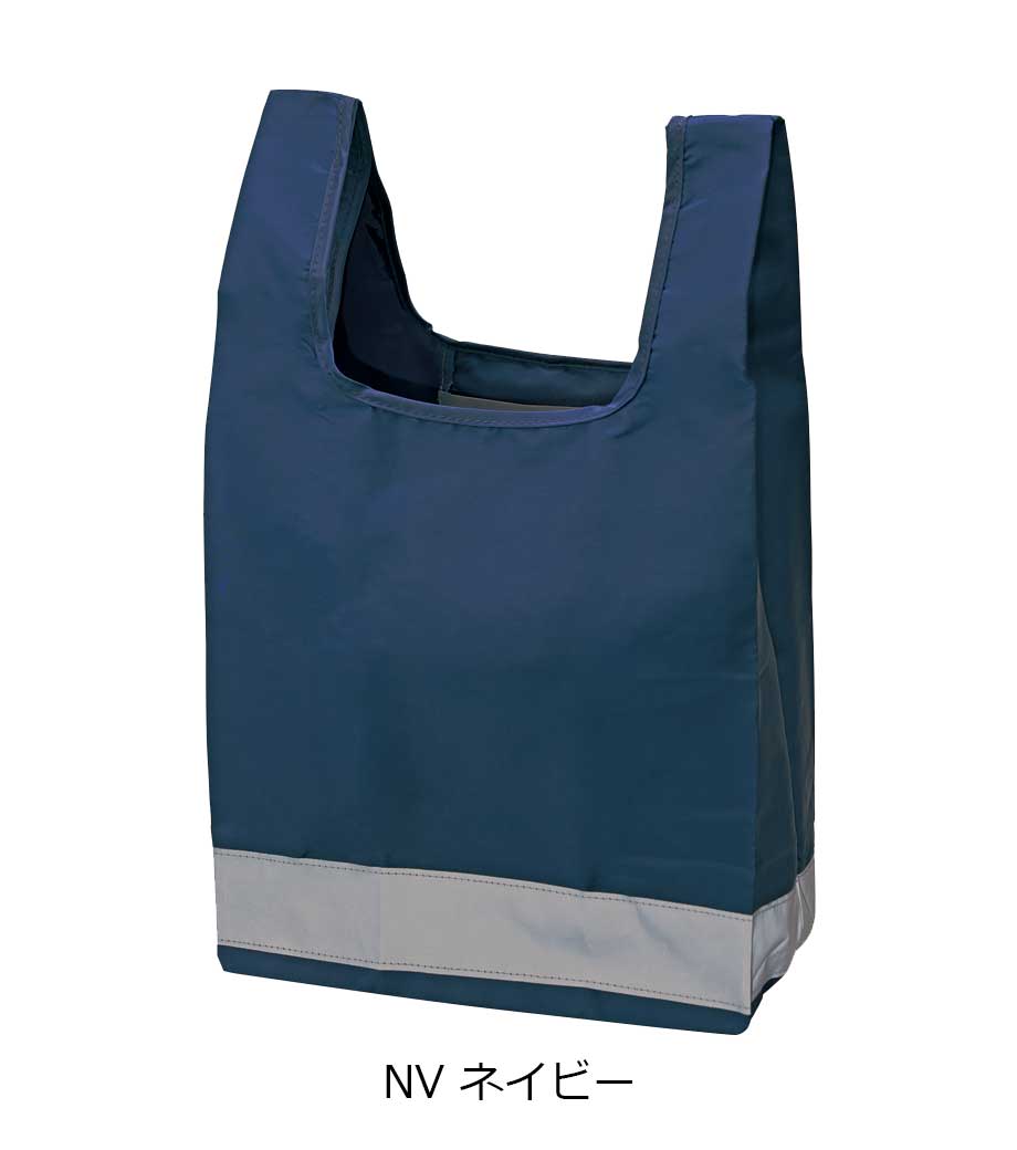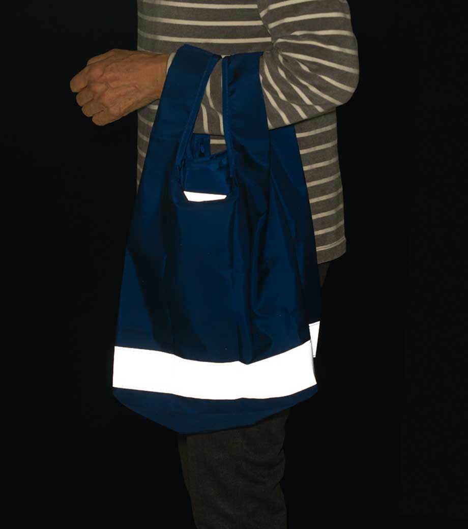 バンド部分がリフレクターになっている折りたたみエコバッグです。ライトに反射して光るので、夜道でも車やバイクなどに存在を認識してもらいやすくなります。リュックなどに提げられるフック付き。