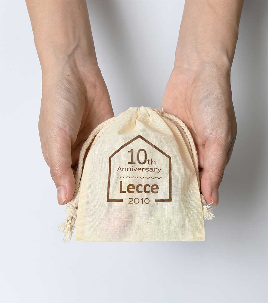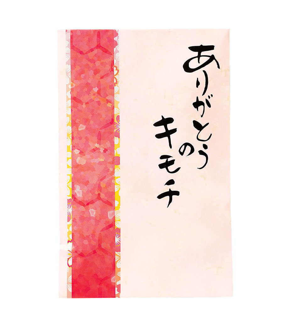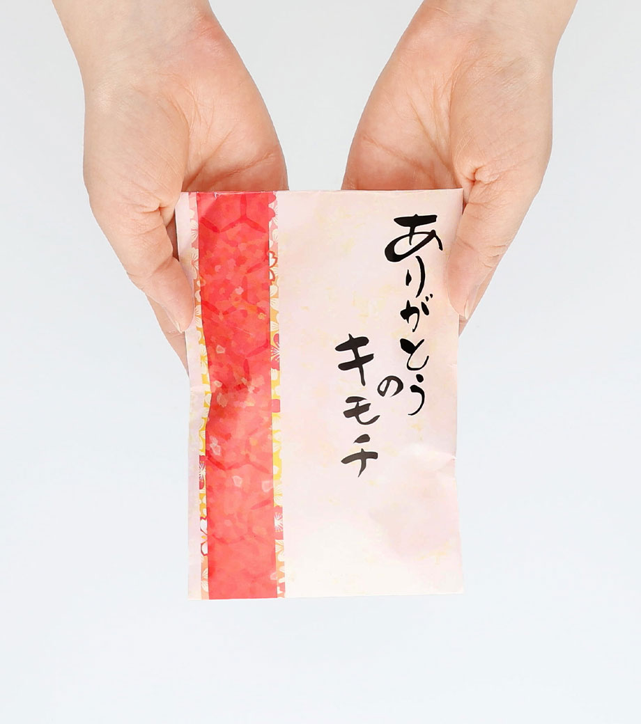 風呂敷に包まれたプリントが施されているパッケージはまさに贈り物。名刺やショップカードが差し込める仕様になっています。パッケージに書かれた「感謝双喜」の双喜は「感謝と共に、二重の喜び(慶事)が訪れることを願っています」という意味。来店記念や大切なお客様への挨拶品として喜ばれること間違いなしです。