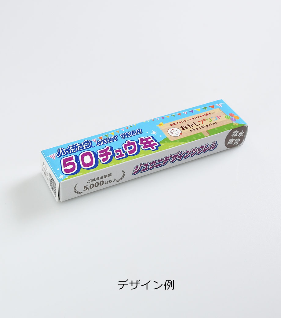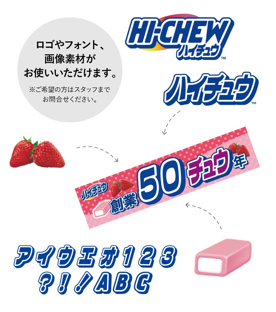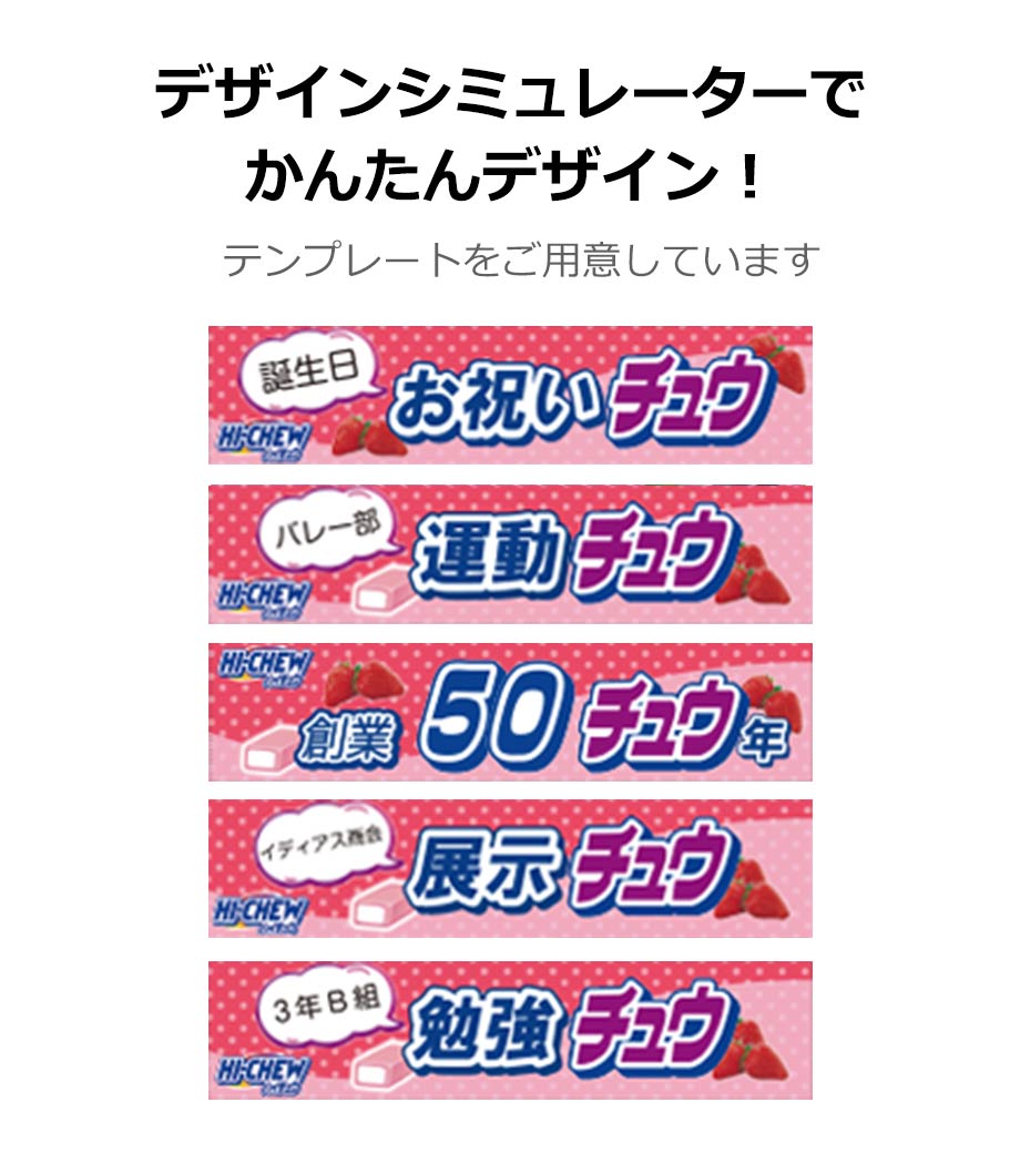 世界30か国以上で愛される森永製菓のソフトキャンディ、ハイチュウ。人気ナンバーワンのグレープ味を、お好きなデザインのパッケージで100個から制作できます。食品のノベルティは受け取ってもらいやすく、有名メーカーのお菓子であれば印象にも残り販促効果も抜群!たくさんのノベルティをもらう展示会などでも他社と差が付くアイテムです。