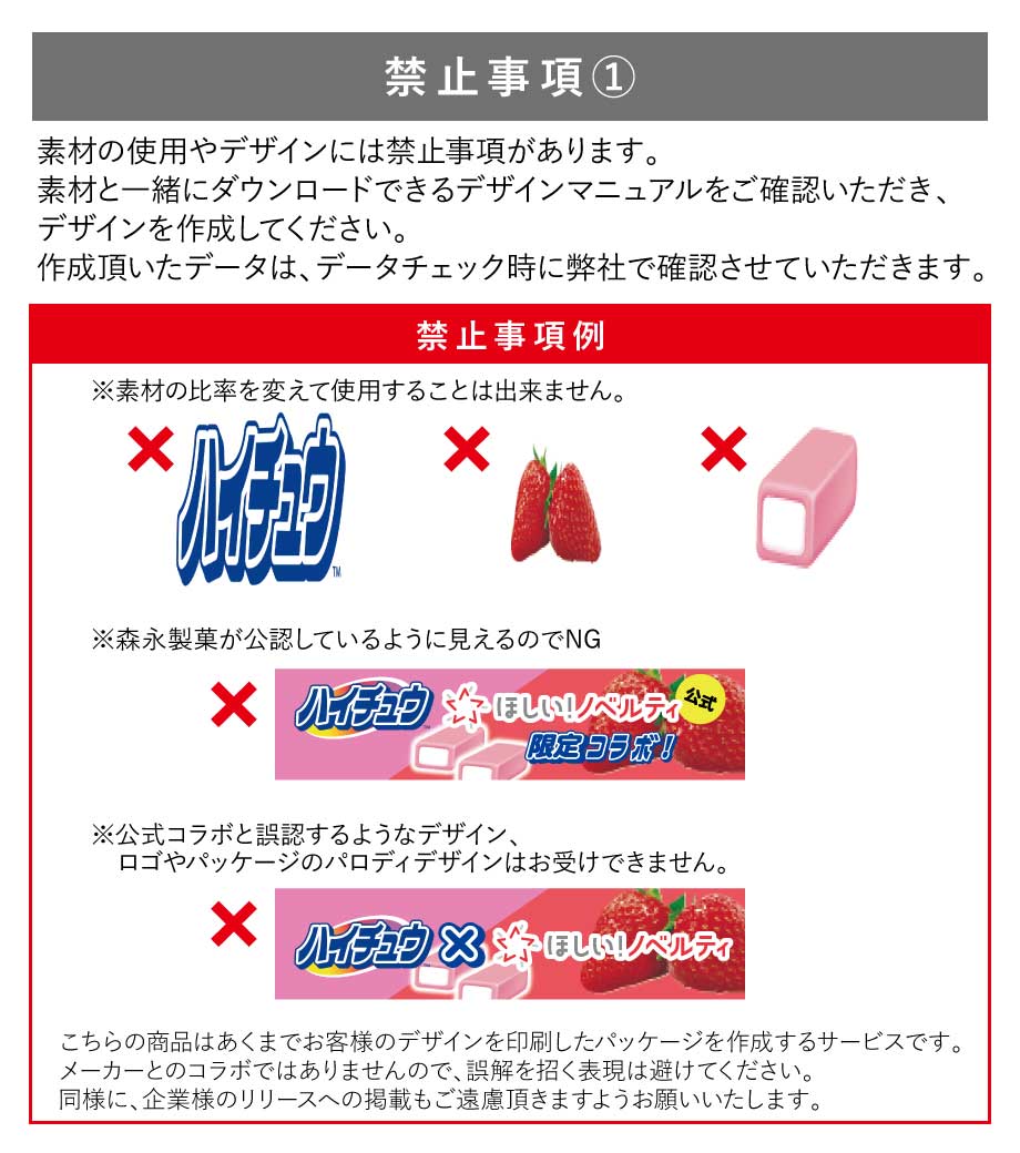 森永製菓の代表商品であるハイチュウで、オリジナルパッケージのノベルティを制作できます。甘酸っぱくてジューシーな味わいのストロベリー味は子供から大人まで大人気のフレーバー。有名メーカーのお菓子ノベルティは話題性抜群!手のひらサイズで配りやすく、ビジネスシーンでの会話のきっかけになります。溶けないお菓子なので、季節を問わず配布できるのも嬉しいですね。